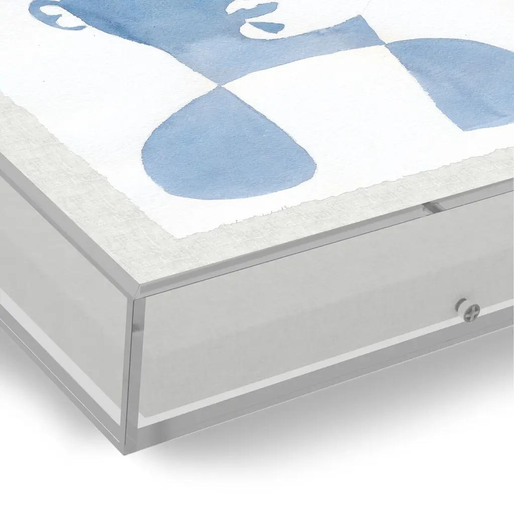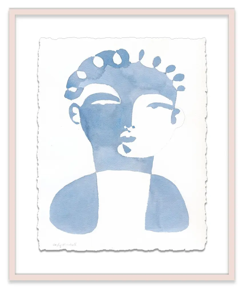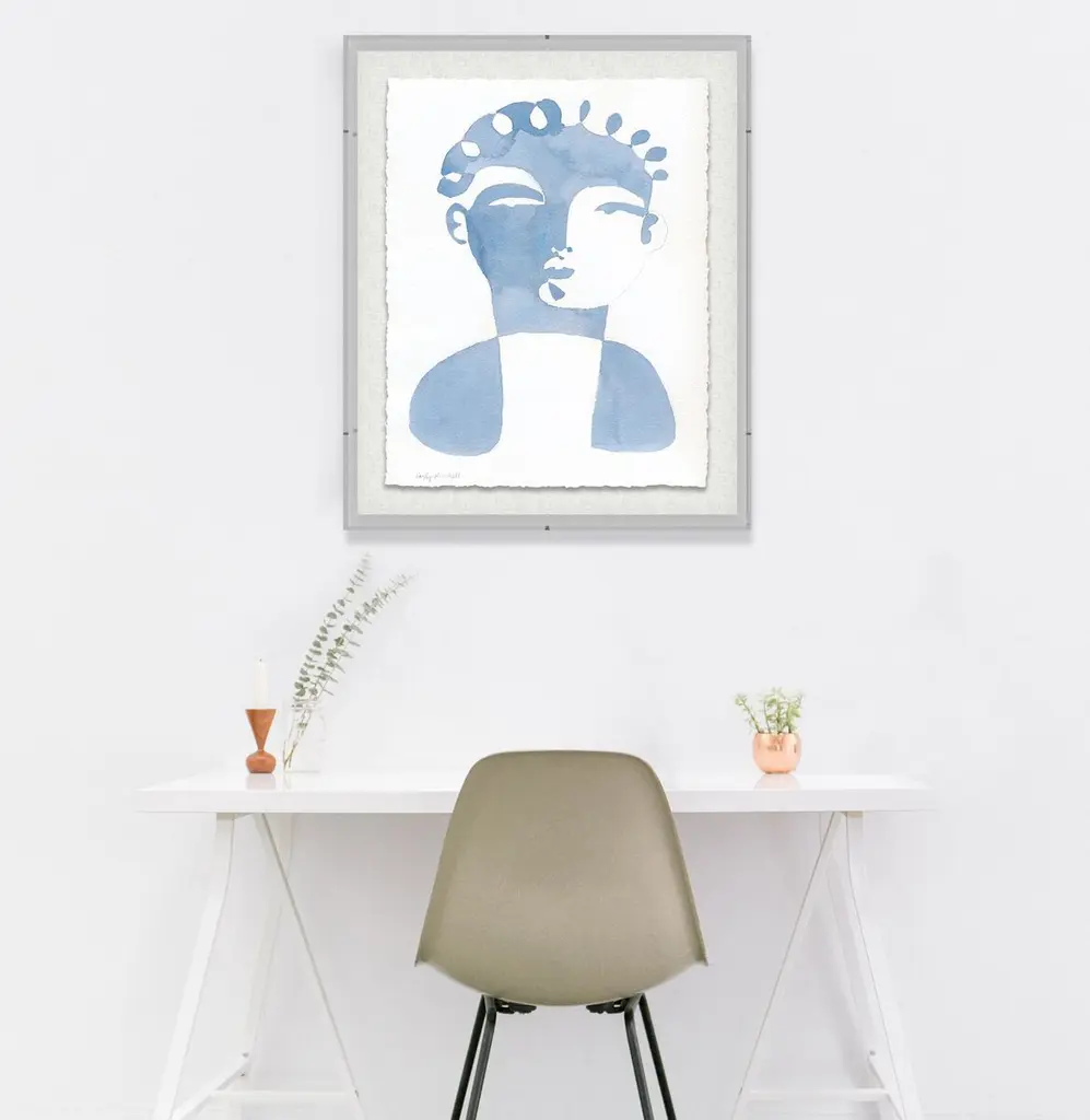 Seen first at One Kings Lane: Here, a faithful reproduction of a Hayley Mitchell painting, defined by its cool coloration and clever use of negative space. Floated on a white mat and set under Plexiglas in a natural pine frame, this piece comes ready to hang.Inspired by powerful woman from all walks of life, Hayley Mitchell portrays their strength and beauty with unique, bold brush strokes, cubist faces, and nude figures. A native Texan, Hayley currently resides in Austin with her four small children.