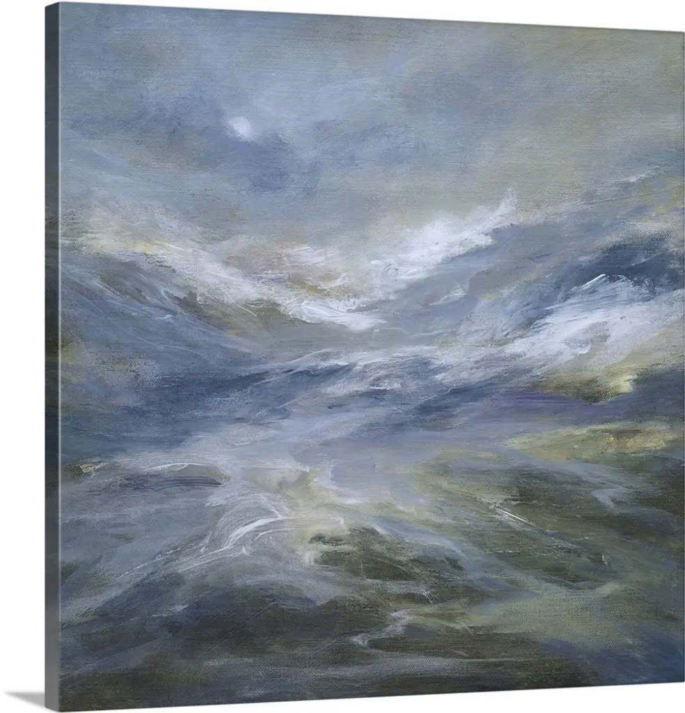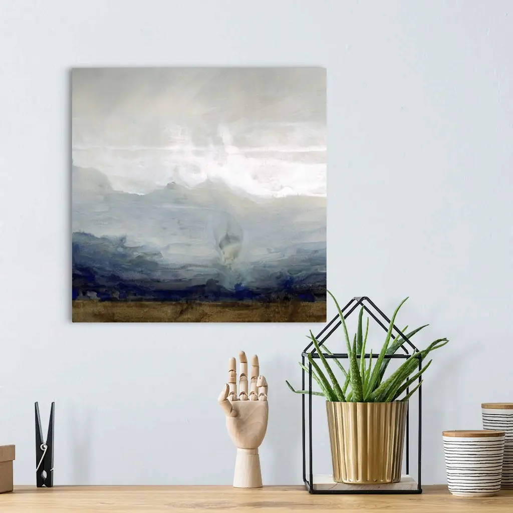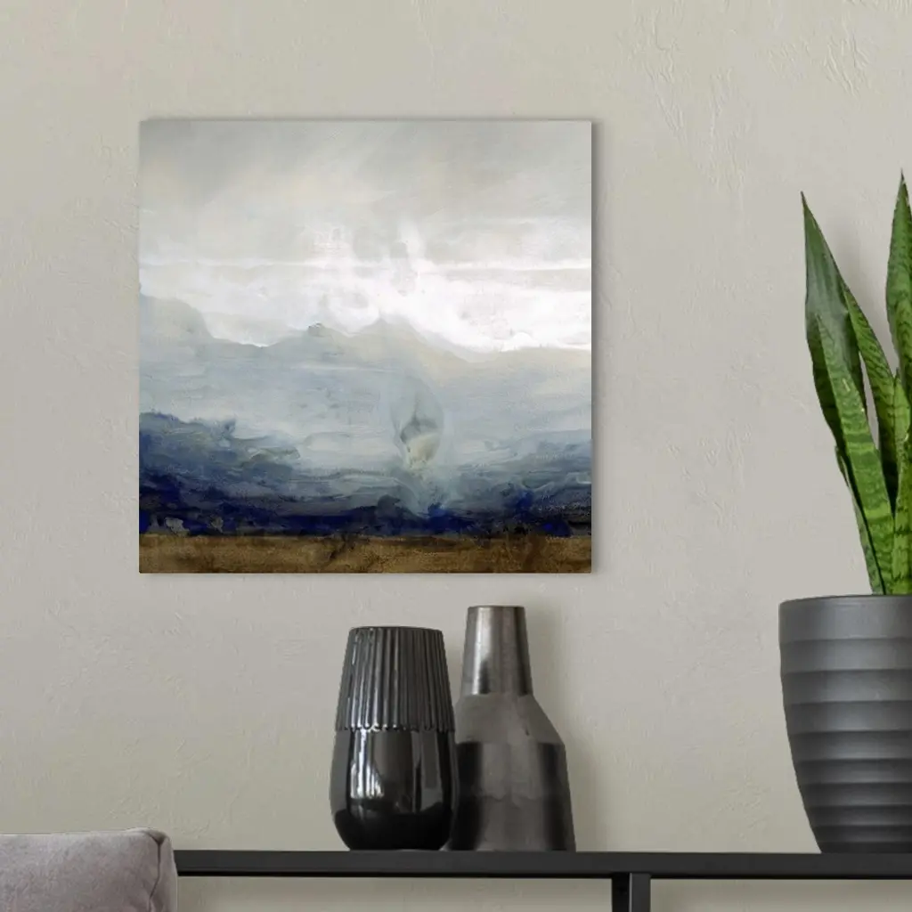 Contemporary painting of a misty landscape with shapes of mountains in the distance.
