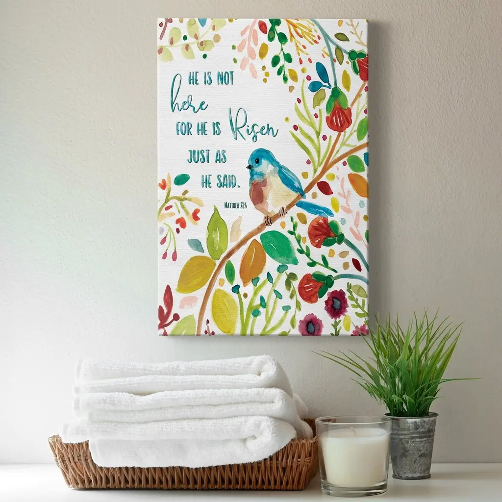 He is Risen Premium Gallery Wrapped Canvas - Ready to Hang A premium hand stretched gallery wrapped canvas print created to last. Featuring a beveled a solid wood stretcher bar, each piece comes ready to hand 5 SIZES AVAILABLE 8''X12'' - Overall Size 16'X20'' - Overall Size 24''x32'' - Overall Size 30''x40'' - Overall Size 36''x48'' - Overall Size Each piece is made to order. Built to Last Each piece comes ready to hang Solid wood stretcher Fade and Water resistant Made domestically