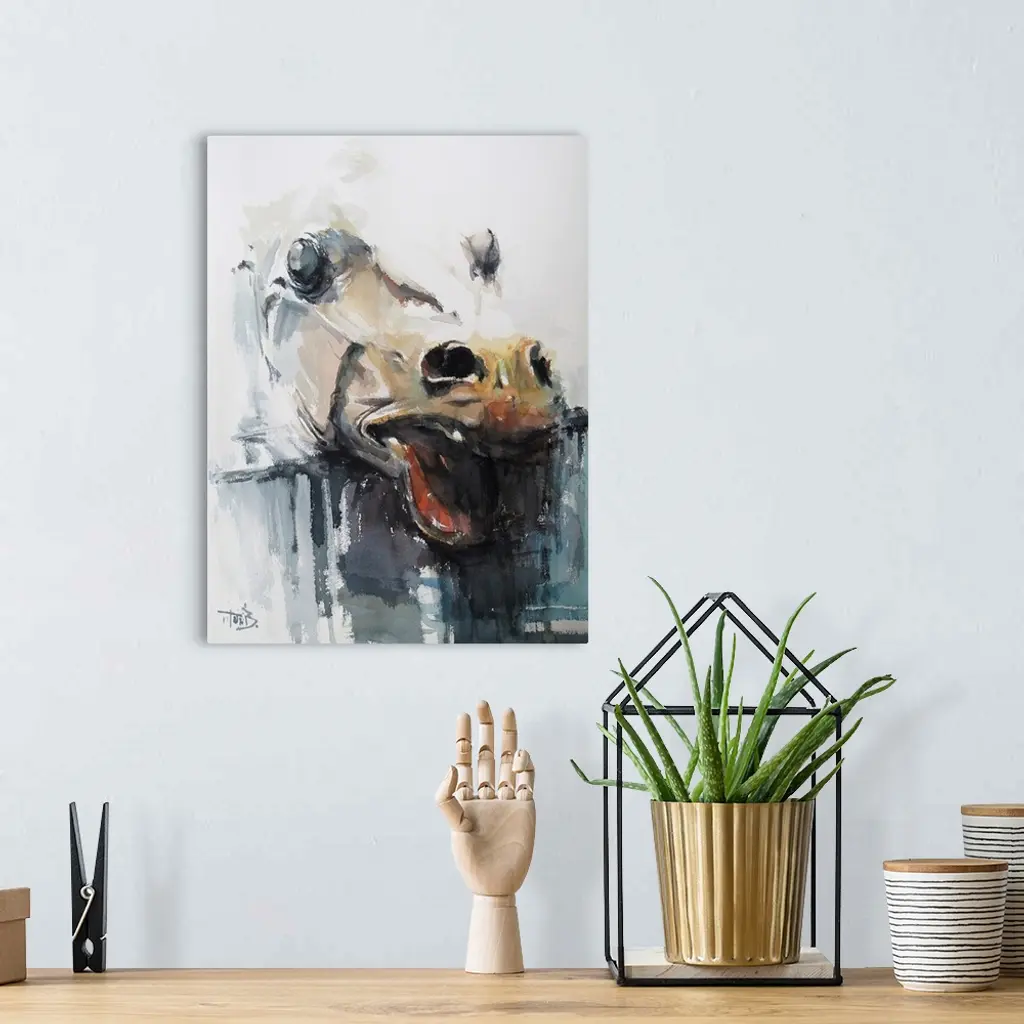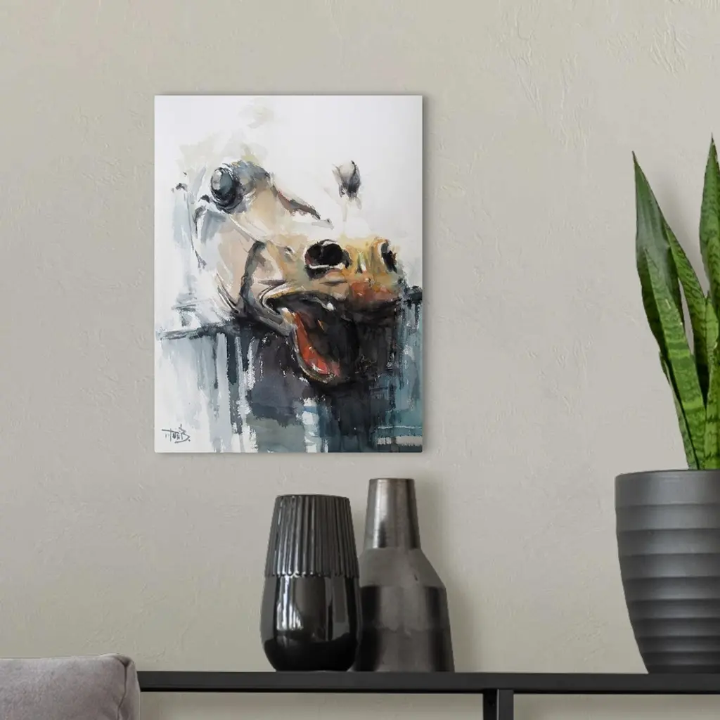 This contemporary artwork features expressive emotion with fragmentary brush strokes and robust colors. This horse's head is based on the horse of Selene, from the Parthenon Frieze.