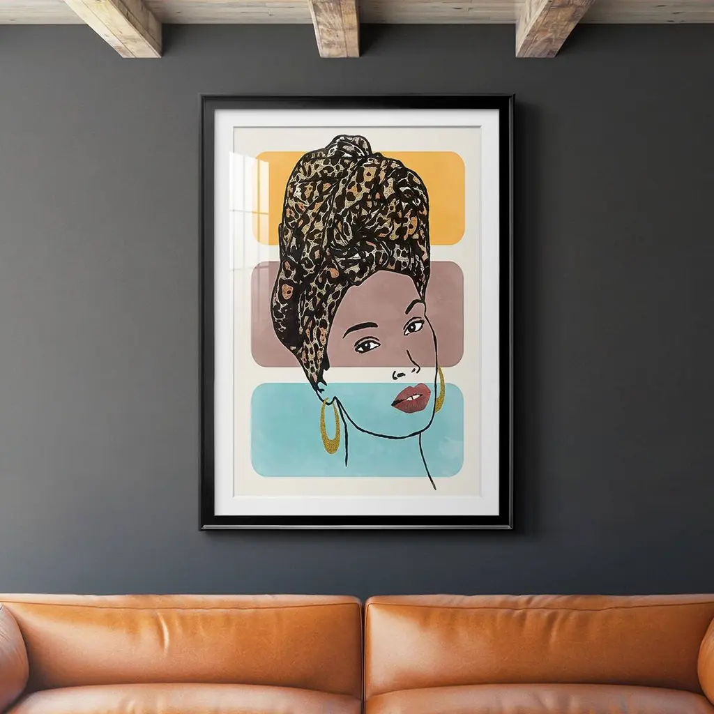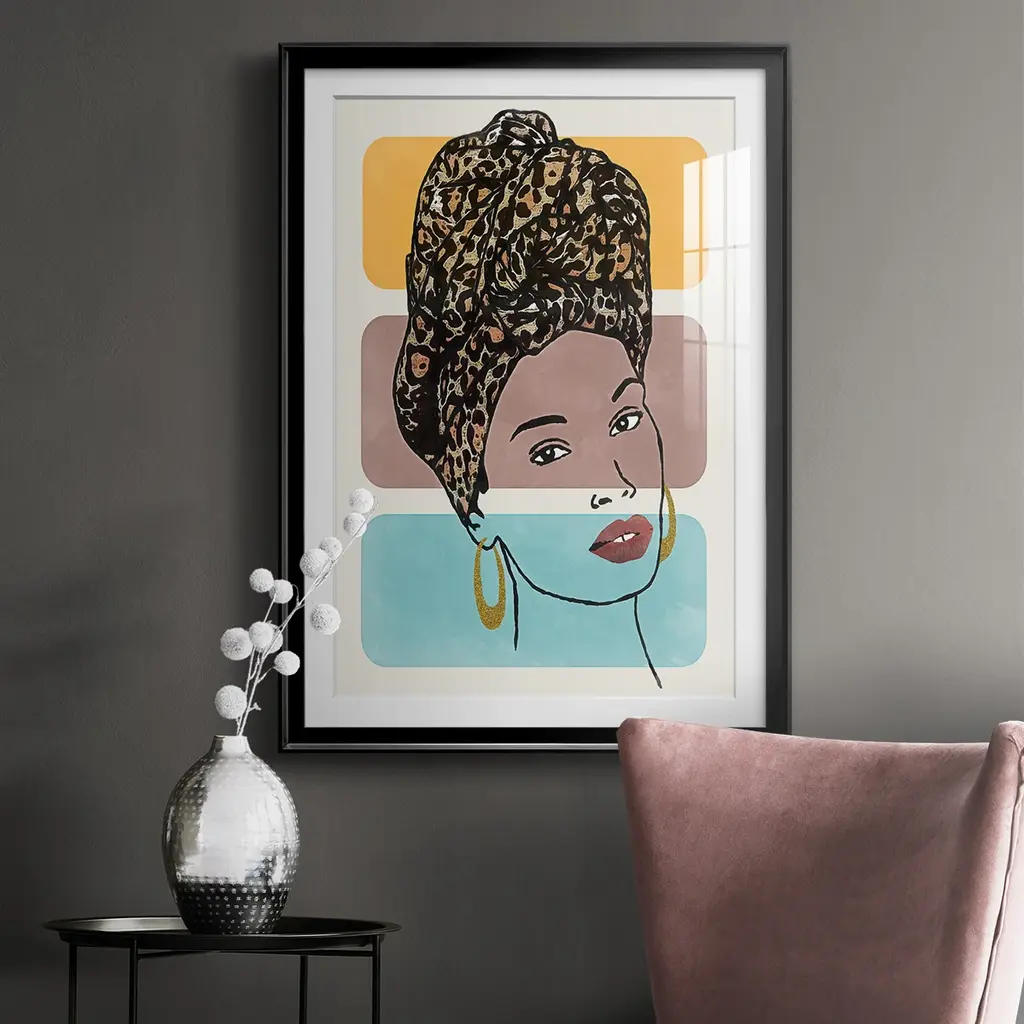 Head Wrap I Premium Framed Print - Ready to Hang A Premium Framed Print created to last. Framed in distressed wood and available in an array of sizes and colors Featuring a beveled a solid wood stretcher bar, each piece comes ready to hand 4 SIZES AVAILABLE 30.5''X42.5'' - Overall Size 26.5'X36.5'' - Overall Size 22.5''x30.5'' - Overall Size 18.5''x24.5'' - Overall Size Each piece is made to order. Each piece comes with hanging hardware. Made in the USA Ready to Hang Giclee Paper Print Acrylic Glass Beveled Matt Board