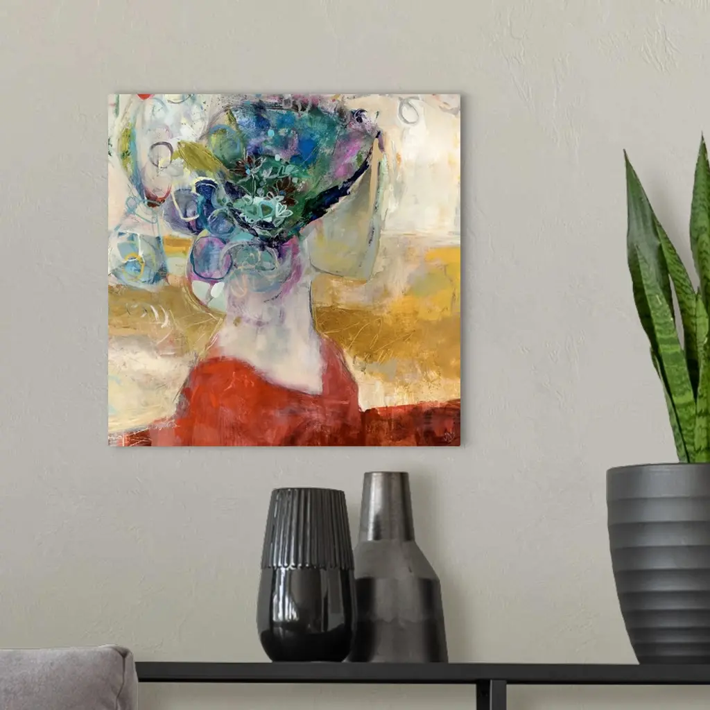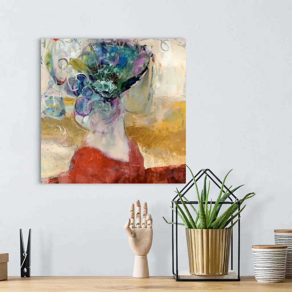 Square, giant abstract painting of a human figure bust, their head and face covered by a large, decorative, detailed headdress in multiple colors. On a background of various brushstrokes and shapes in numerous colors.