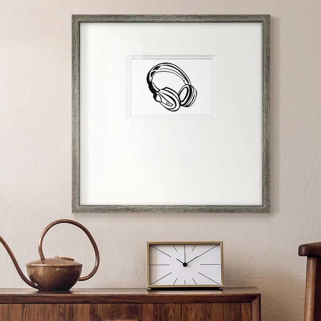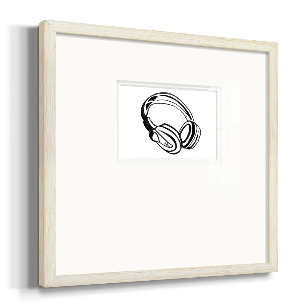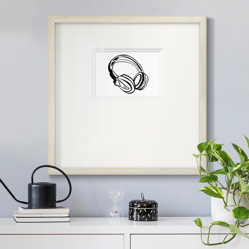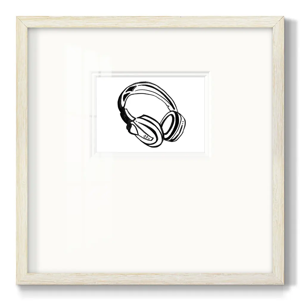 Headphones SketchPremium Framed Print A framed cold pressed paper print featuring superior double matting and quality frame. 2 SIZES AVAILABLE 16''X16''' - Overall Size 20''X20''' - Overall Size Each piece is made to order. Each piece comes with hanging hardware. Made in the USA Ready to Hang Giclee Paper Print Plexiglass Beveled Matt Board Double Matte Board