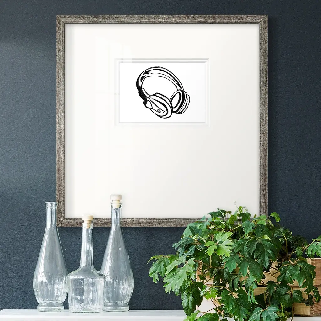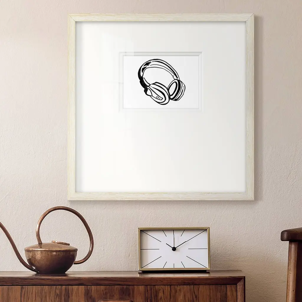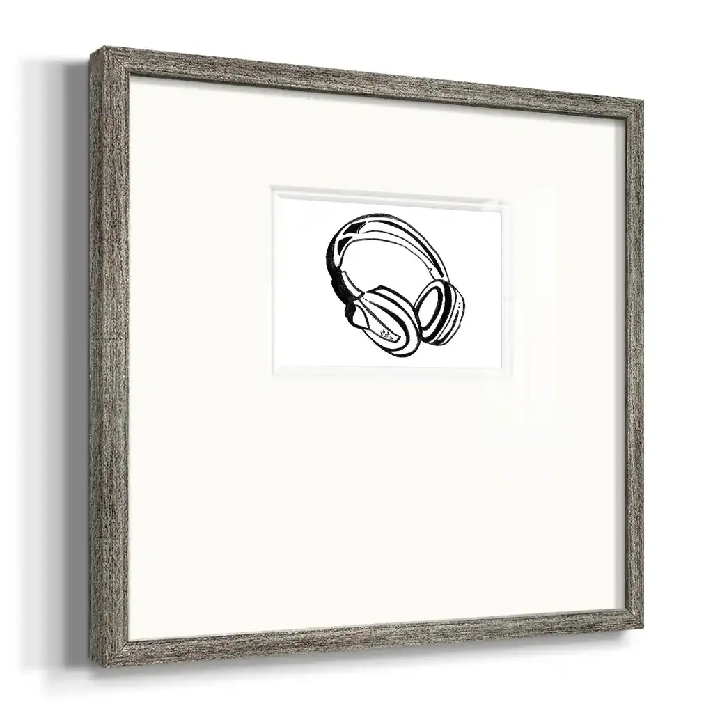 Headphones SketchPremium Framed Print A framed cold pressed paper print featuring superior double matting and quality frame. 2 SIZES AVAILABLE 16''X16''' - Overall Size 20''X20''' - Overall Size Each piece is made to order. Each piece comes with hanging hardware. Made in the USA Ready to Hang Giclee Paper Print Plexiglass Beveled Matt Board Double Matte Board