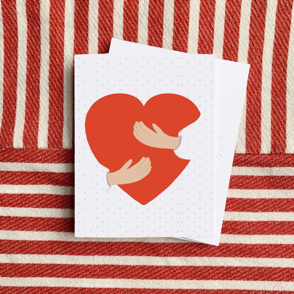 This 8-pack of greeting cards is elegantly illustrated by artist Ingrid Ramus, founder and owner of the Ramus & Co brand. Artwork features arms hugging a heart. All greeting cards are made in the USA on heavyweight uncoated and locally-sourced and manufactured card stock. Each card is accompanied by a hand-embossed envelope made with heavyweight 95lb paper and a peel-and-stick flap - no licking envelopes here! All Ramus & Co. greeting cards are printed on FSC and SFI certified paper sourced from a regional mill that harnesses 66% of its energy from on-site sustainable sources, such as emission-free hydroelectricity and biomass co-generation from wood waste. All 8 greeting cards come packaged as a boxed set. Husband-and-wife team Calvin and Ingrid Ramus founded Ramus & Company in 2019, in New England, USA. Ingrid, the creative designer behind the brand, originates from Mexico, where she cultivated her skills in fashion and textile design. Drawing from her unique and inquisitive perspective on preppy style, Ingrid prolifically designs whimsical yet classic stationery and lifestyle items.