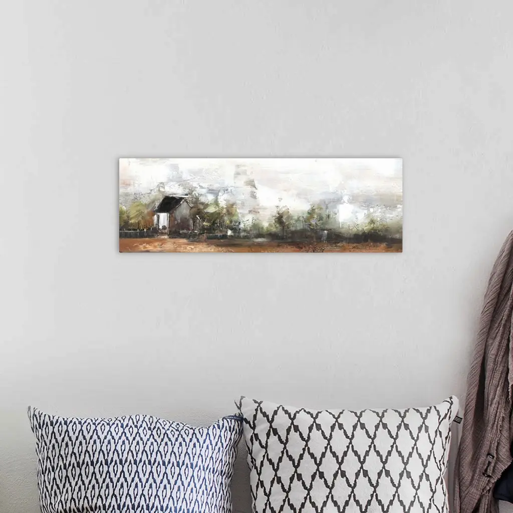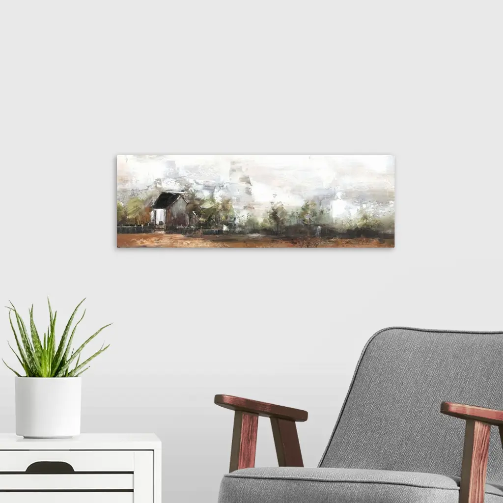 Contemporary artwork lone house standing a countryside field.