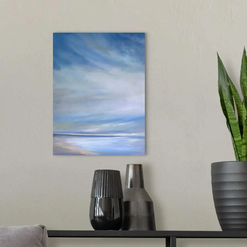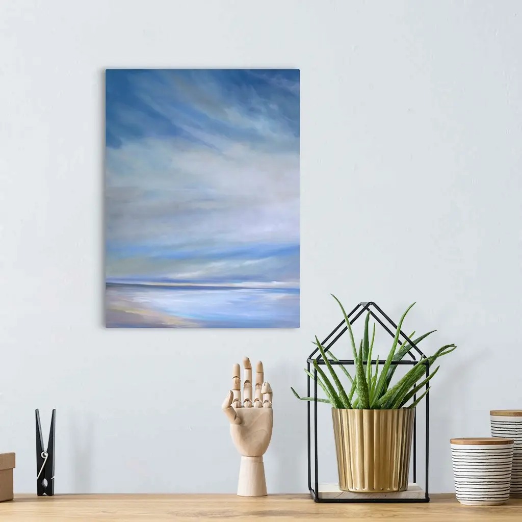 Contemporary painting of a seascape with soft light streaming through the clouds.