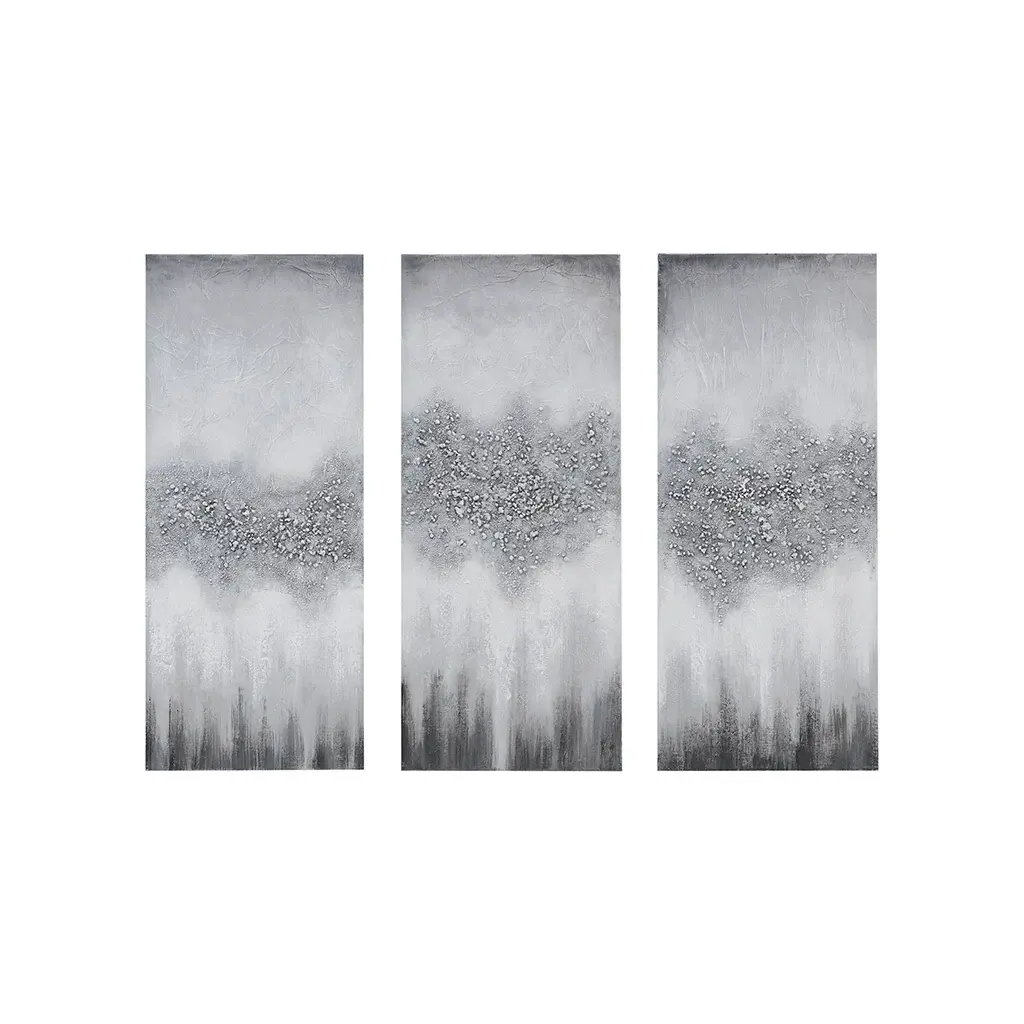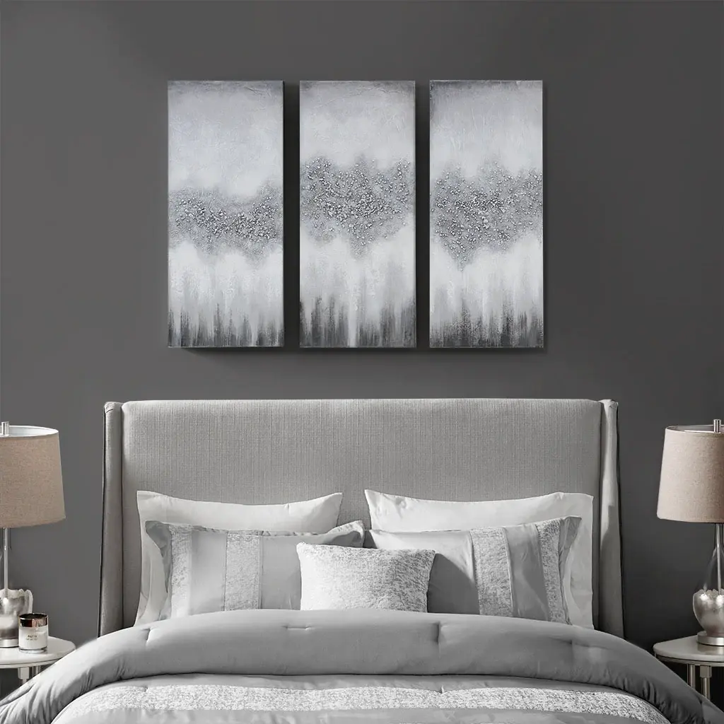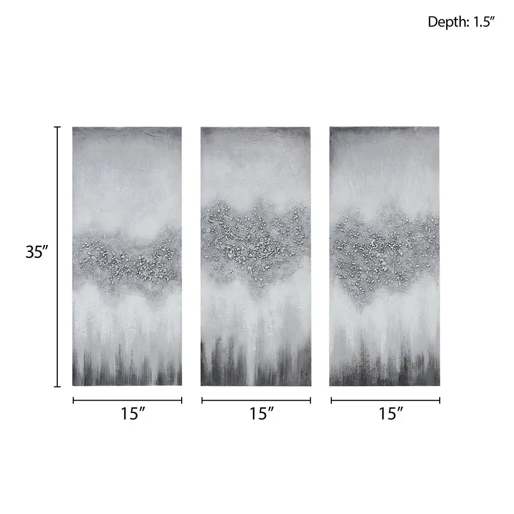 Description Accent your space with the contemporary allure of our Madison Park Luminous Heavily Embellished 3-piece Canvas Wall Art Set. 100% hand-painted, this canvas wall art set showcases rich grey and black ascending shades to create a deep ombre abstract look. Natural rock and stone embellishment on each canvas create beautiful texture and dimension, while a glitter finish adds a rich sheen and luster. Each piece measures 15x35" and also features 2 D-rings on reverse making it easy to hang, while an MDF backing provides additional support and structure. Hang this three piece hand-painted canvas set in your living room, dining room, or entry way to bring a chic modern sparkle to any space. Due to hand embellishment of natural rock and stone; colors and glitz may vary slightly from image making each piece unique. Product Details See below 3 Pieces:15"W x 35"H x 1.5"D (3) Material MDF: 90% Canvas: 10%