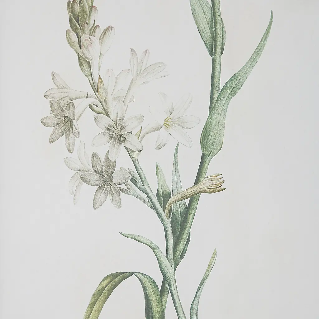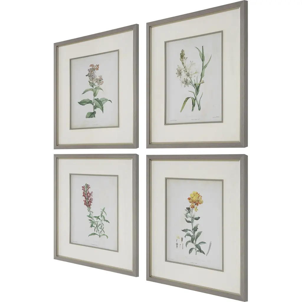 These antique blooms have been freshened up with beautiful gray toned frames and matching fillets. Surrounded by an ivory linen mat. Each print is placed under protective glass. Artwork by de langlois.