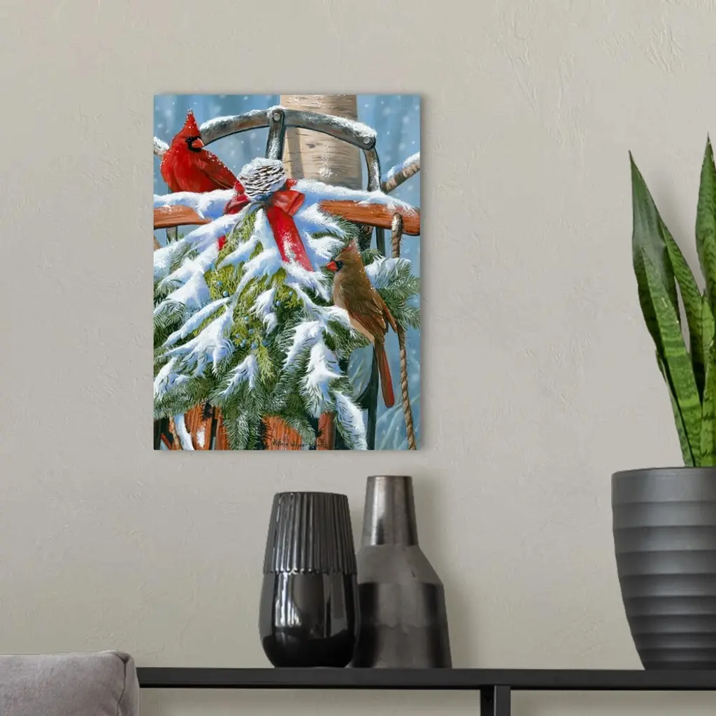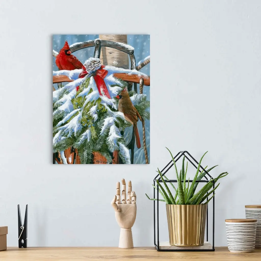 This large artwork piece shows two cardinals standing in a snow covered wreath that covers an old fashioned sled.