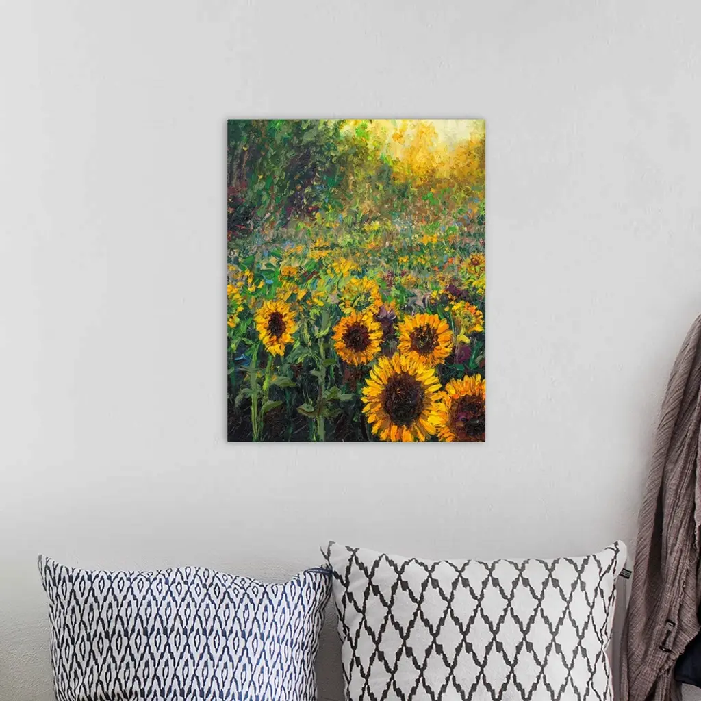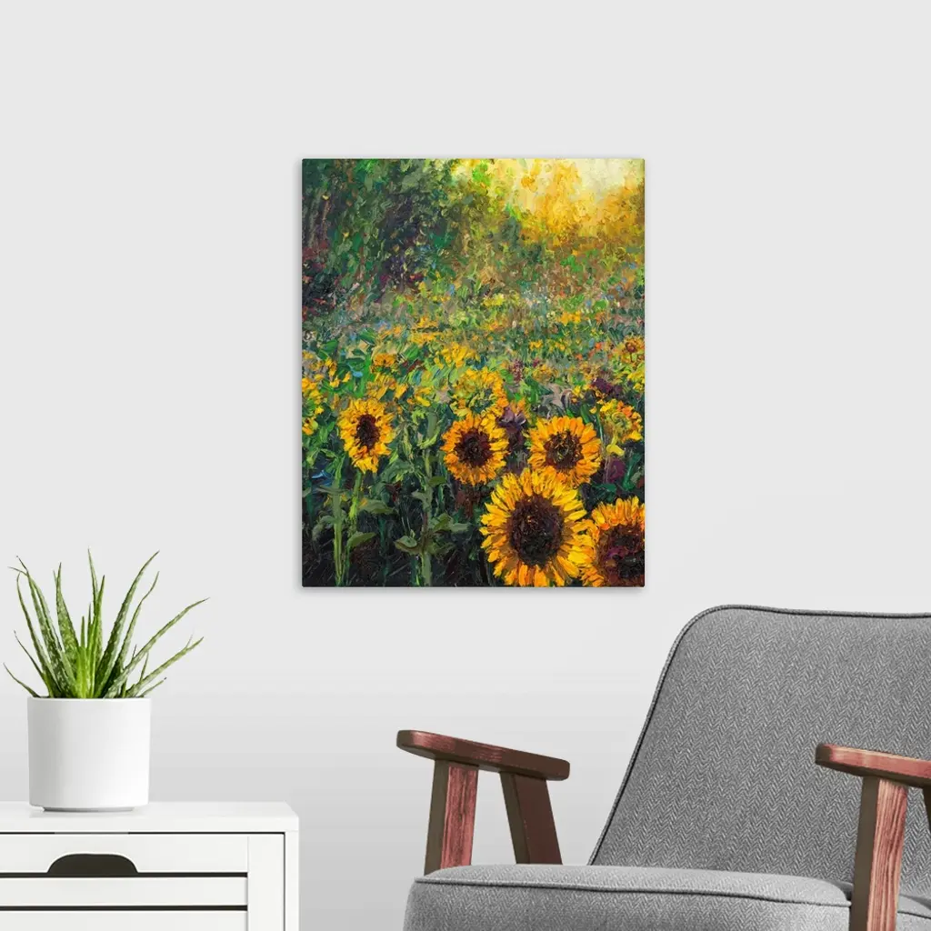 Brightly colored contemporary artwork of a field of sunflowers.