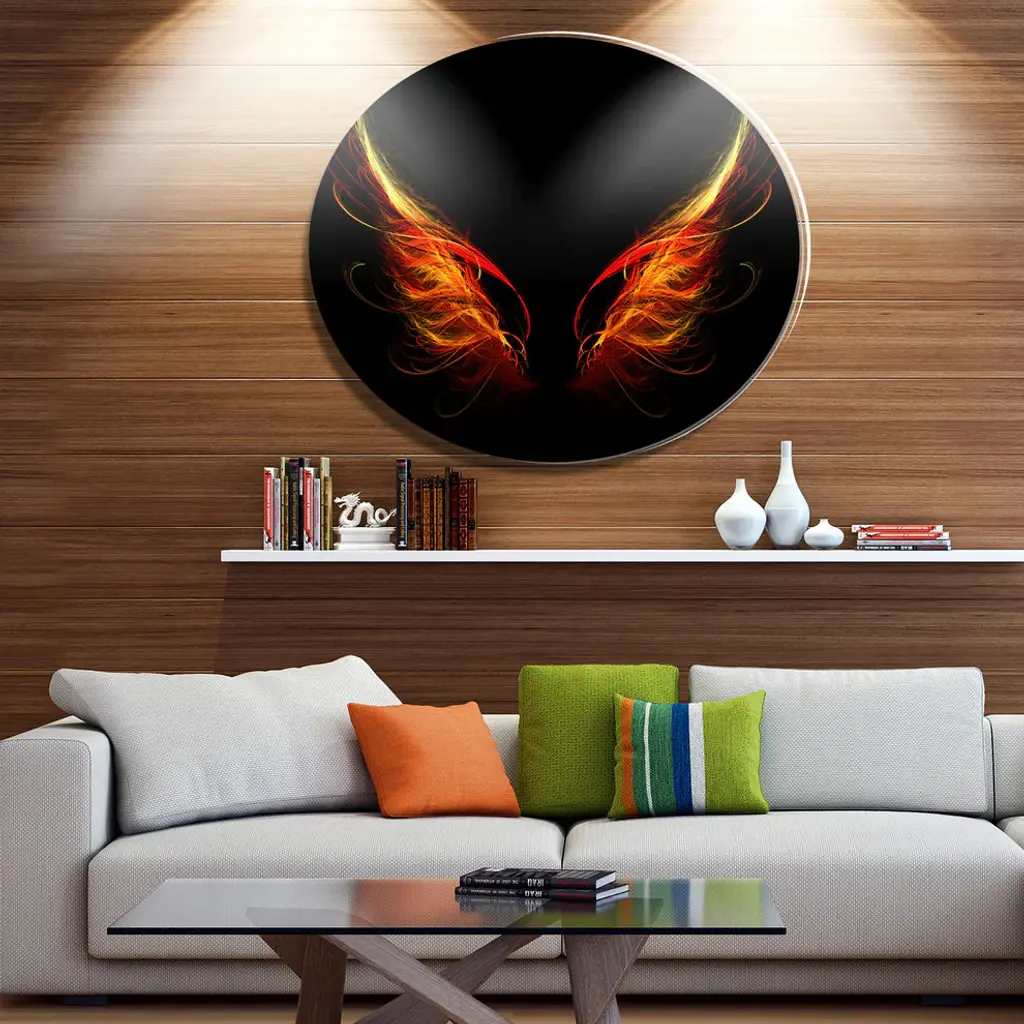 Bring Contemporary Abstraction to your home with this large Circle Metal wall art. This Hell Wings on Black Background Metal Artwork makes it the focal point of any room or office. - White Gloss Coating ensures colors are extra vibrant with light reflection.- Aluminum grade Sheet Metal with 1 inch mounting frame on the back giving the illusion that the artwork is floating on the wall..- Mounting Brackets are included along with instructions.- High Quality Digital images are created directly into a glossy aluminum panel producing a stunning and captivating print into the glossy finish of the metal.- Water, Fire and Scratch resistant HD Aluminum panels.- Looks better than any photo paper and guaranteed to last at least 20 years- Easy to clean with a microfiber cloth. Colors are far superior to regular Canvas Art. - Easy to Hang