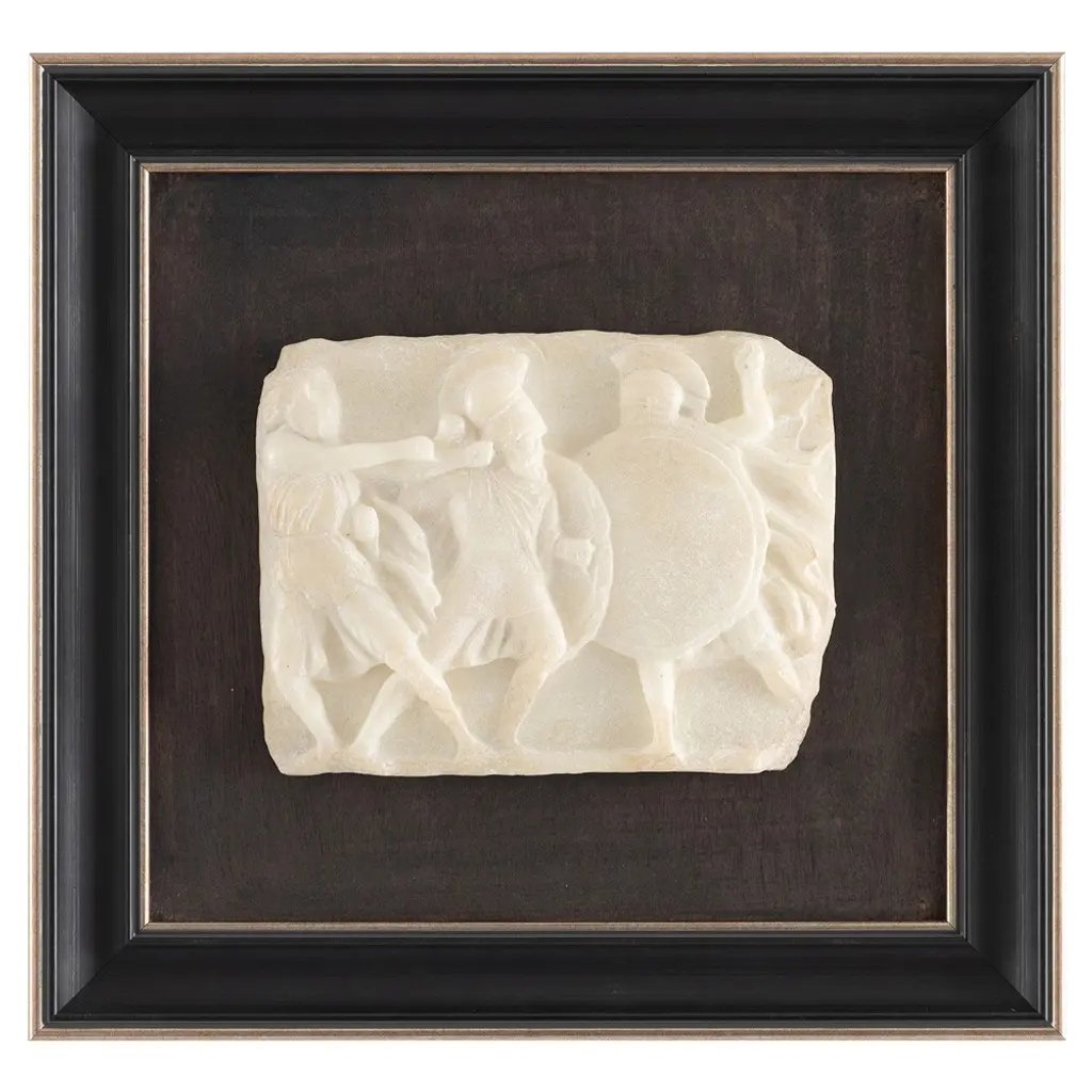 The Hellenistic Relief Wall Art is a timeless tribute to the artistic mastery of ancient craftsmen. A fragmented composite relief captures several robed figures in striking detail. The silver frame with matching silver fillet is complemented by the deep blacks of the molding and backdrop, enhancing the piece with a dramatic presence.