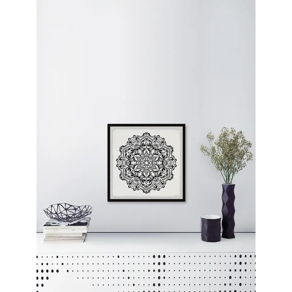 Artist: Hello AngelSubject: Graphic IllustrationStyle: ContemporaryProduct Type: Wood Frame, Black Mat, AcrylicMade in USAThis ready to hang, matted framed art piece features a mandala of floral and abstract designs.Angelea Van Dam aka 'Hello Angel' is a self-professed creative explorer, dabbling in a number of creative pursuits but always returning to her true passion with ink and color. Working from her home in New Zealand, with the support of her partner, daughter and troublesome studio pets, Angelea spends her days creating by hand intricate and intriguing illustrations and boldly colored masterpieces packed full of flowers, animals, patterns, doodles, and layers of details. With her imagination and surroundings for inspiration, Angelea hopes her imagery provides you with hours of relaxing enjoyment and creative happiness.An 11x14 giclee print under acrylic in a 16x20 wood frame. Giclee (jee-clay) is an advanced printmaking process for creating museum quality fine art reproductions. This high quality print is matted using black matting and comes in a wood frame. A clear acrylic facing is added to protect the print. The piece is fully assembled by professional framers and comes ready to hang. The black mat allows the image to really stand out, making it a great addition to any space.
