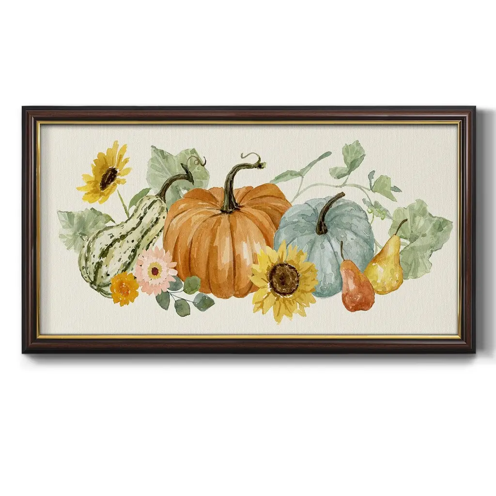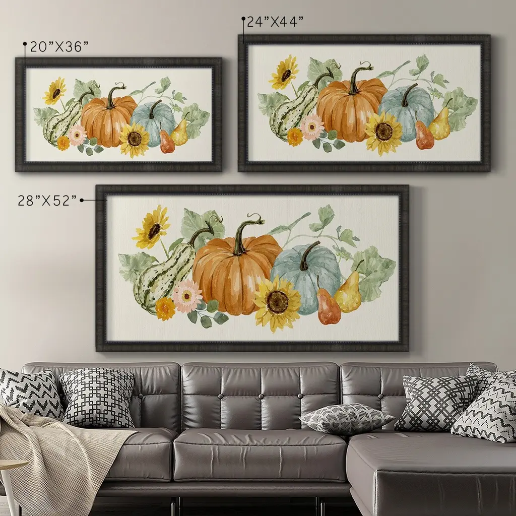Hello Autumn Collection D Premium Framed Canvas- Ready to Hang A Premium Framed Canvas created to last. Framed in distressed wood and available in an array of sizes and colors Featuring a beveled a solid wood stretcher bar, each piece comes ready to hand 3 SIZES AVAILABLE 21''X37'' - Overall Size 25''X45'' - Overall Size 29''x53'' - Overall Size Each piece is made to order. Each piece comes with hanging hardware. Made in the USA Ready to Hang Giclee Paper Print Acrylic Glass Beveled Matt Board