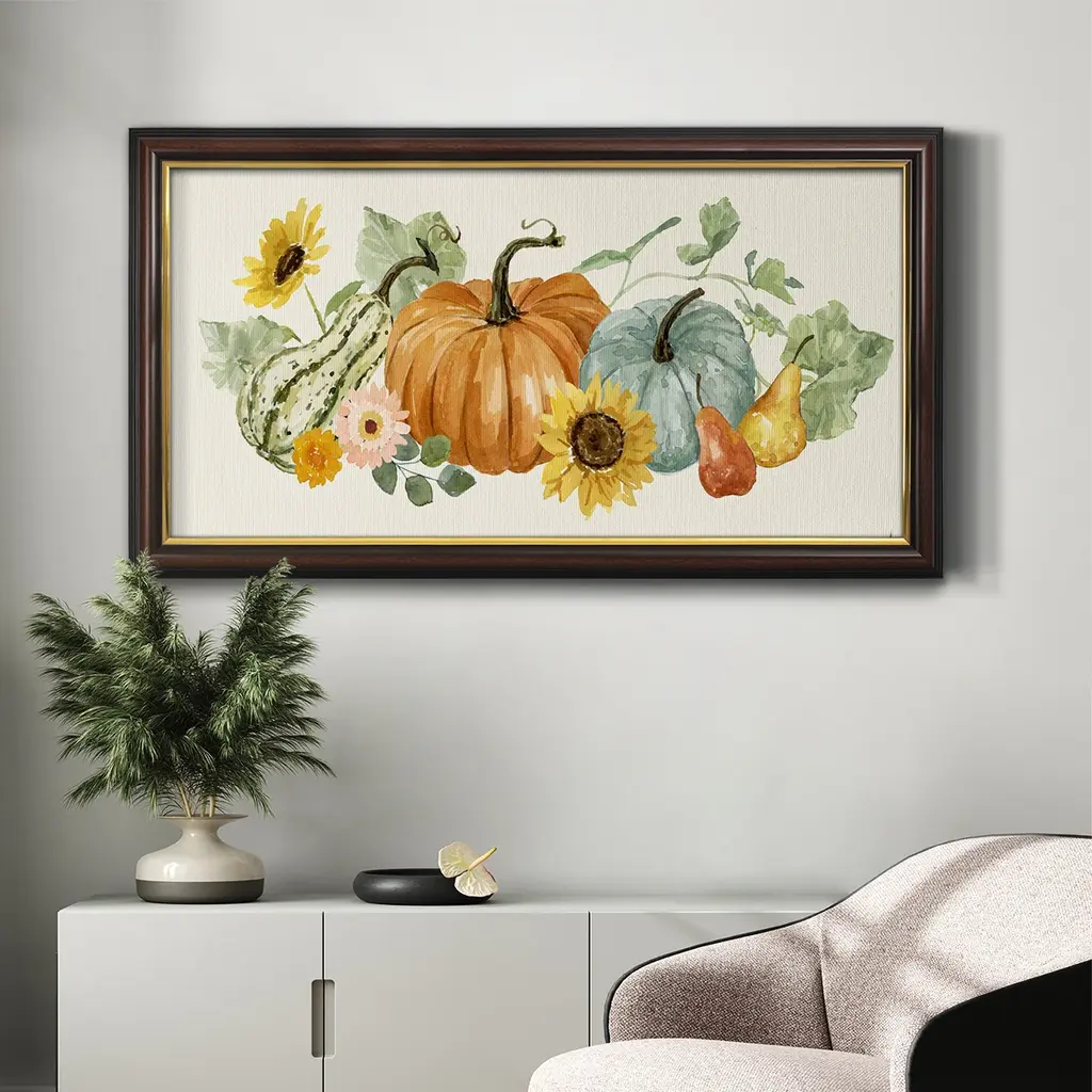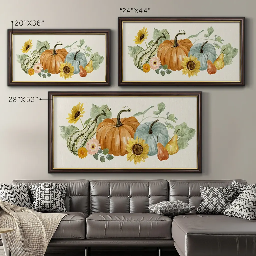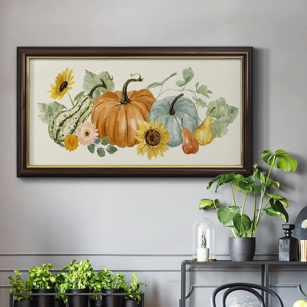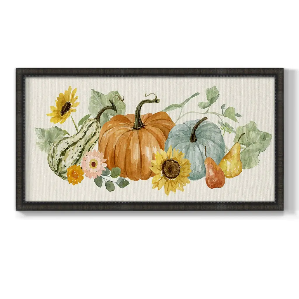 Hello Autumn Collection D Premium Framed Canvas- Ready to Hang A Premium Framed Canvas created to last. Framed in distressed wood and available in an array of sizes and colors Featuring a beveled a solid wood stretcher bar, each piece comes ready to hand 3 SIZES AVAILABLE 21''X37'' - Overall Size 25''X45'' - Overall Size 29''x53'' - Overall Size Each piece is made to order. Each piece comes with hanging hardware. Made in the USA Ready to Hang Giclee Paper Print Acrylic Glass Beveled Matt Board