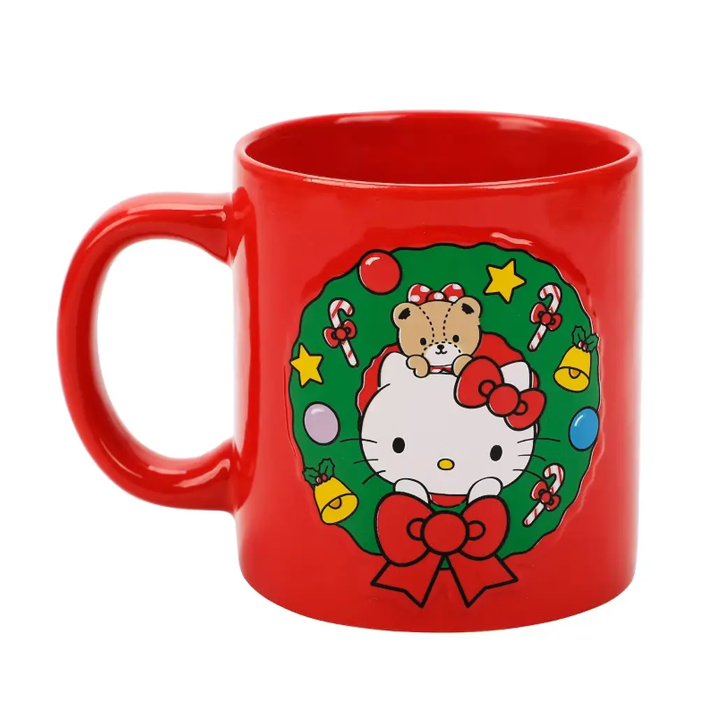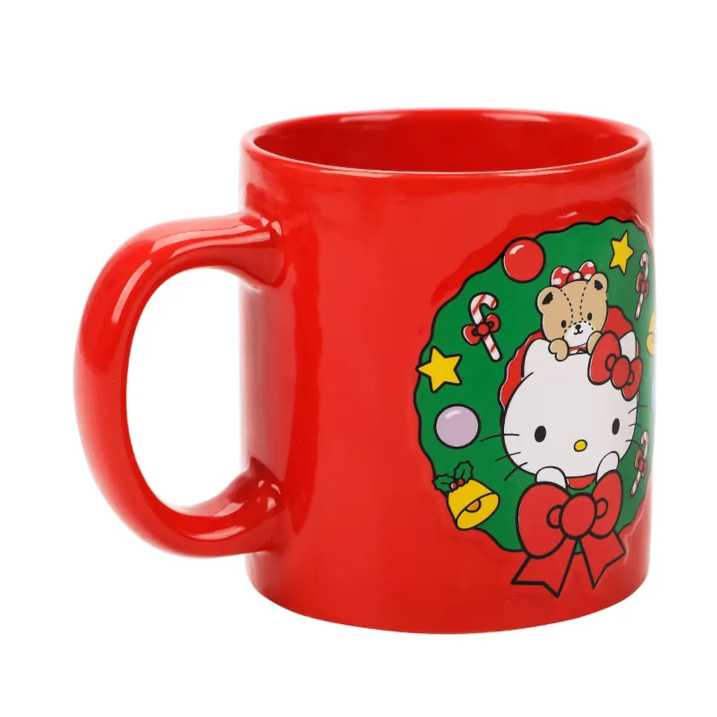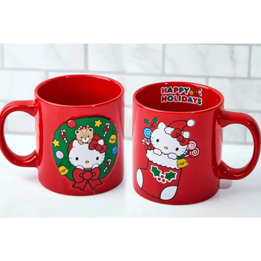 Celebrate the holiday season with this charming red Hello Kitty 16 oz ceramic mug. Adorned with delightful images of Hello Kitty and her teddy bear in a festive wreath on one side and Hello Kitty in a stocking on the other, this mug brings joy to every sip. Inside, cheerful letters proclaim "Happy Holidays," adding a special touch to your favorite hot beverages. Measuring 4" x 3.5" x 5.4", this high-quality stoneware mug is designed for hand washing only to preserve its vibrant artwork.