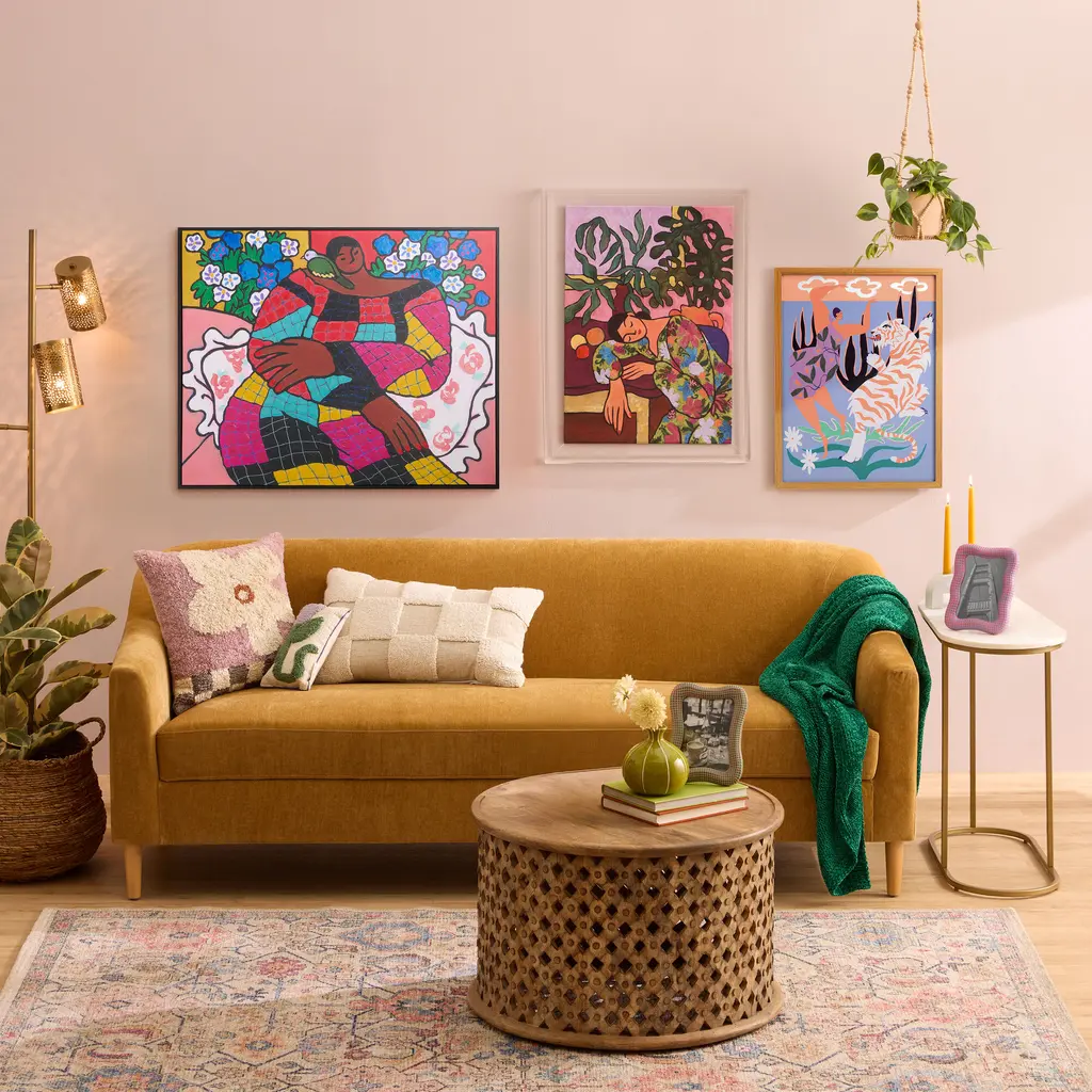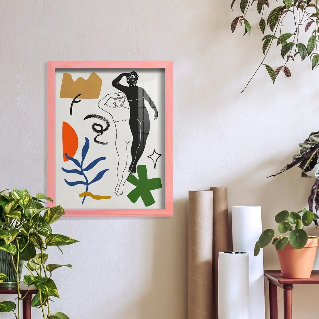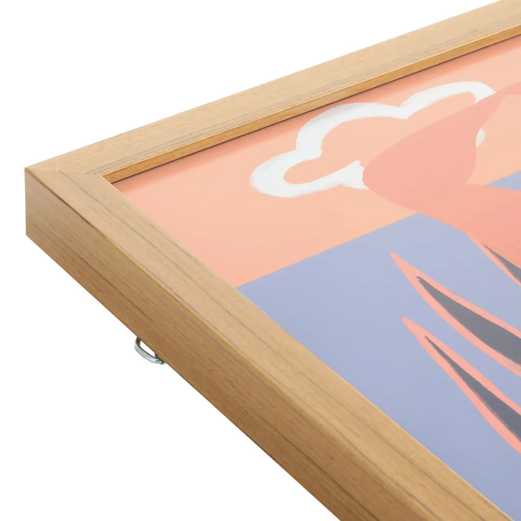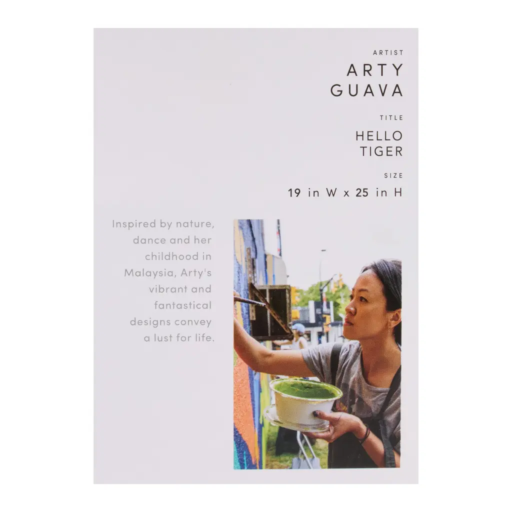 A woman in a purple floral dress dances with an orange and white tiger over an abstract landscape in our lively wall art by Malaysian-born artist Lay Hoon. Ready to hang in a pine wood frame with walnut finish, Hello Tiger uses surreal imagery and colorful composition that evoke a dynamic, dream-like vibe. Now living in Vancouver, Hoon is an illustrator and muralist who is known in the art world as Arty Guava.