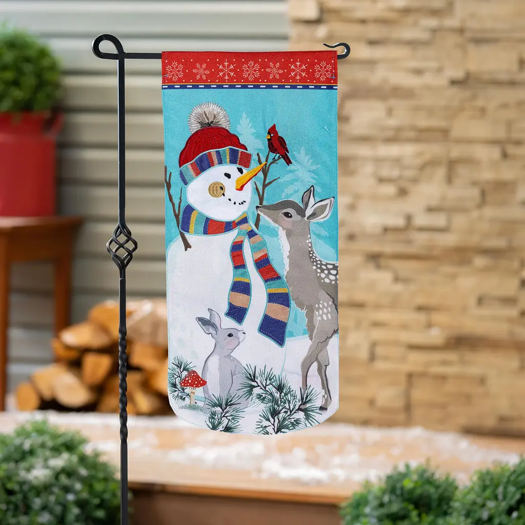 Decorate for the season and welcome friends and family to the home with this moire garden flag. It features a beautiful wreath with flowers and leaves. Two cardinals are sitting on it, and it has a “Hello Winter” message. Evergreen’s Moire flags deliver unmatched shimmer with a beautiful woodgrain effect that enhances each seasonal design. Artwork is heat-transferred onto both sides of the taffeta-like fabric with UV-protected dyes to guarantee vibrancy and durability through all seasons.