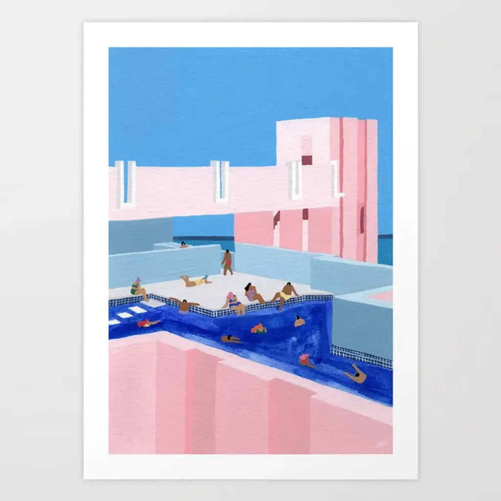Art print by Helo Birdie featuring a rooftop pool overlooking a vibrant seaview. Printed on archival paper made from cotton pressed in Italian mills, this high-quality art print is available in sizes and frames just right for your space. First select your frame (or go frameless), then select your size. **About the Frames** \- The exact width of each frame may vary slightly \- All frames are manufactured in the US \- Matte frames are durable poly \- Wood frames are recycled wood \- All are fitted with protective plexiglass \- Finished with wood moldings, archival backer and protective bumpers **Size** \- Available in multiple sizes \- Use the Size Guides to find the size that fits your space **Content + Care** \- Wipe clean \- Made in the USA