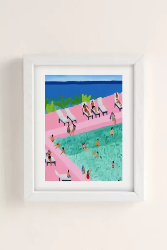 Art print by Helo Birdie featuring a rooftop pool overlooking a vibrant seaview. Printed on archival paper made from cotton pressed in Italian mills, this high-quality art print is available in sizes and frames just right for your space. First select your frame (or go frameless), then select your size. **About the Frames** \- The exact width of each frame may vary slightly \- All frames are manufactured in the US \- Matte frames are durable poly \- Wood frames are recycled wood \- All are fitted with protective plexiglass \- Finished with wood moldings, archival backer and protective bumpers **Size** \- Available in multiple sizes \- Use the Size Guides to find the size that fits your space **Content + Care** \- Wipe clean \- Made in the USA