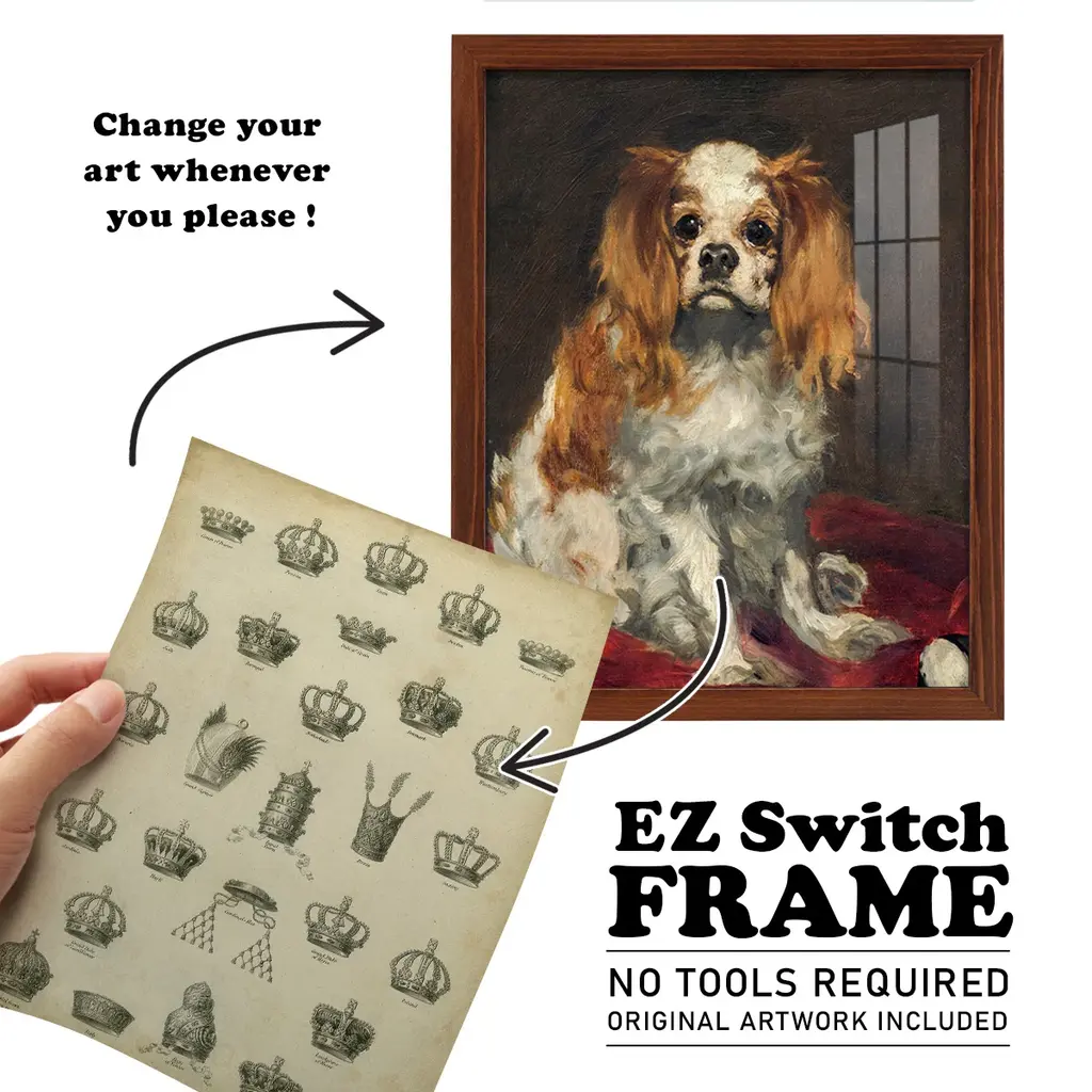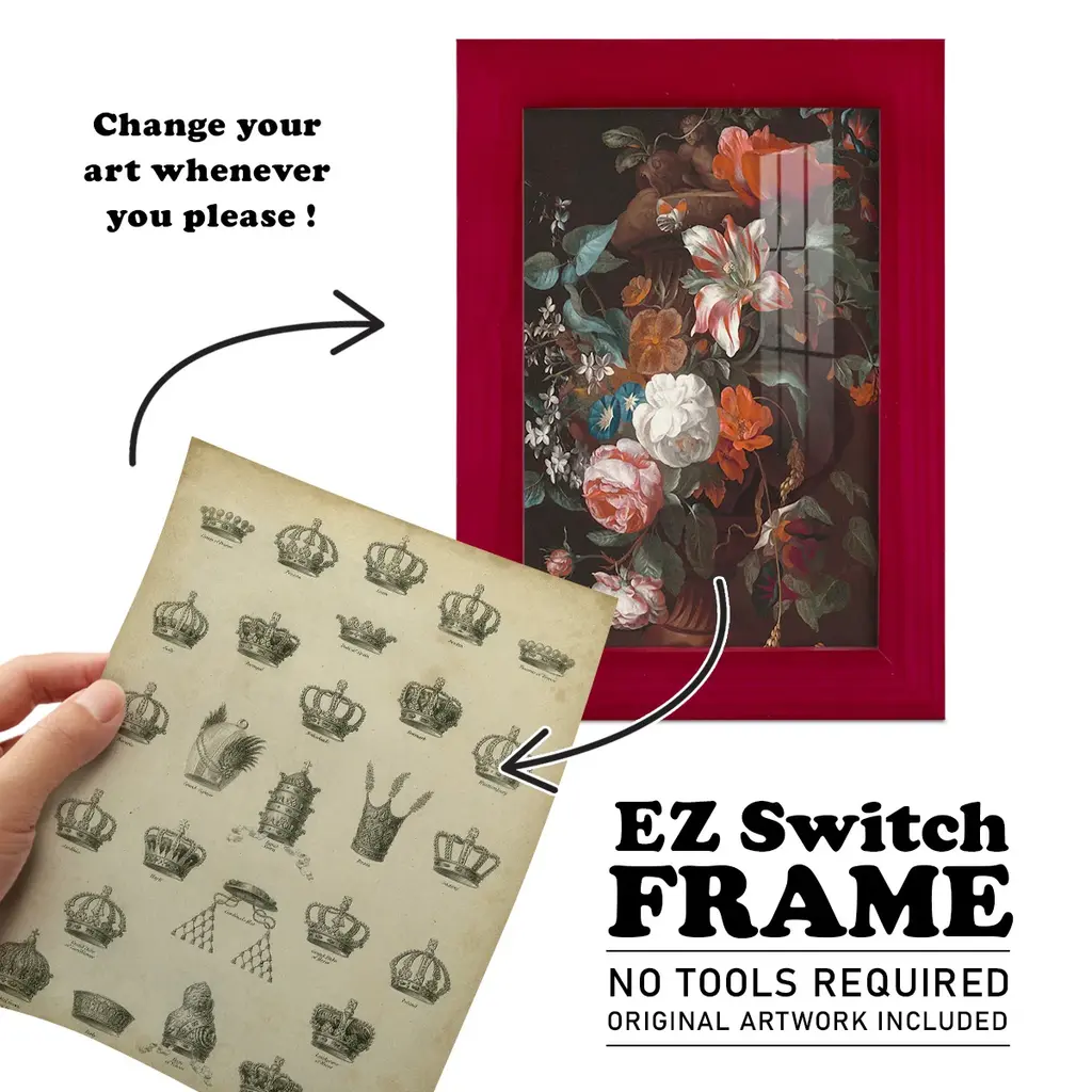 Heraldic Crowns & Coronets II -EZ SWITCH Framed Print w/glass-Cherry Red A delightful, framed print. Featuring a solid wood frame with real wood glass. This premium print is giclee quality. In addition, every frame features a removable back and table top stand. This allows you to change your art in the future or to just stand the art on a table for a new look. We are sure you'll enjoy our new series of EZ SWITCH Framed Art. Solid Wood Frame Real Glass Removable / Replaceable Art Built in Tabletop Stand Sizes range from 4x6 up to 12x15 - buy just one or pair them up as sets as you see fit.