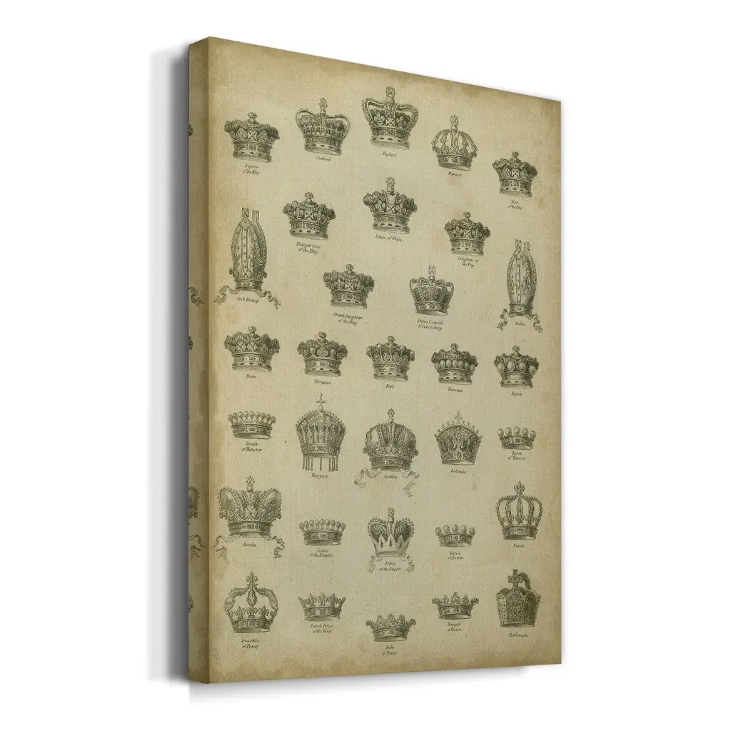 Heraldic Crowns & Coronets V Premium Gallery Wrapped Canvas - Ready to Hang A premium hand stretched gallery wrapped canvas print created to last. Featuring a beveled a solid wood stretcher bar, each piece comes ready to hand 6 SIZES AVAILABLE 8''X12'' - Overall Size 12''X18'' - Overall Size 18''X27'' - Overall Size 24''x36'' - Overall Size 32''x48'' - Overall Size 40''x60'' - Overall Size Each piece is made to order. Built to Last Each piece comes ready to hang Solid wood stretcher Fade and Water resistant Made domestically