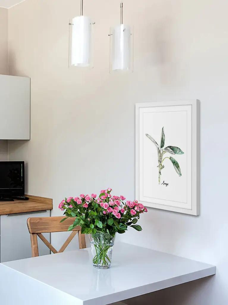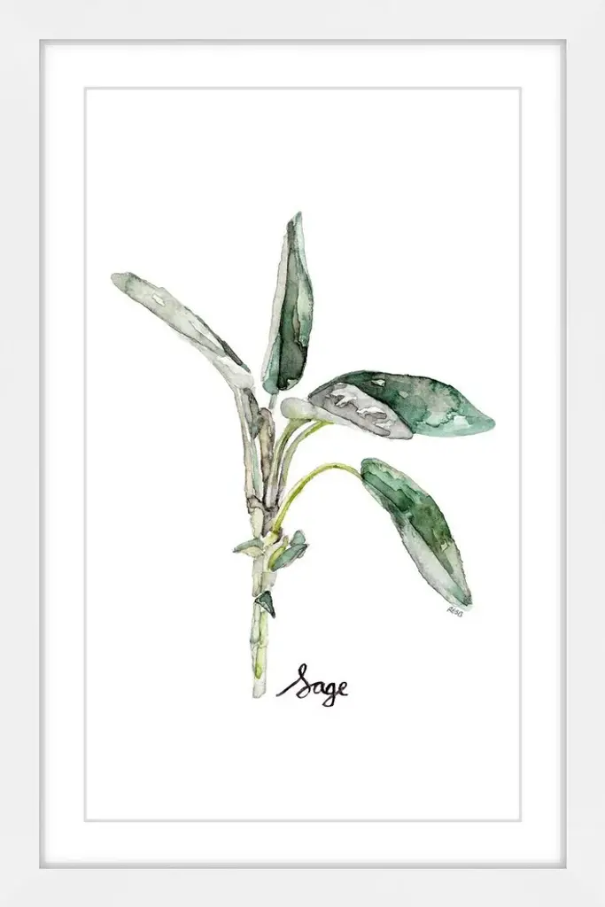 "Herb Sage" Framed Print by Rachel Byler features vivid tones and supple artistry. Mounted in a gorgeous frame, this 24 inch wide by 36 inch tall piece will be an exceptional addition to any room. Top quality Giclee print on high resolution Archive Paper Artwork by Rachel Byler Professionally framed and mounted on acid free archive matte High quality durable non-warping frame Arrives ready to hang Includes a certificate of authenticityMade in the USAArtist signature on the front