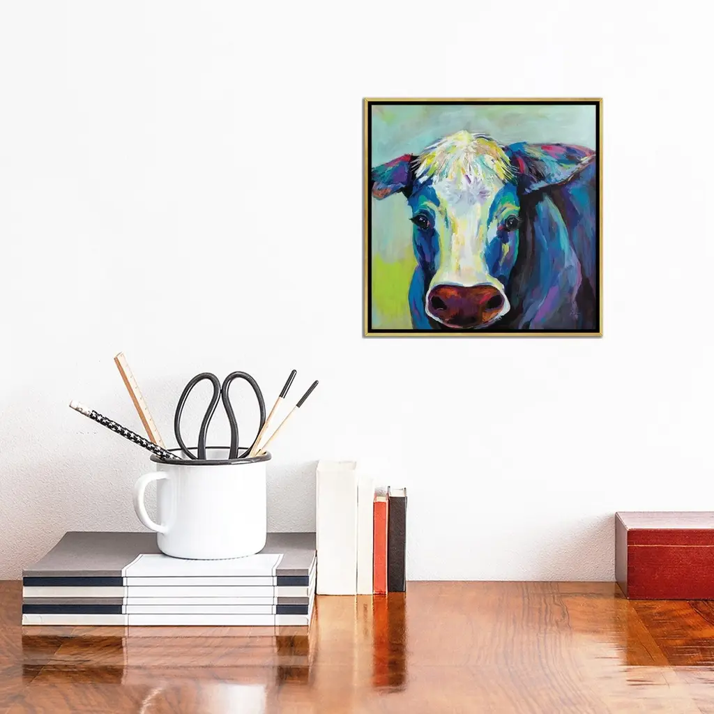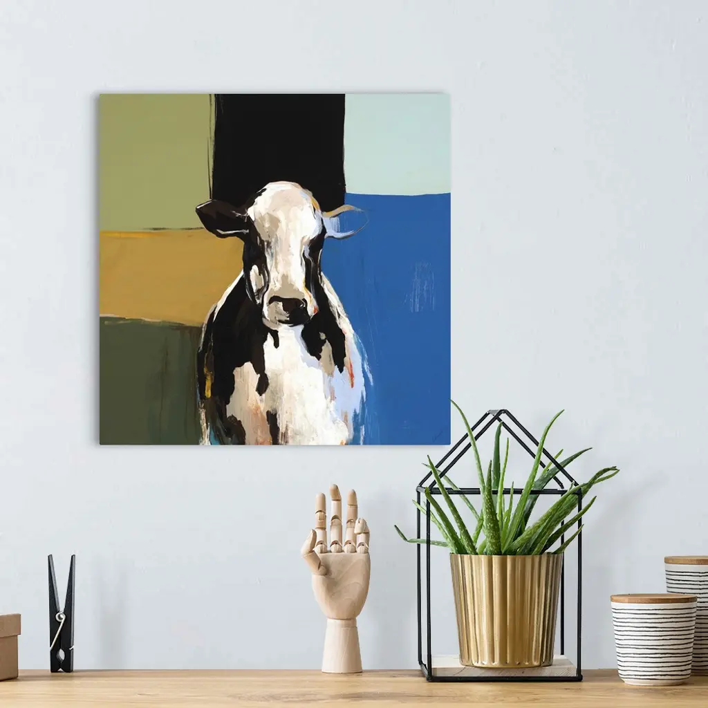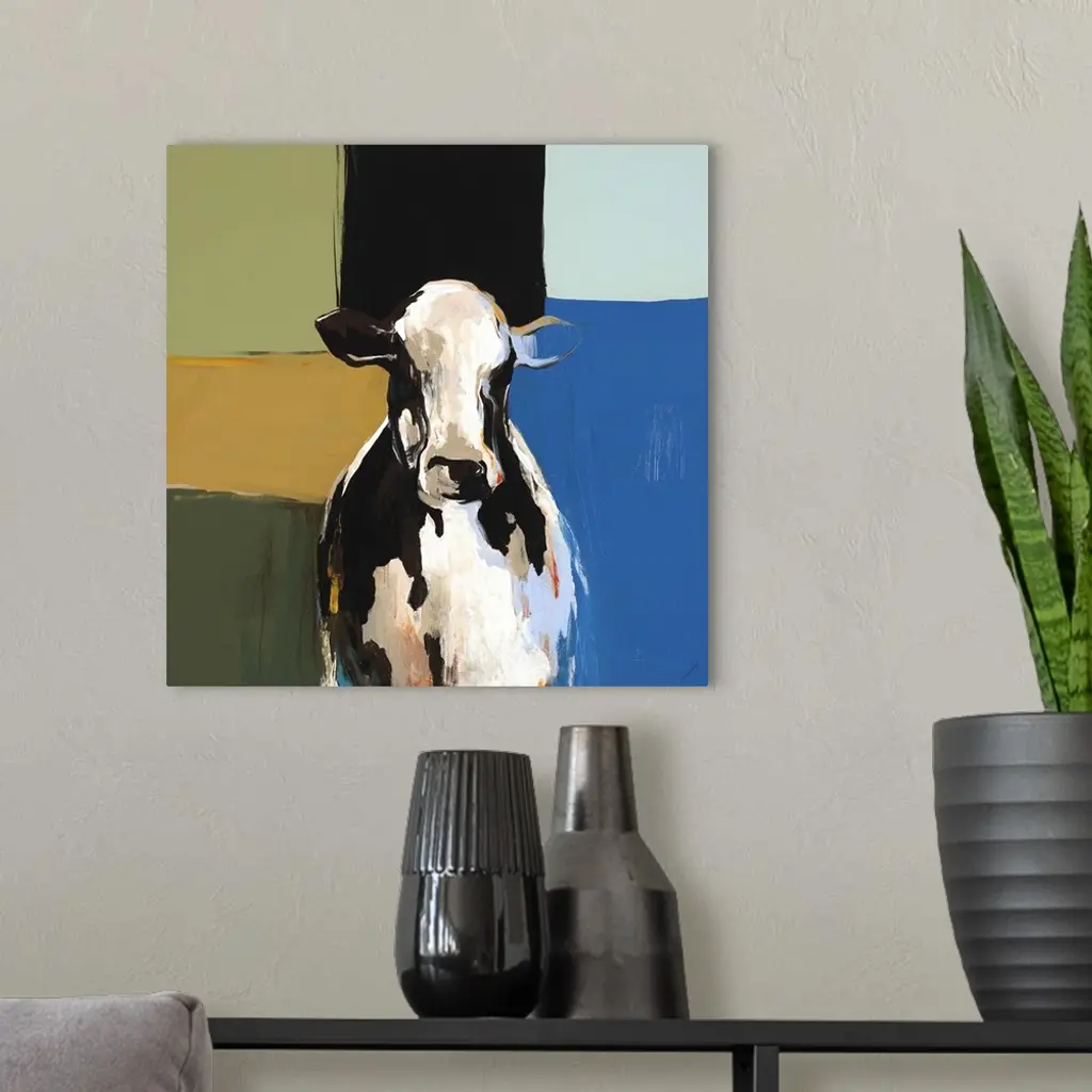 Contemporary painting of the bust of a black and white cow, on a multicolored background of squares and rectangles.