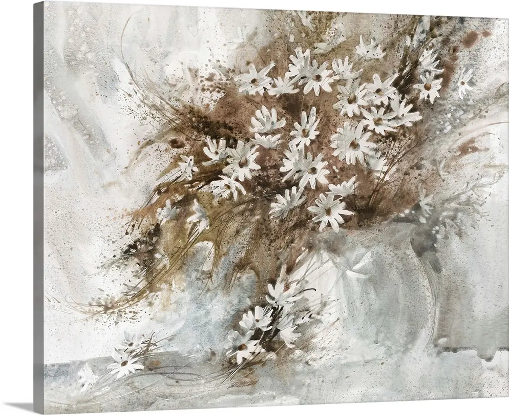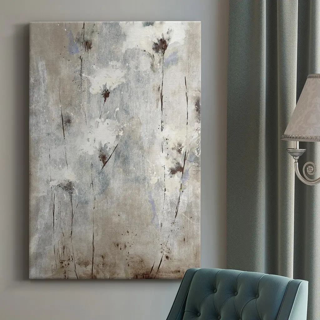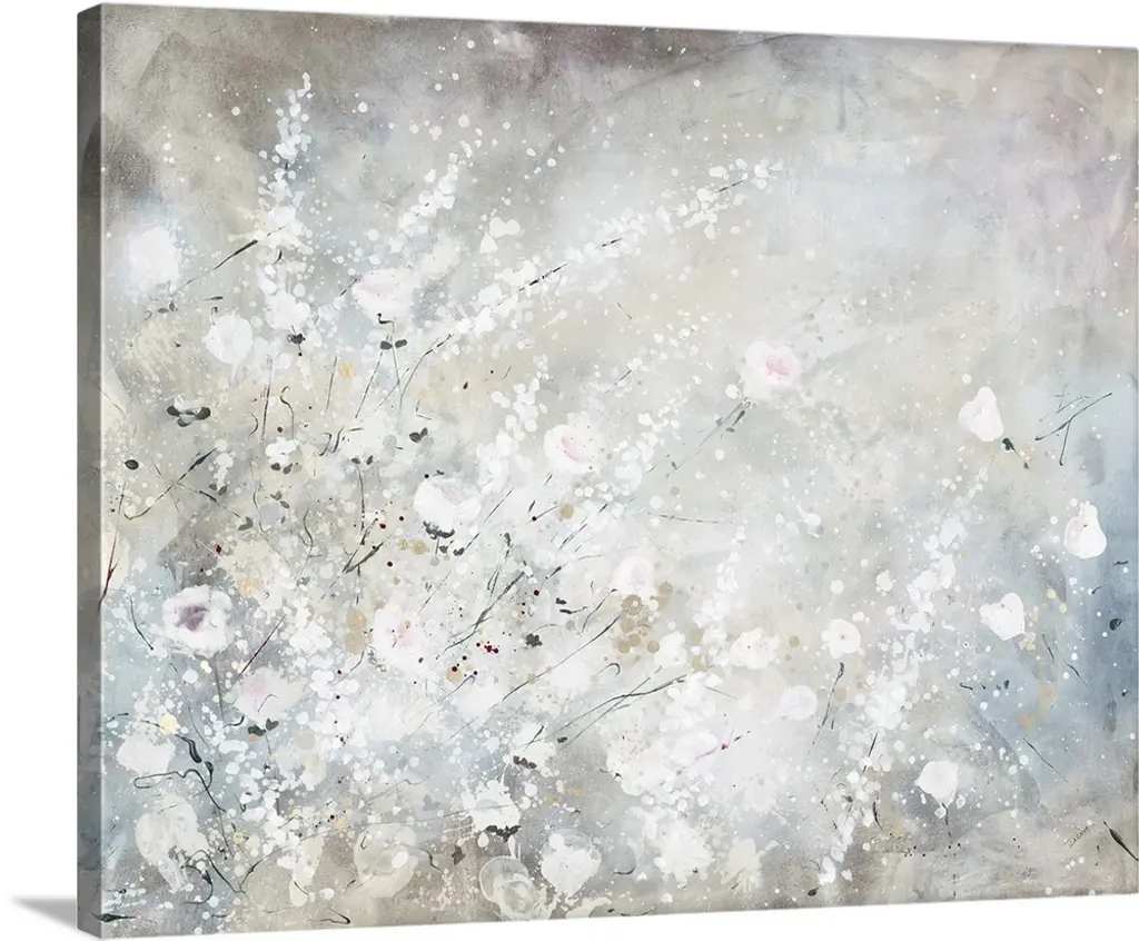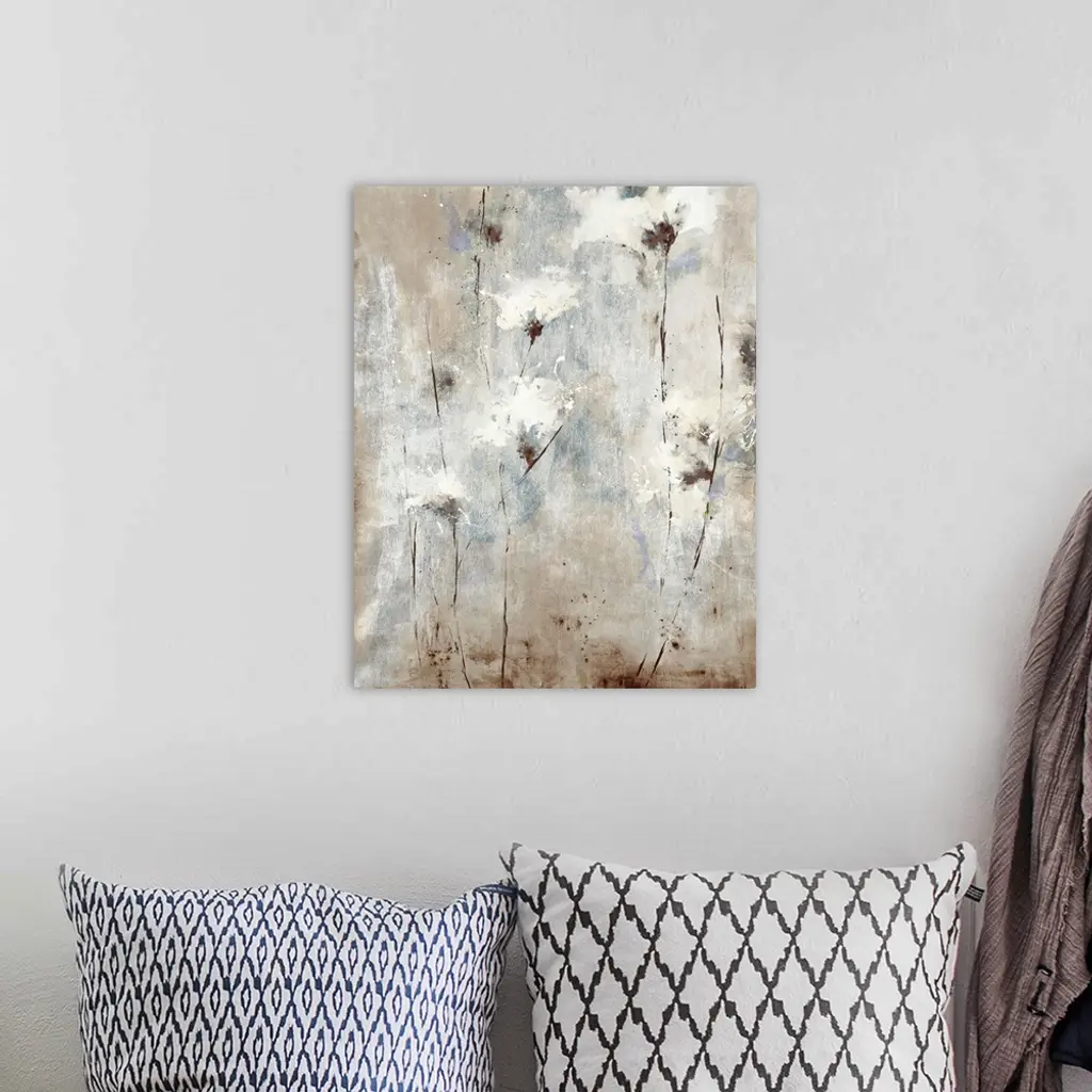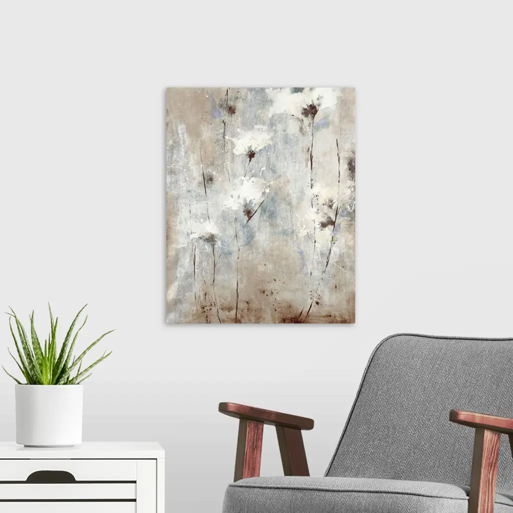 A soft, contemporary painting of whispy white flowers on a neutral background with blue tones