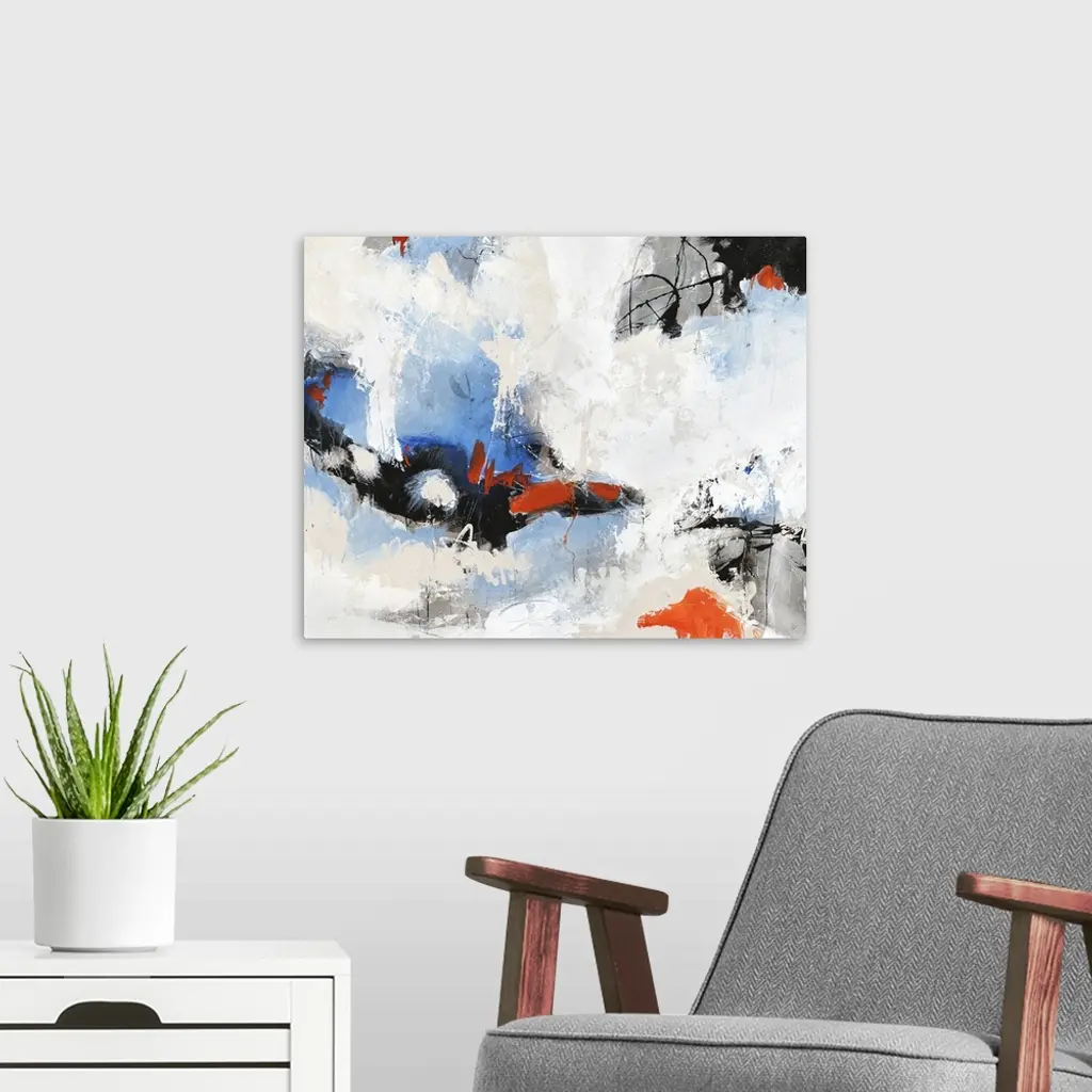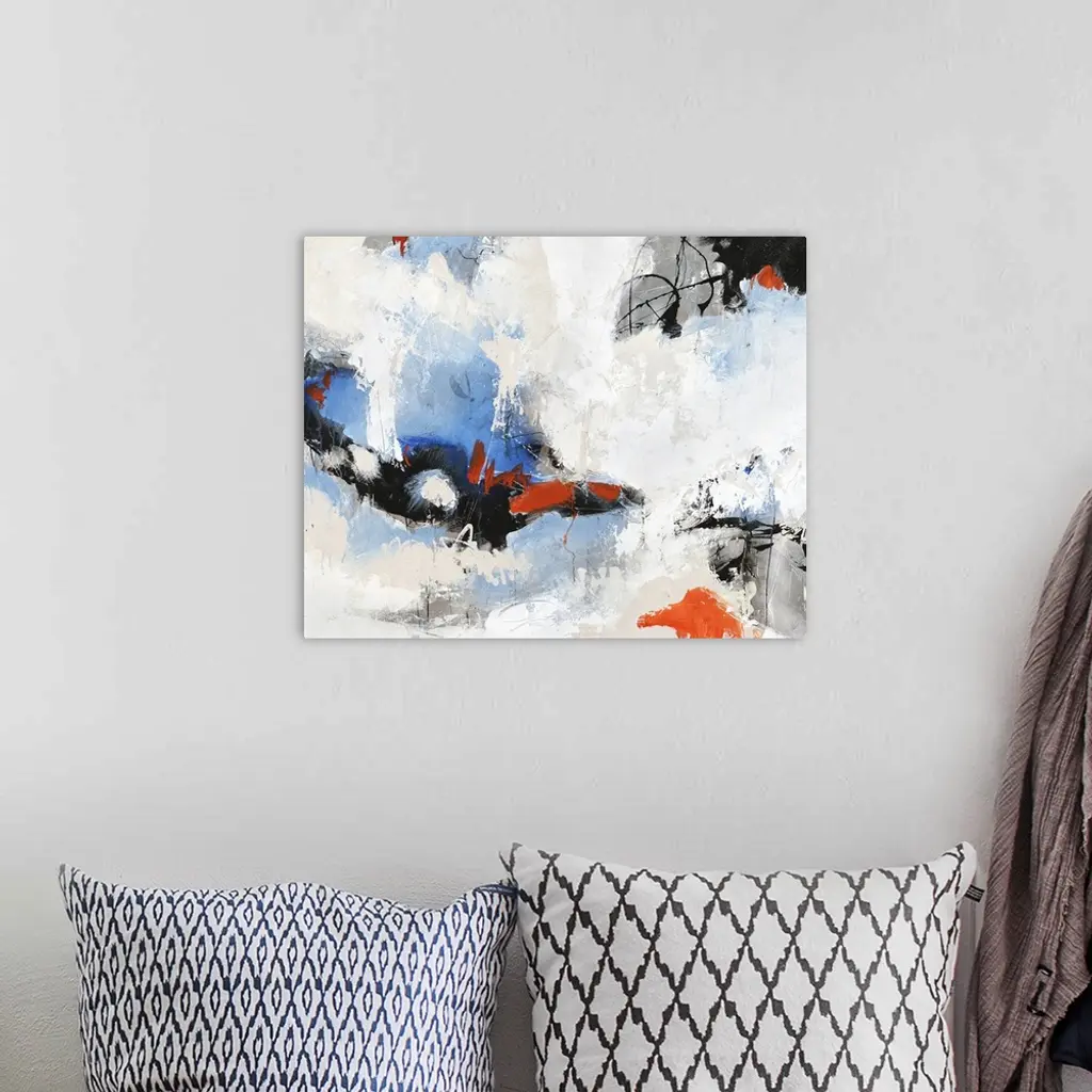 Contemporary abstract painting with blue and red peeking through clouds of white.