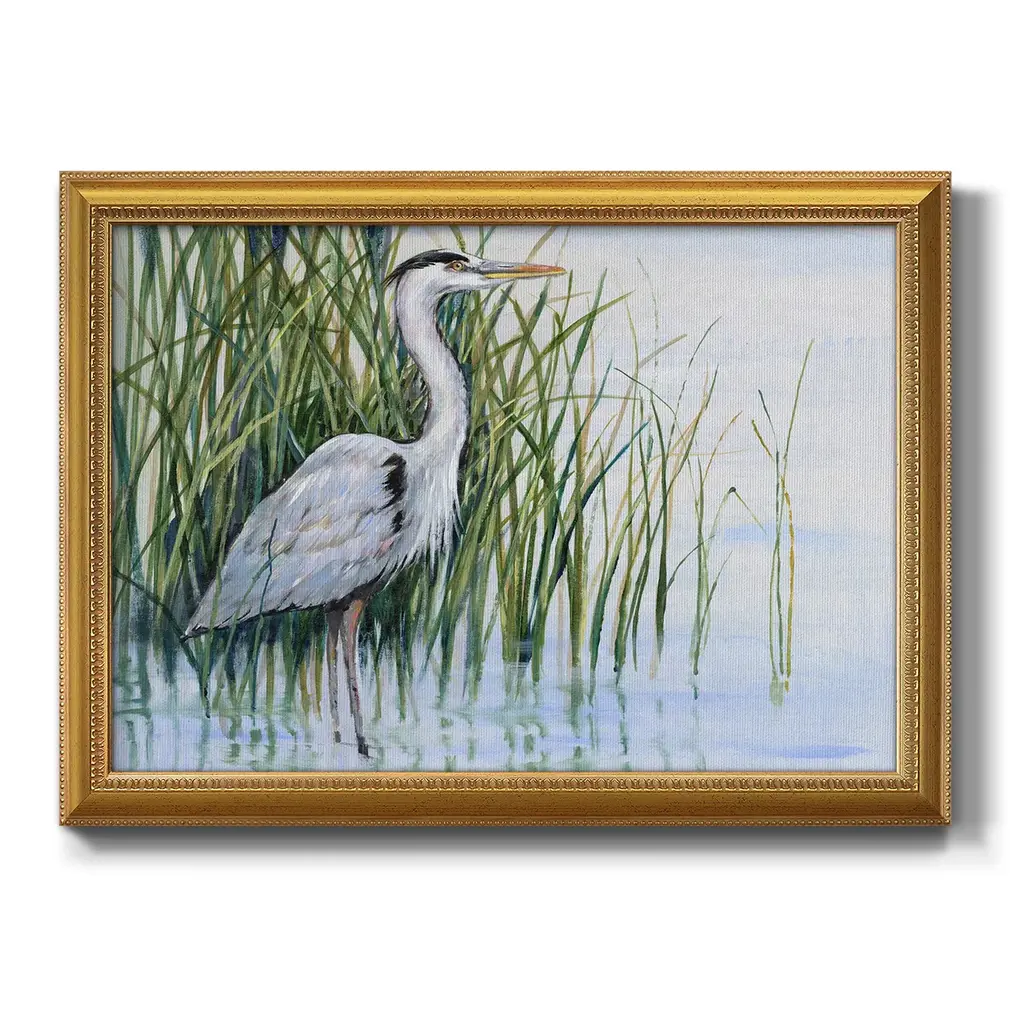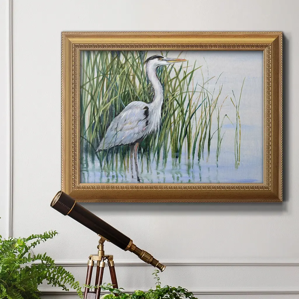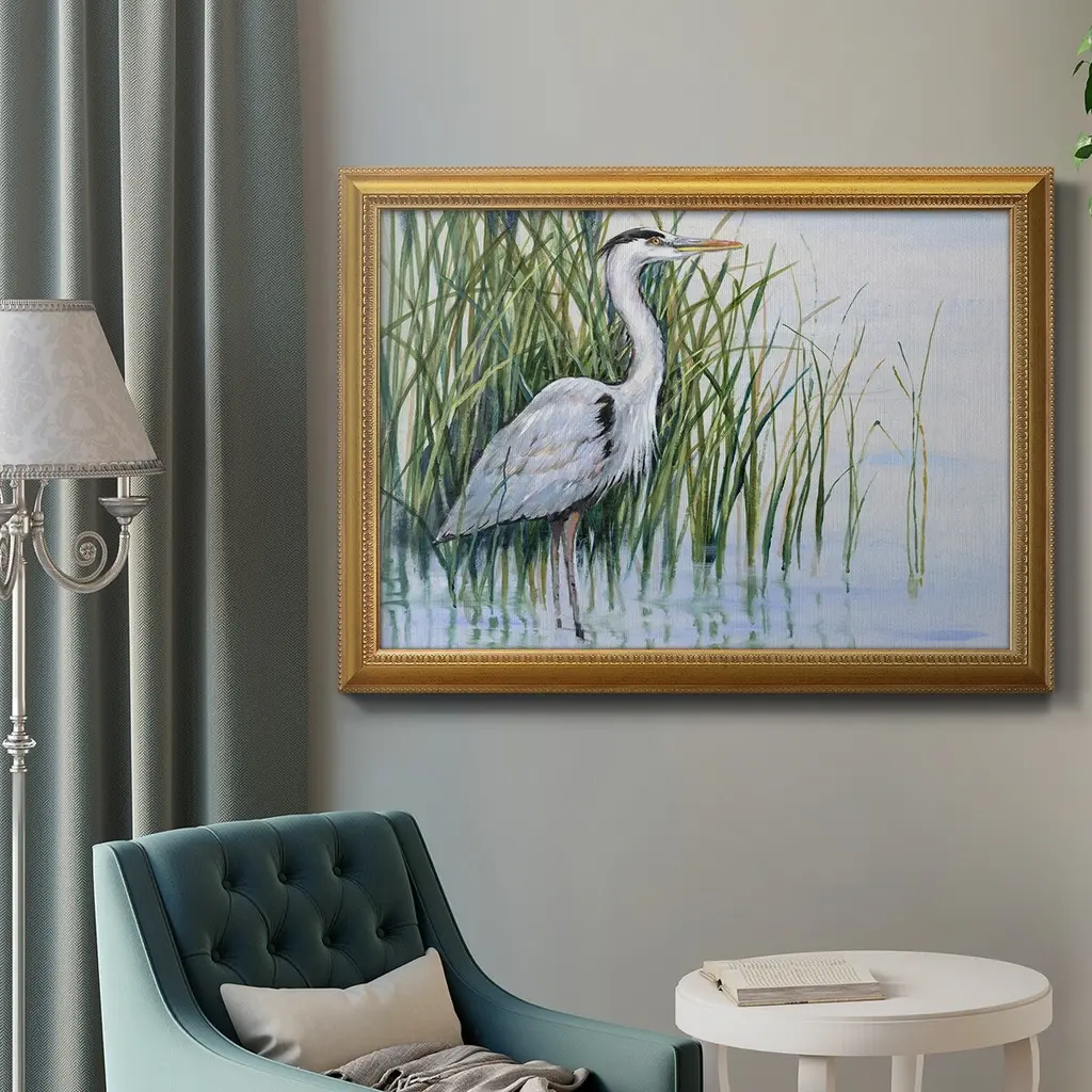 Heron in the Marsh I Premium Framed Canvas- Ready to Hang A Premium Framed Canvas created to last. Framed in distressed wood and available in an array of sizes and colors Featuring a beveled a solid wood stretcher bar, each piece comes ready to hand 3 SIZES AVAILABLE 16''X20'' - Overall Size 18'X27'' - Overall Size 24''x36'' - Overall Size Each piece is made to order. Each piece comes with hanging hardware. Made in the USA Ready to Hang Giclee Paper Print Acrylic Glass Beveled Matt Board