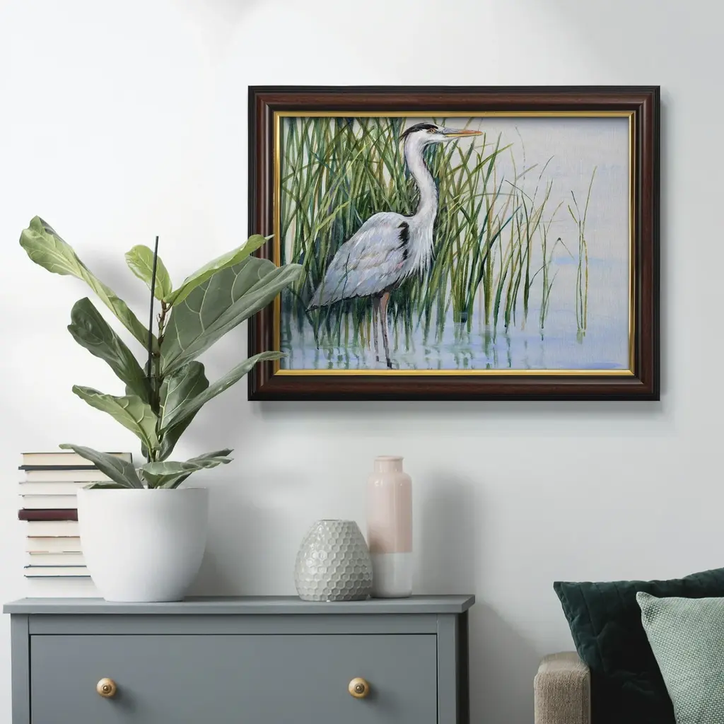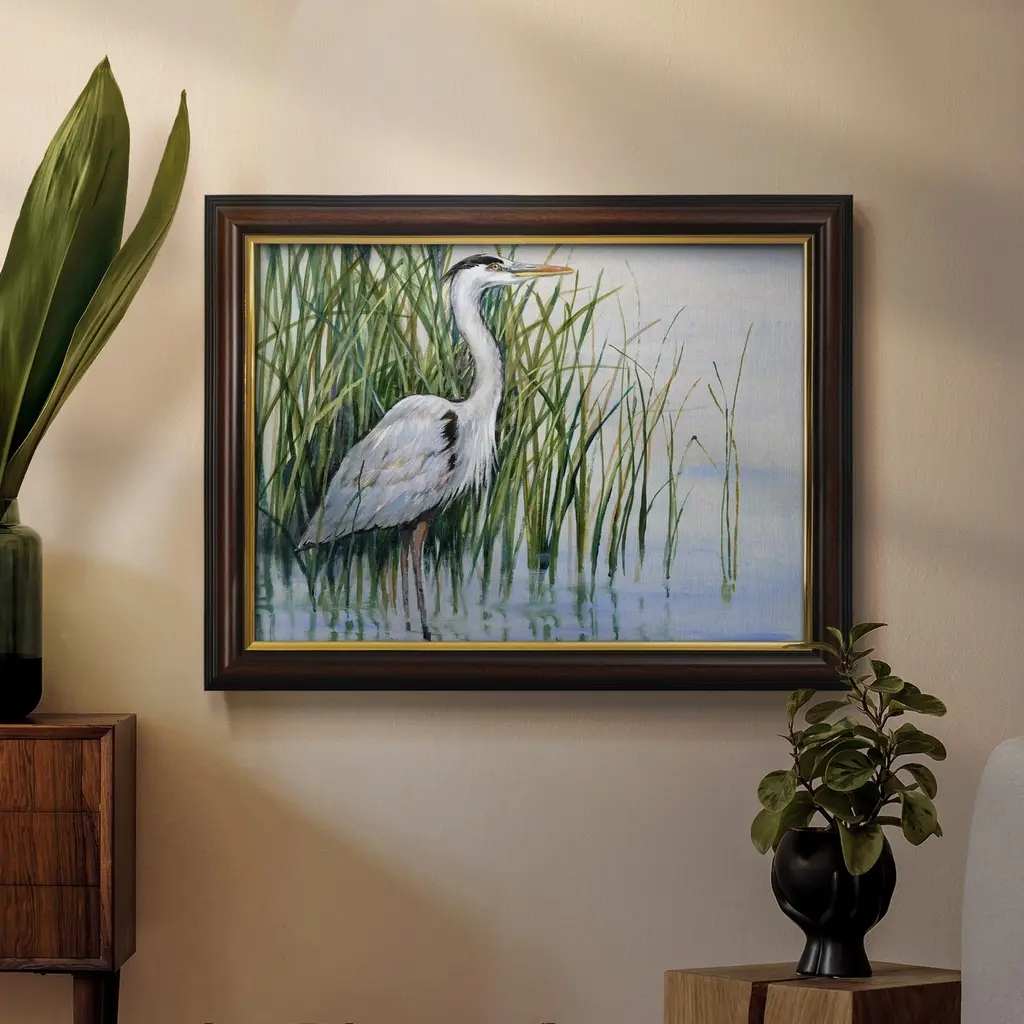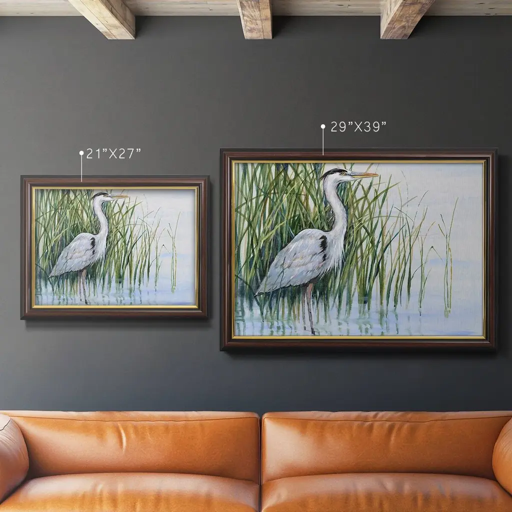 Heron in the Marsh I Premium Framed Canvas- Ready to Hang A Premium Framed Canvas created to last. Framed in distressed wood and available in an array of sizes and colors Featuring a beveled a solid wood stretcher bar, each piece comes ready to hand 3 SIZES AVAILABLE 16''X20'' - Overall Size 18'X27'' - Overall Size 24''x36'' - Overall Size Each piece is made to order. Each piece comes with hanging hardware. Made in the USA Ready to Hang Giclee Paper Print Acrylic Glass Beveled Matt Board
