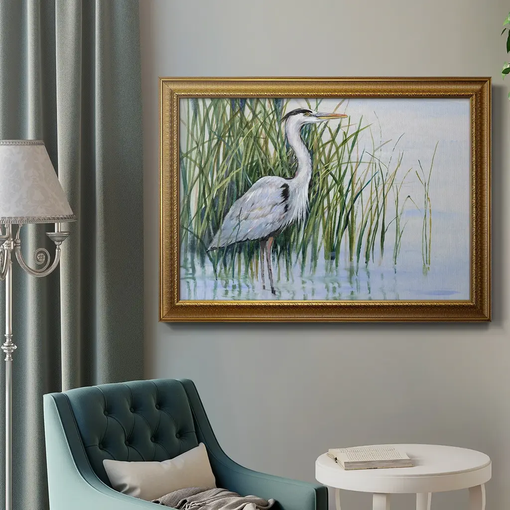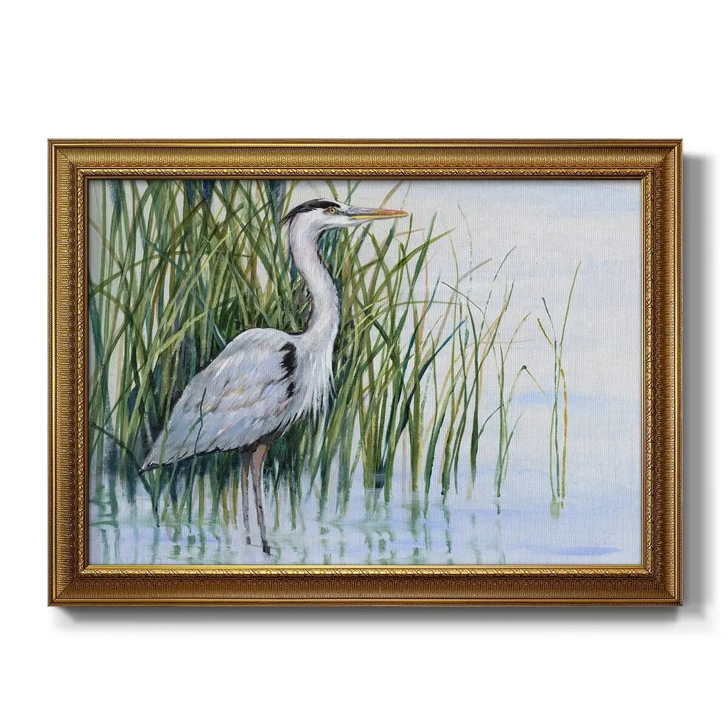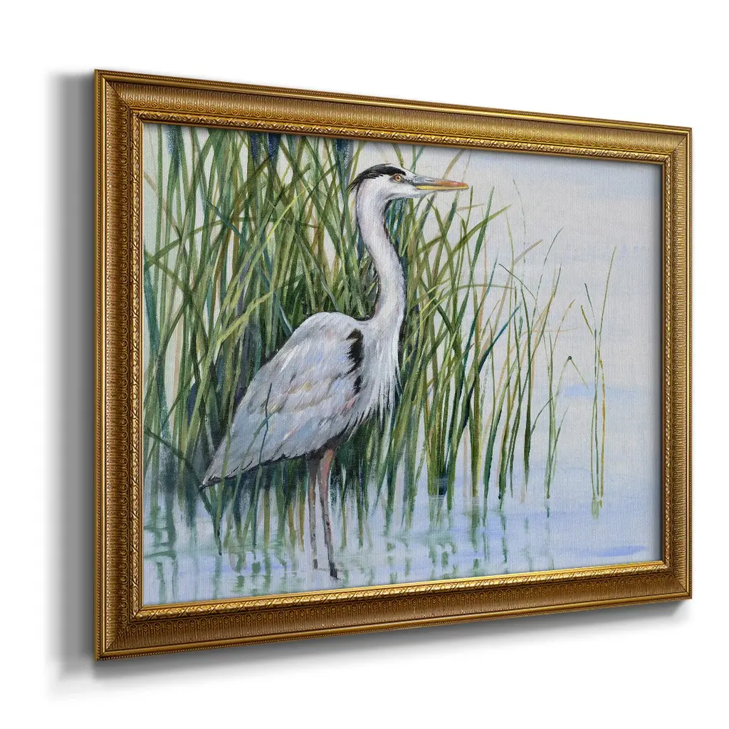 Heron in the Marsh I Premium Framed Canvas- Ready to Hang A Premium Framed Canvas created to last. Framed in distressed wood and available in an array of sizes and colors Featuring a beveled a solid wood stretcher bar, each piece comes ready to hand 3 SIZES AVAILABLE 16''X20'' - Overall Size 18'X27'' - Overall Size 24''x36'' - Overall Size Each piece is made to order. Each piece comes with hanging hardware. Made in the USA Ready to Hang Giclee Paper Print Acrylic Glass Beveled Matt Board