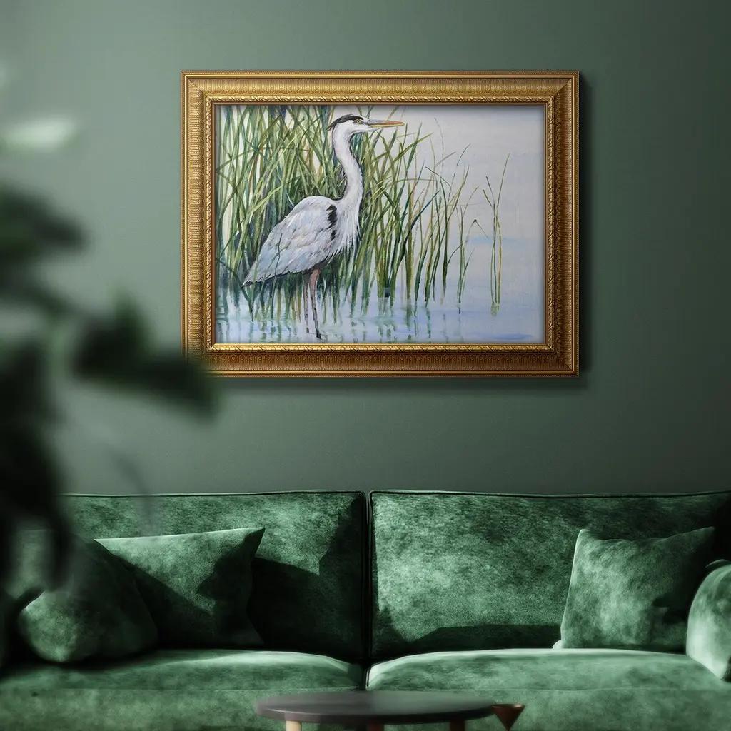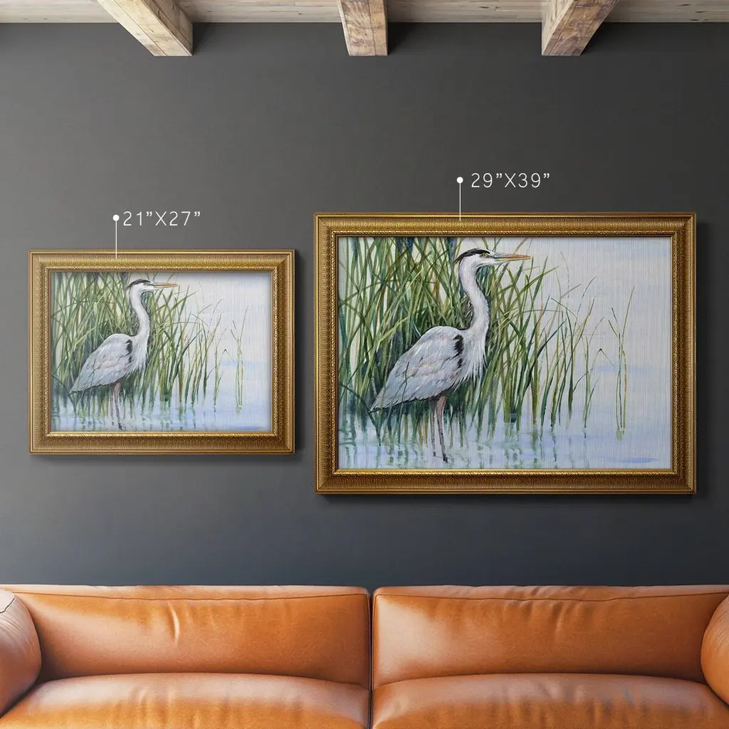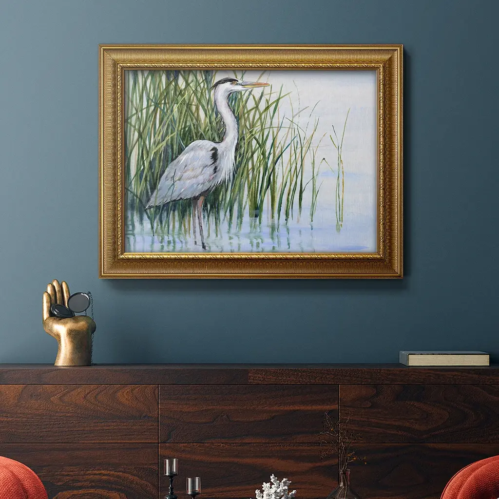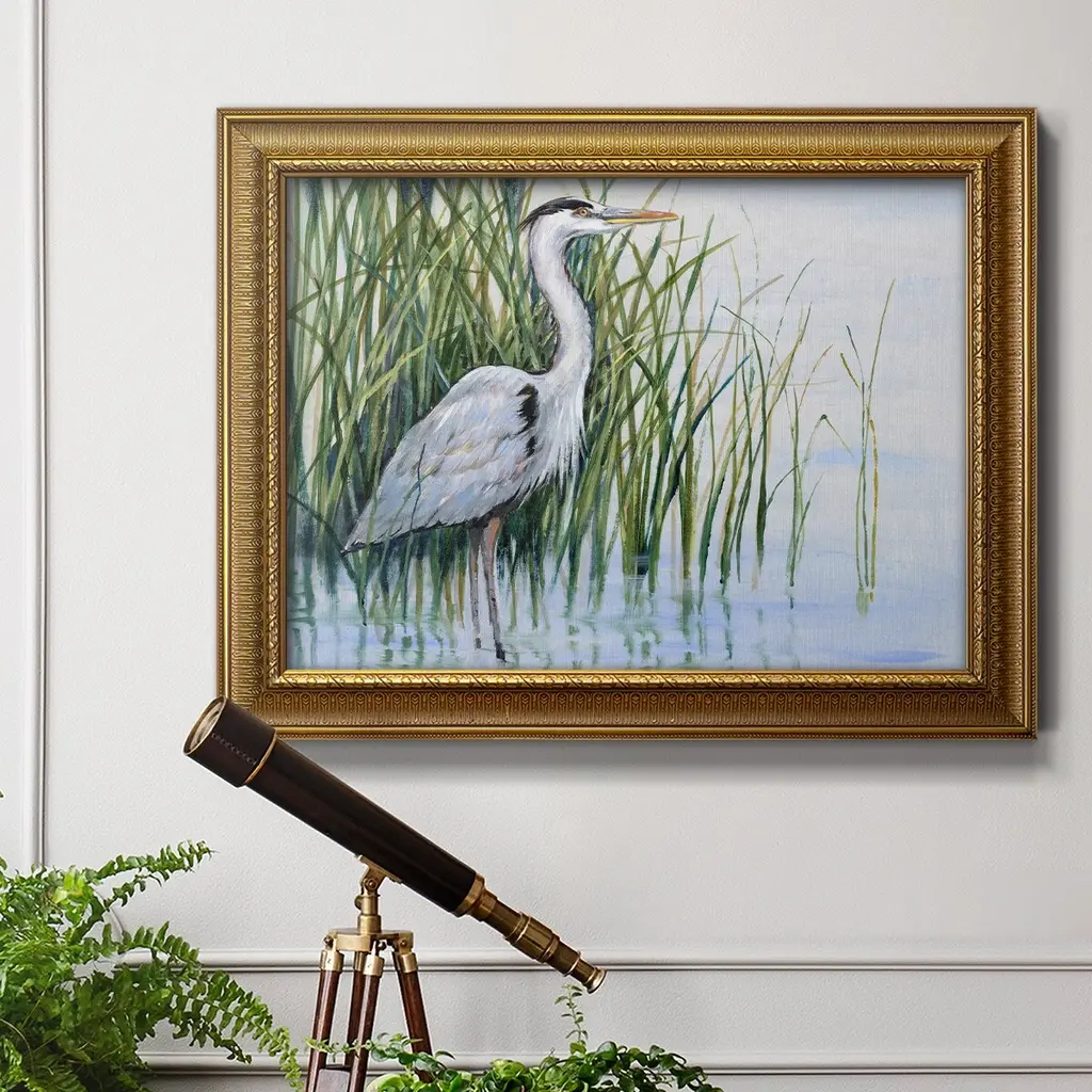Heron in the Marsh I Premium Framed Canvas- Ready to Hang A Premium Framed Canvas created to last. Framed in distressed wood and available in an array of sizes and colors Featuring a beveled a solid wood stretcher bar, each piece comes ready to hand 3 SIZES AVAILABLE 16''X20'' - Overall Size 18'X27'' - Overall Size 24''x36'' - Overall Size Each piece is made to order. Each piece comes with hanging hardware. Made in the USA Ready to Hang Giclee Paper Print Acrylic Glass Beveled Matt Board