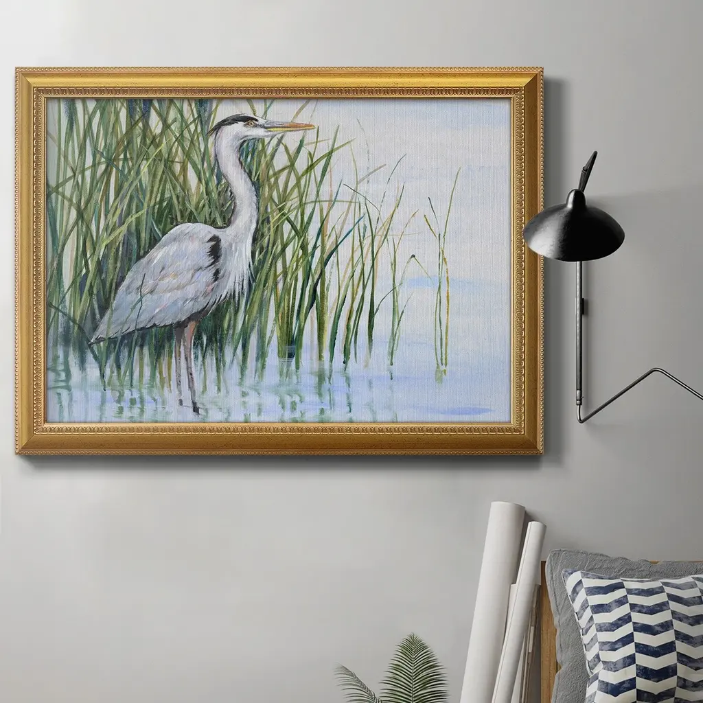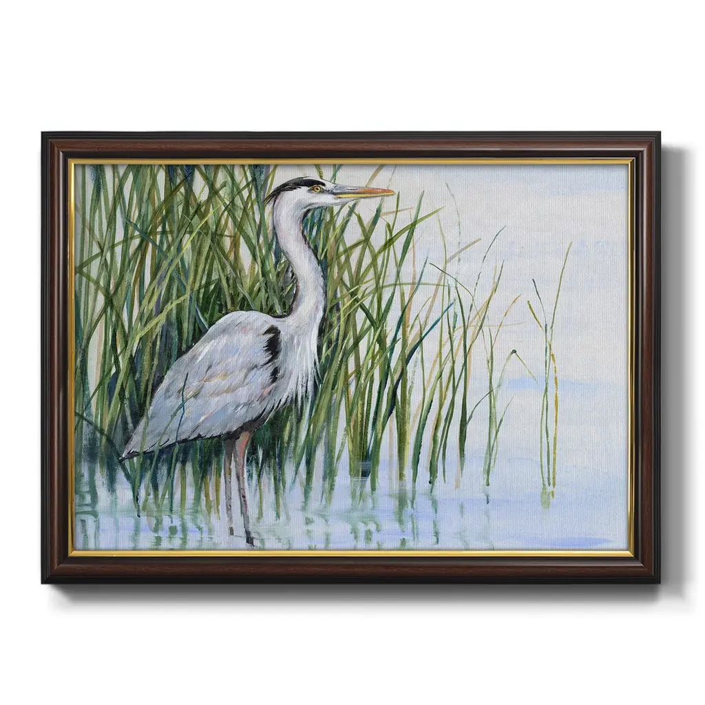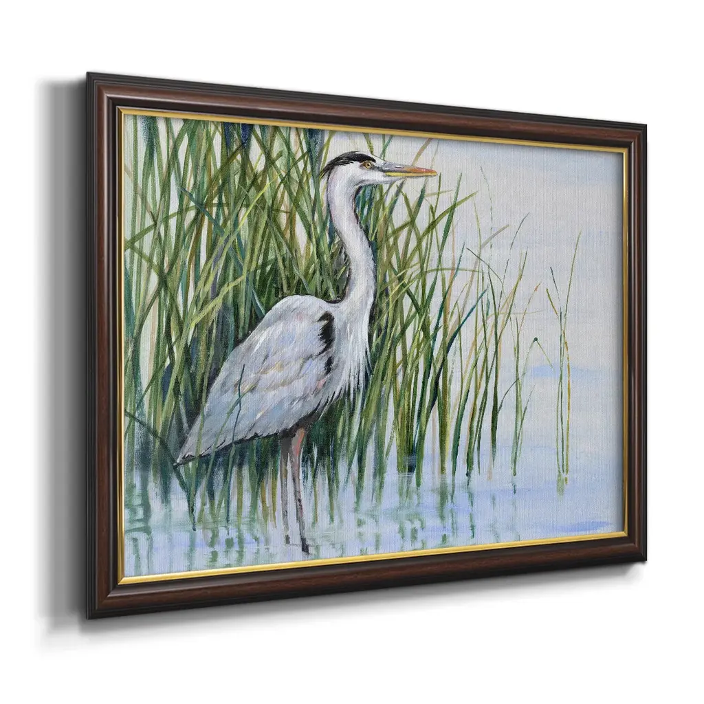 Heron in the Marsh I Premium Framed Canvas- Ready to Hang A Premium Framed Canvas created to last. Framed in distressed wood and available in an array of sizes and colors Featuring a beveled a solid wood stretcher bar, each piece comes ready to hand 3 SIZES AVAILABLE 16''X20'' - Overall Size 18'X27'' - Overall Size 24''x36'' - Overall Size Each piece is made to order. Each piece comes with hanging hardware. Made in the USA Ready to Hang Giclee Paper Print Acrylic Glass Beveled Matt Board