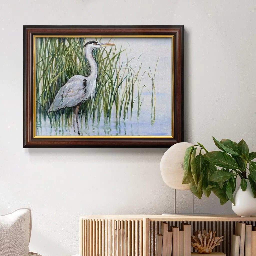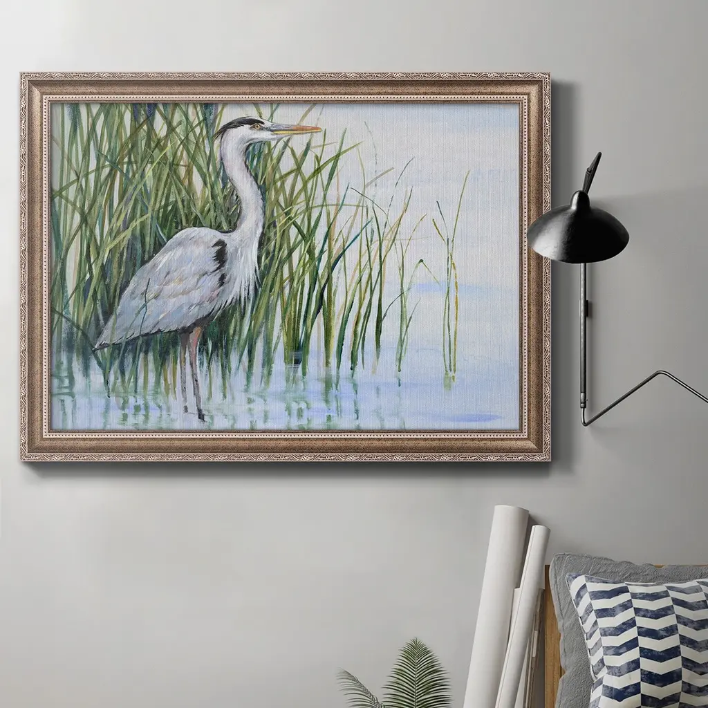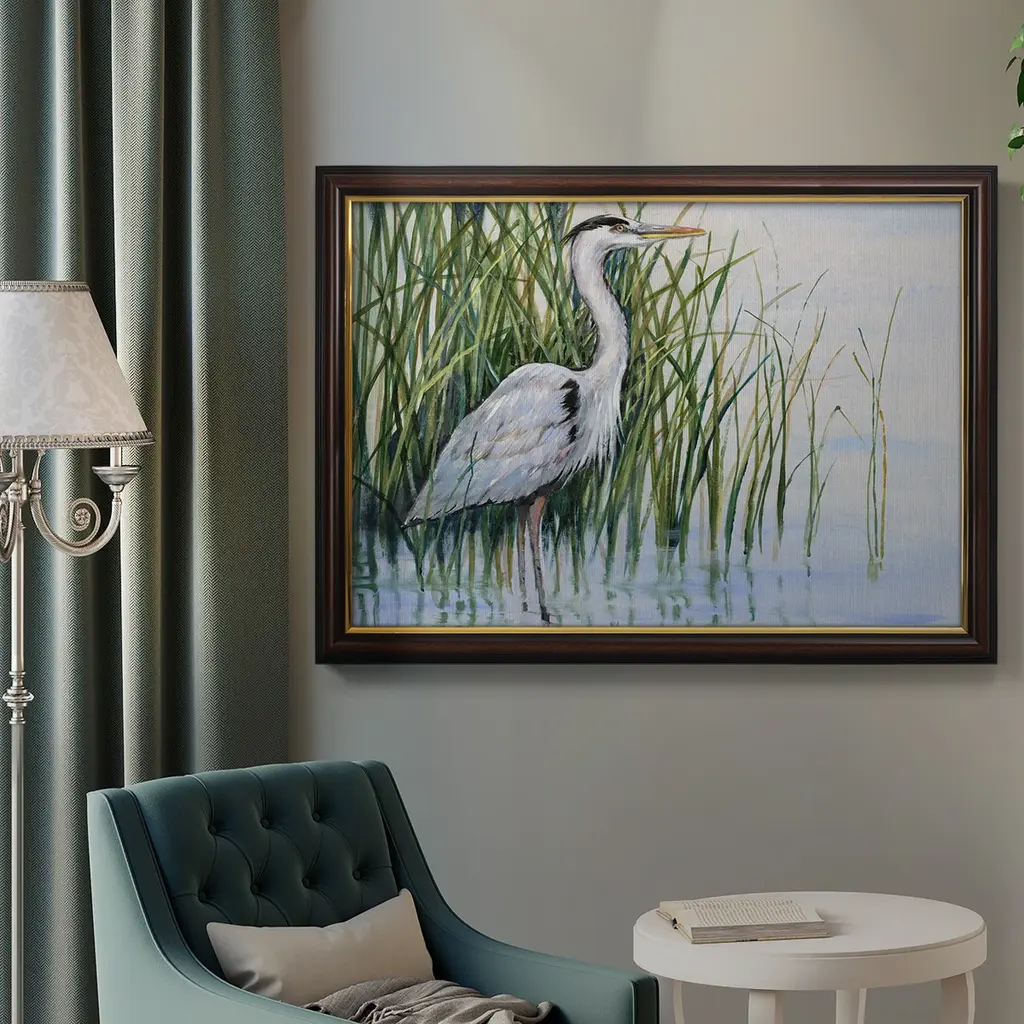 Heron in the Marsh I Premium Framed Canvas- Ready to Hang A Premium Framed Canvas created to last. Framed in distressed wood and available in an array of sizes and colors Featuring a beveled a solid wood stretcher bar, each piece comes ready to hand 3 SIZES AVAILABLE 16''X20'' - Overall Size 18'X27'' - Overall Size 24''x36'' - Overall Size Each piece is made to order. Each piece comes with hanging hardware. Made in the USA Ready to Hang Giclee Paper Print Acrylic Glass Beveled Matt Board