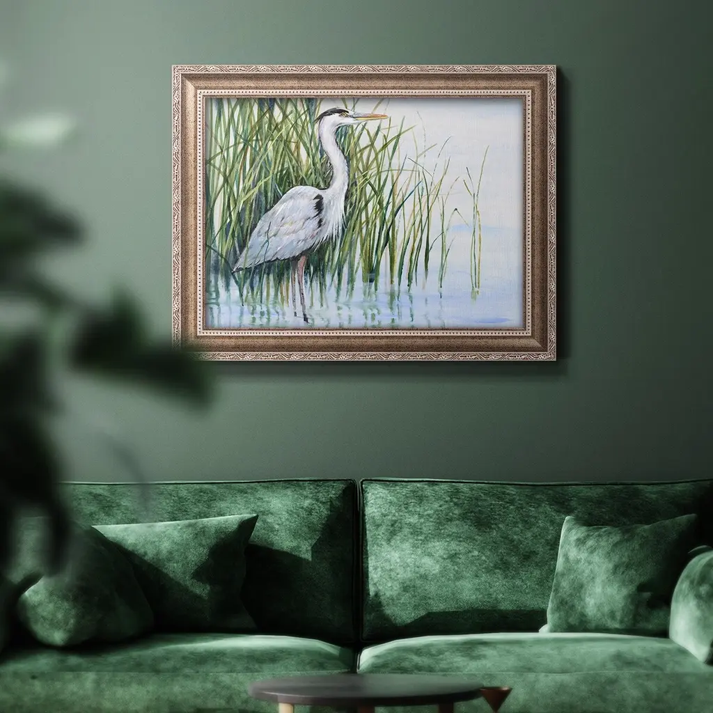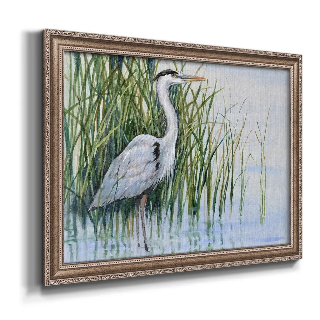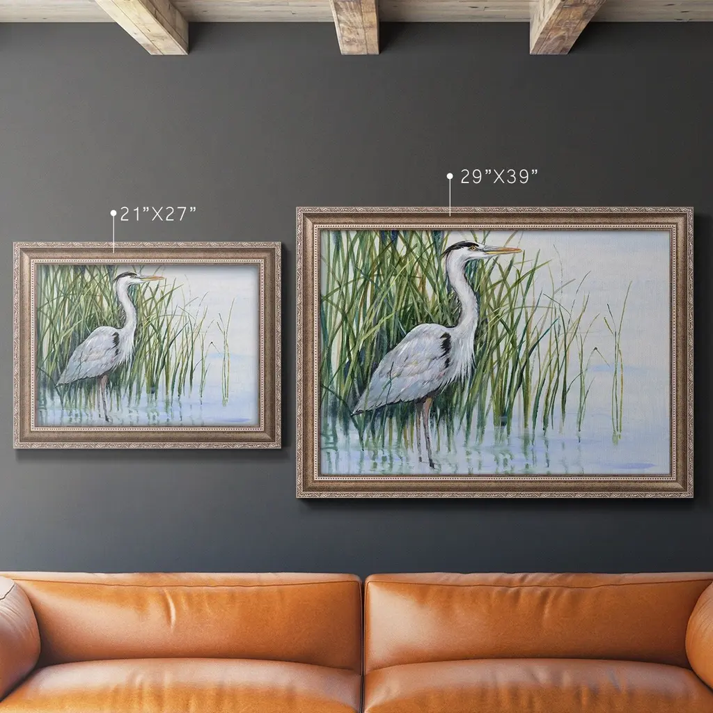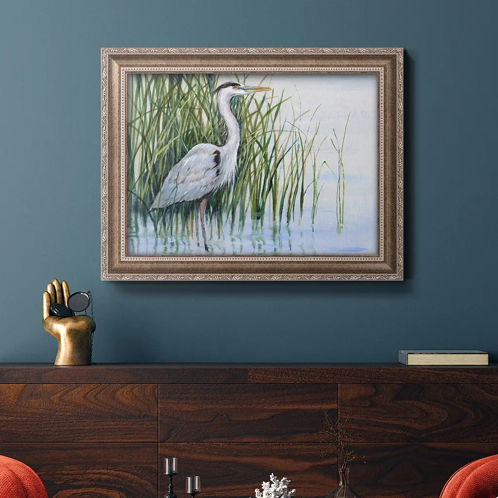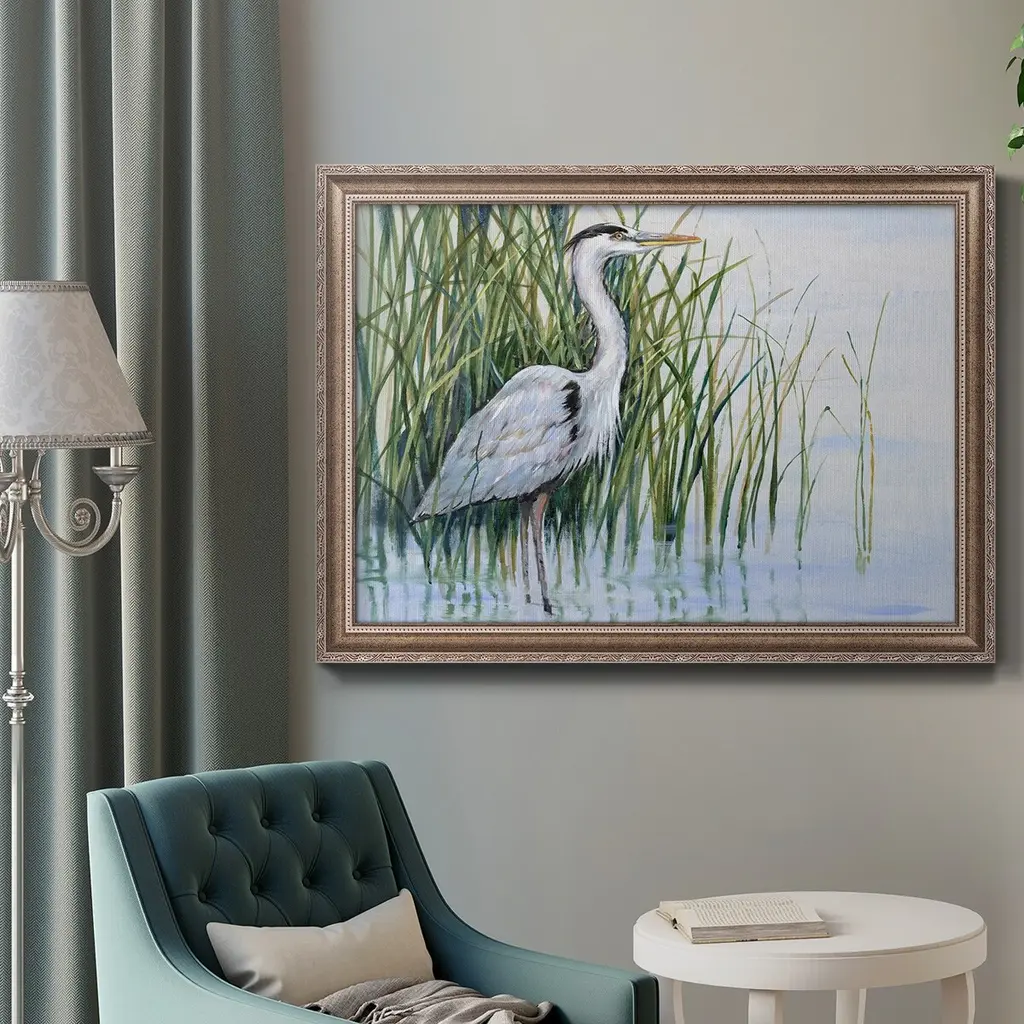 Heron in the Marsh I Premium Framed Canvas- Ready to Hang A Premium Framed Canvas created to last. Framed in distressed wood and available in an array of sizes and colors Featuring a beveled a solid wood stretcher bar, each piece comes ready to hand 3 SIZES AVAILABLE 16''X20'' - Overall Size 18'X27'' - Overall Size 24''x36'' - Overall Size Each piece is made to order. Each piece comes with hanging hardware. Made in the USA Ready to Hang Giclee Paper Print Acrylic Glass Beveled Matt Board