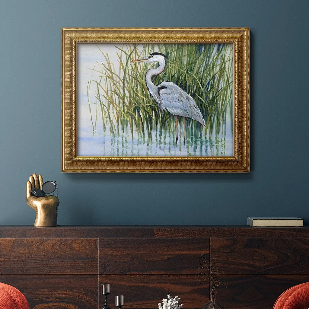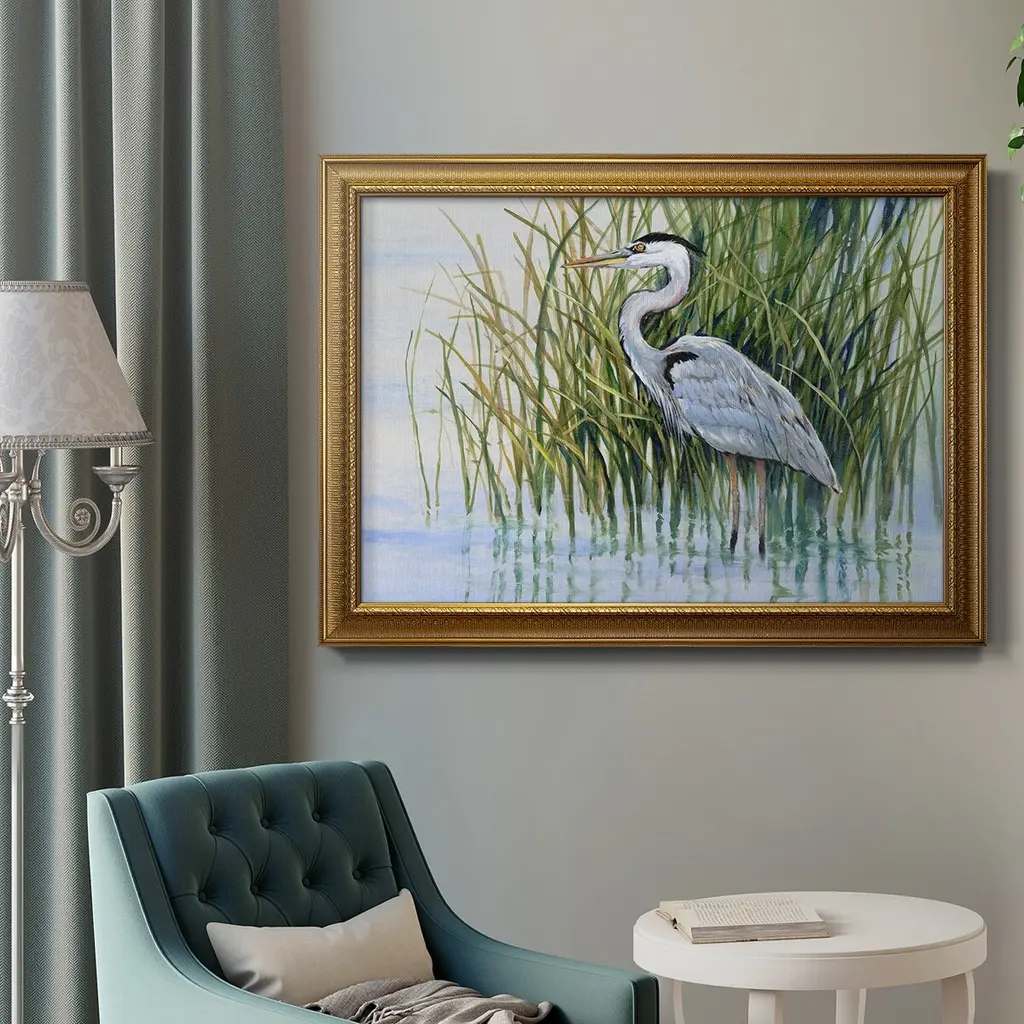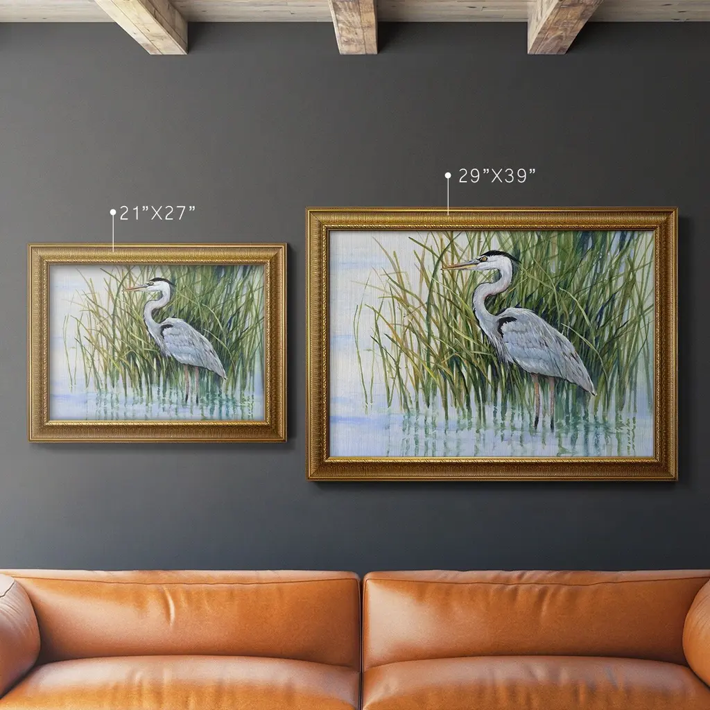 Heron in the Marsh II Premium Framed Canvas- Ready to Hang A Premium Framed Canvas created to last. Framed in distressed wood and available in an array of sizes and colors Featuring a beveled a solid wood stretcher bar, each piece comes ready to hand 3 SIZES AVAILABLE 16''X20'' - Overall Size 18'X27'' - Overall Size 24''x36'' - Overall Size Each piece is made to order. Each piece comes with hanging hardware. Made in the USA Ready to Hang Giclee Paper Print Acrylic Glass Beveled Matt Board