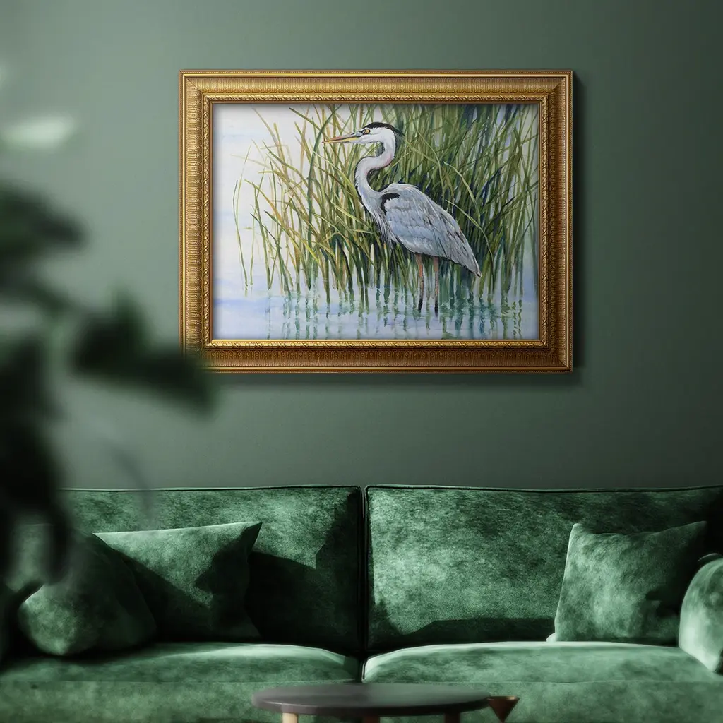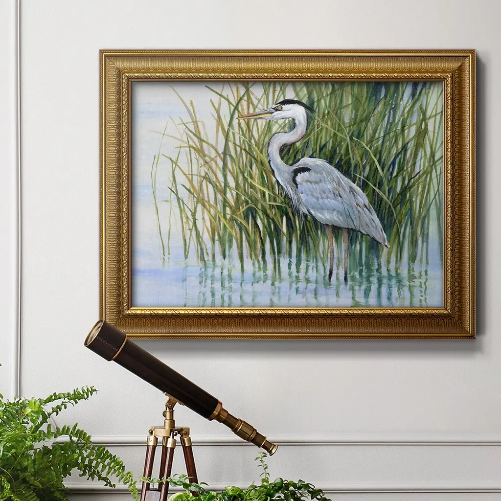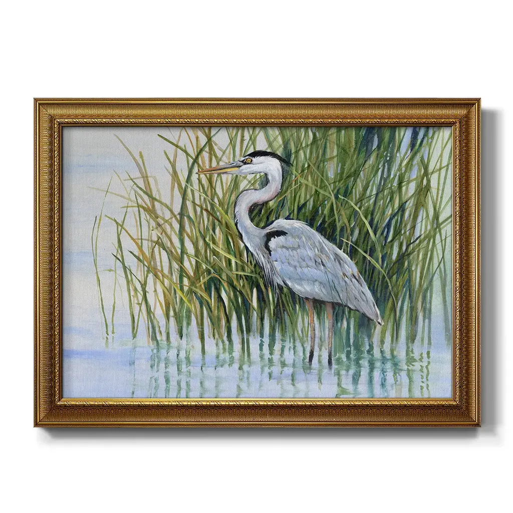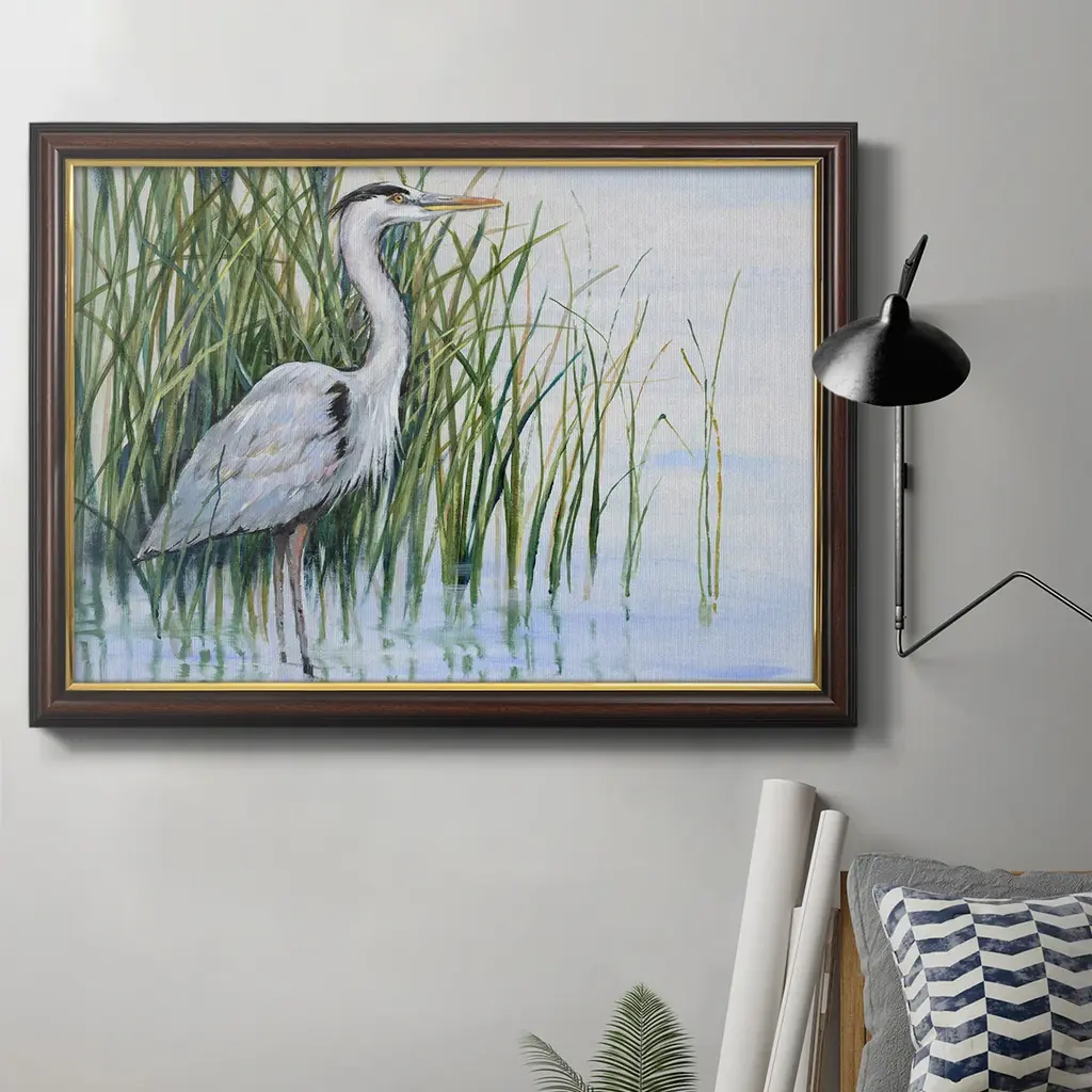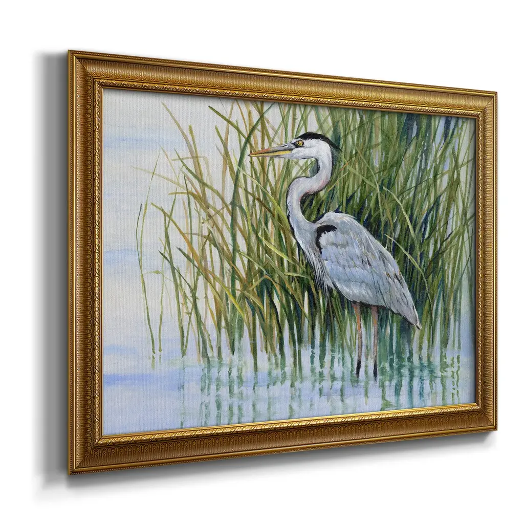 Heron in the Marsh II Premium Framed Canvas- Ready to Hang A Premium Framed Canvas created to last. Framed in distressed wood and available in an array of sizes and colors Featuring a beveled a solid wood stretcher bar, each piece comes ready to hand 3 SIZES AVAILABLE 16''X20'' - Overall Size 18'X27'' - Overall Size 24''x36'' - Overall Size Each piece is made to order. Each piece comes with hanging hardware. Made in the USA Ready to Hang Giclee Paper Print Acrylic Glass Beveled Matt Board