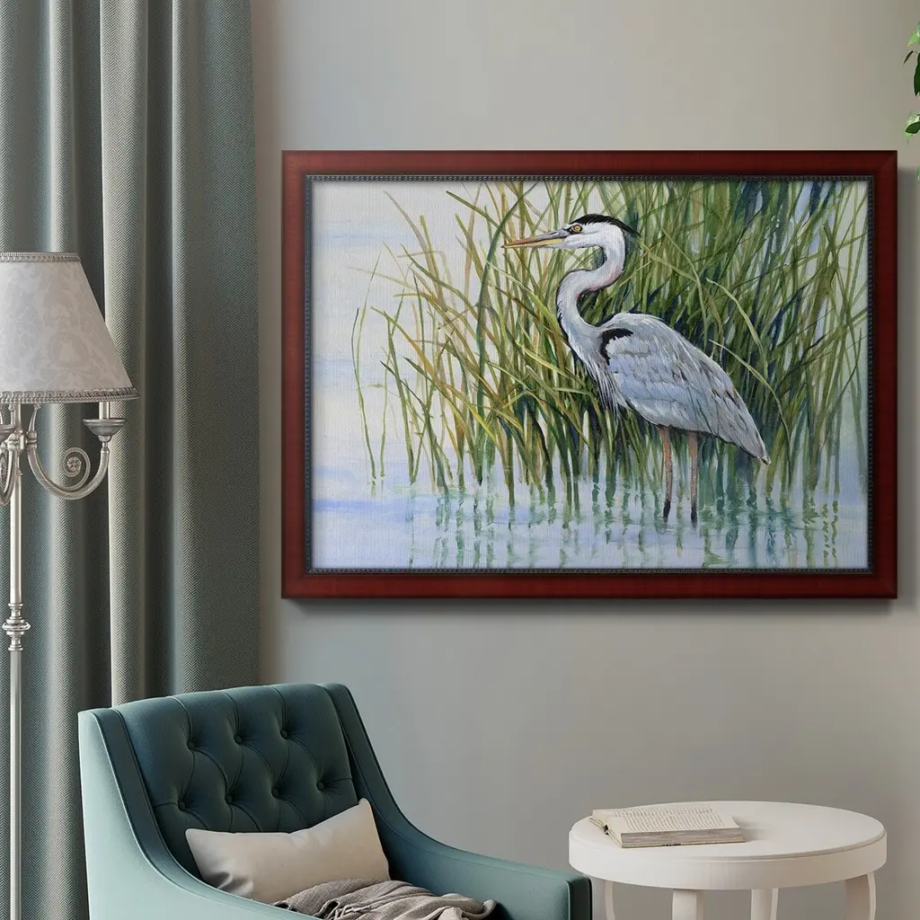 Heron in the Marsh II Premium Framed Canvas- Ready to Hang A Premium Framed Canvas created to last. Framed in distressed wood and available in an array of sizes and colors Featuring a beveled a solid wood stretcher bar, each piece comes ready to hand 3 SIZES AVAILABLE 16''X20'' - Overall Size 18'X27'' - Overall Size 24''x36'' - Overall Size Each piece is made to order. Each piece comes with hanging hardware. Made in the USA Ready to Hang Giclee Paper Print Acrylic Glass Beveled Matt Board