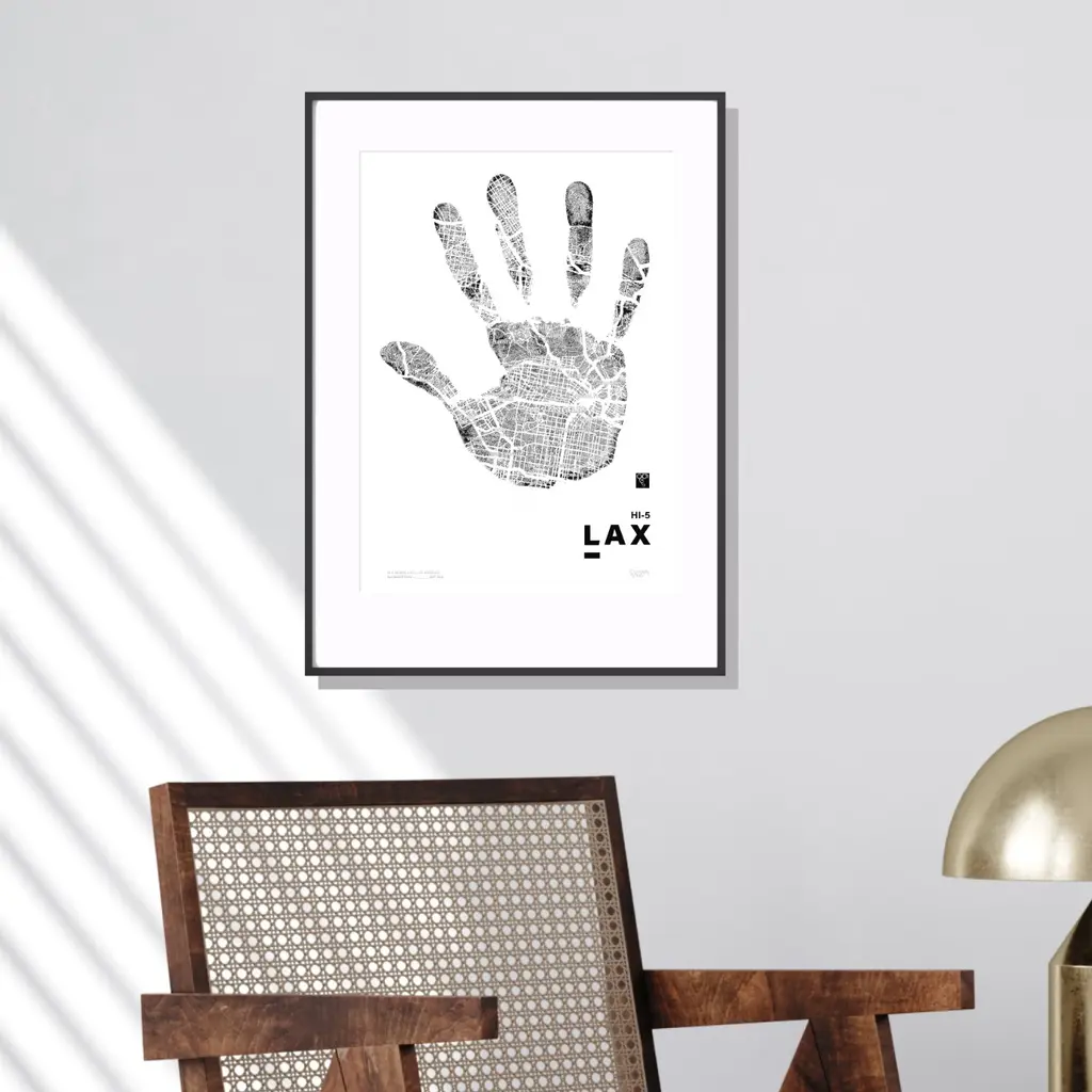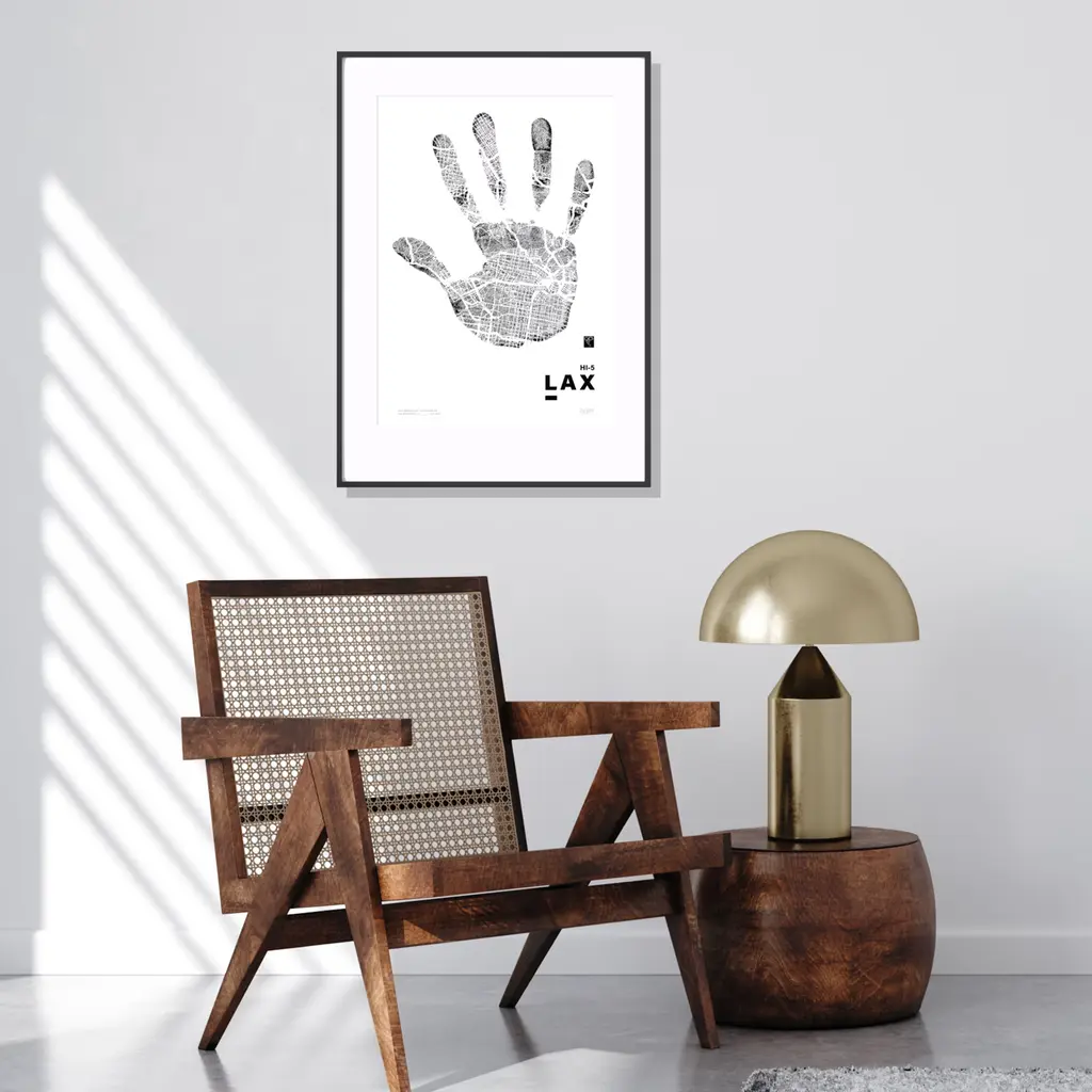 A high-five to the City of Angels. Part of the Hi-Five Series, this Limited Edition Print features a full handprint filled with the iconic street grid of Los Angeles — sprawling, sun-soaked, and full of layered stories.From the hills of Hollywood to the boardwalks of Venice, Hi-5 Lax captures the energy, creativity, and contrasts that define LA. A tribute to dreamers, makers, and the magnetic pull of a city built on reinvention — all held in the palm of a hand.What can you see?1st Edition of 100
