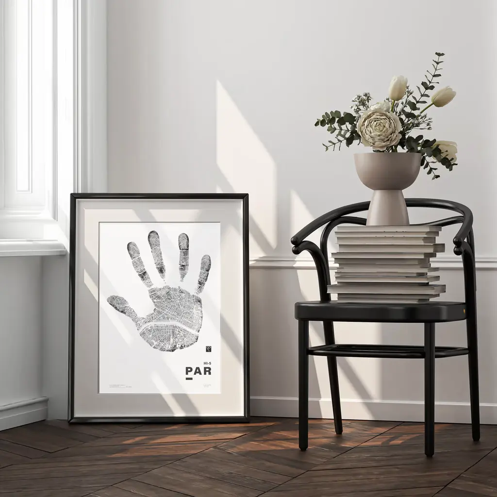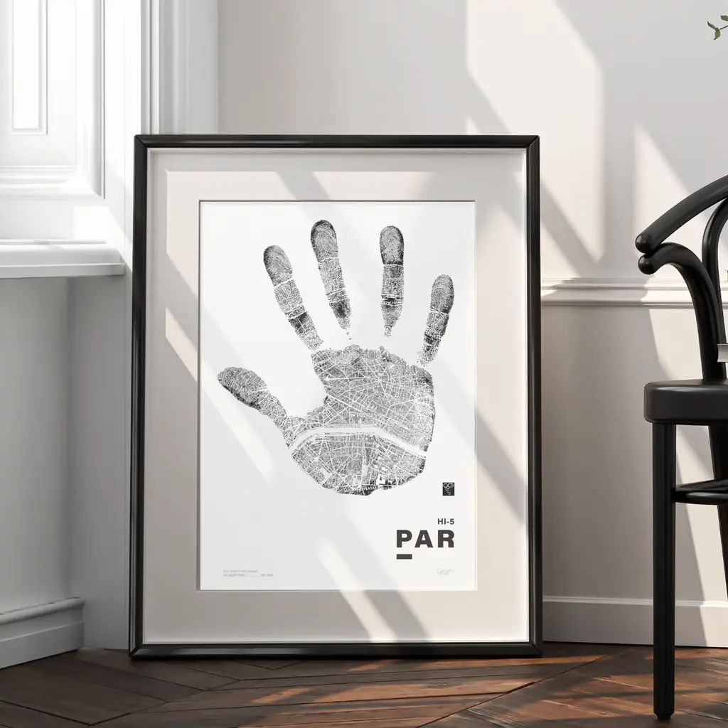 A high-five to the City of Light. Part of the Hi-Five Series, this Limited-Edition Print features a full handprint intricately filled with Paris's winding street map lines—a city known for its elegance, charm, and quiet layers of history.From the grandeur of the Champs-Élysées to the literary soul of Saint-Germain, Hi-5 Par captures the romance and rhythm of Paris in the palm of a hand. It is a celebration of beauty, culture, and everyday magic woven through its iconic streets.What can you see?Limited 1st Edition of 100