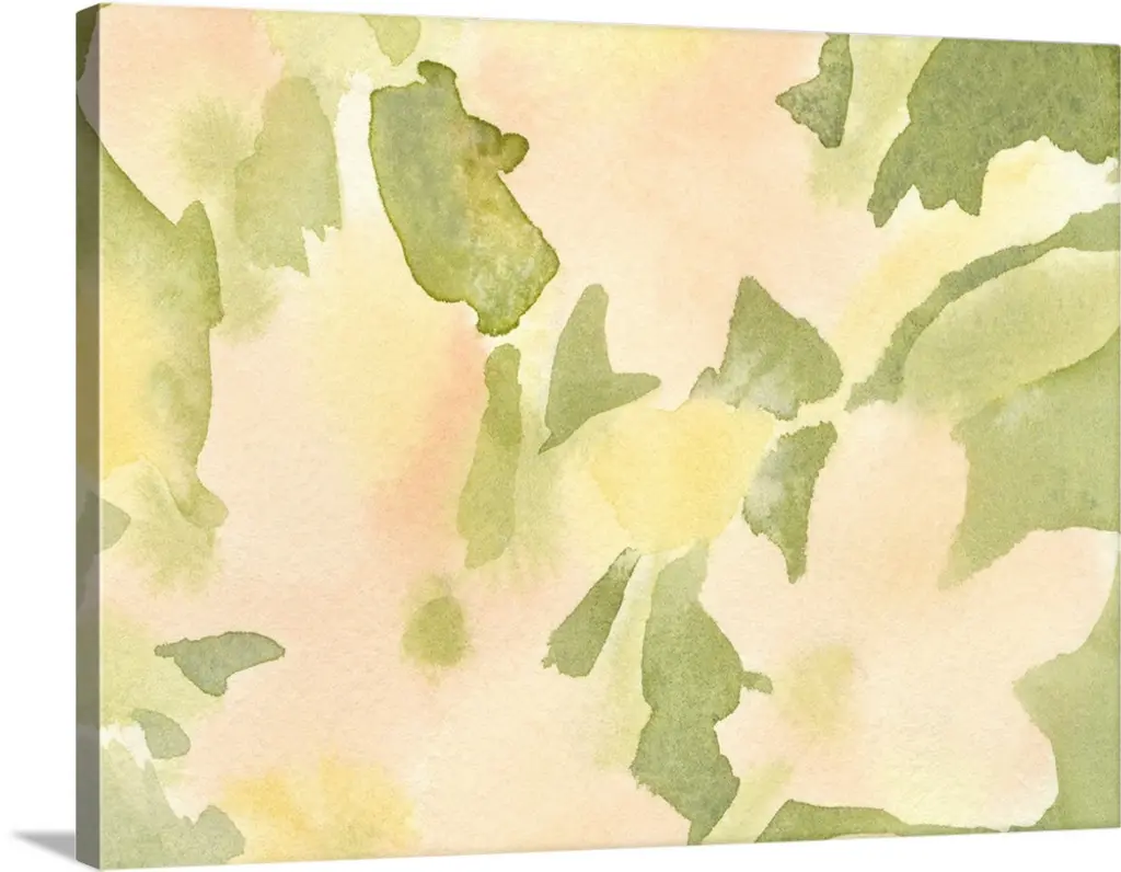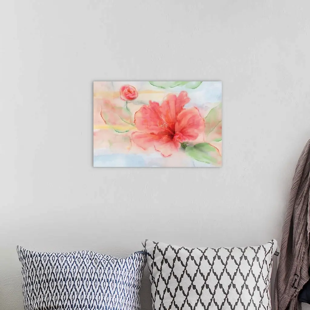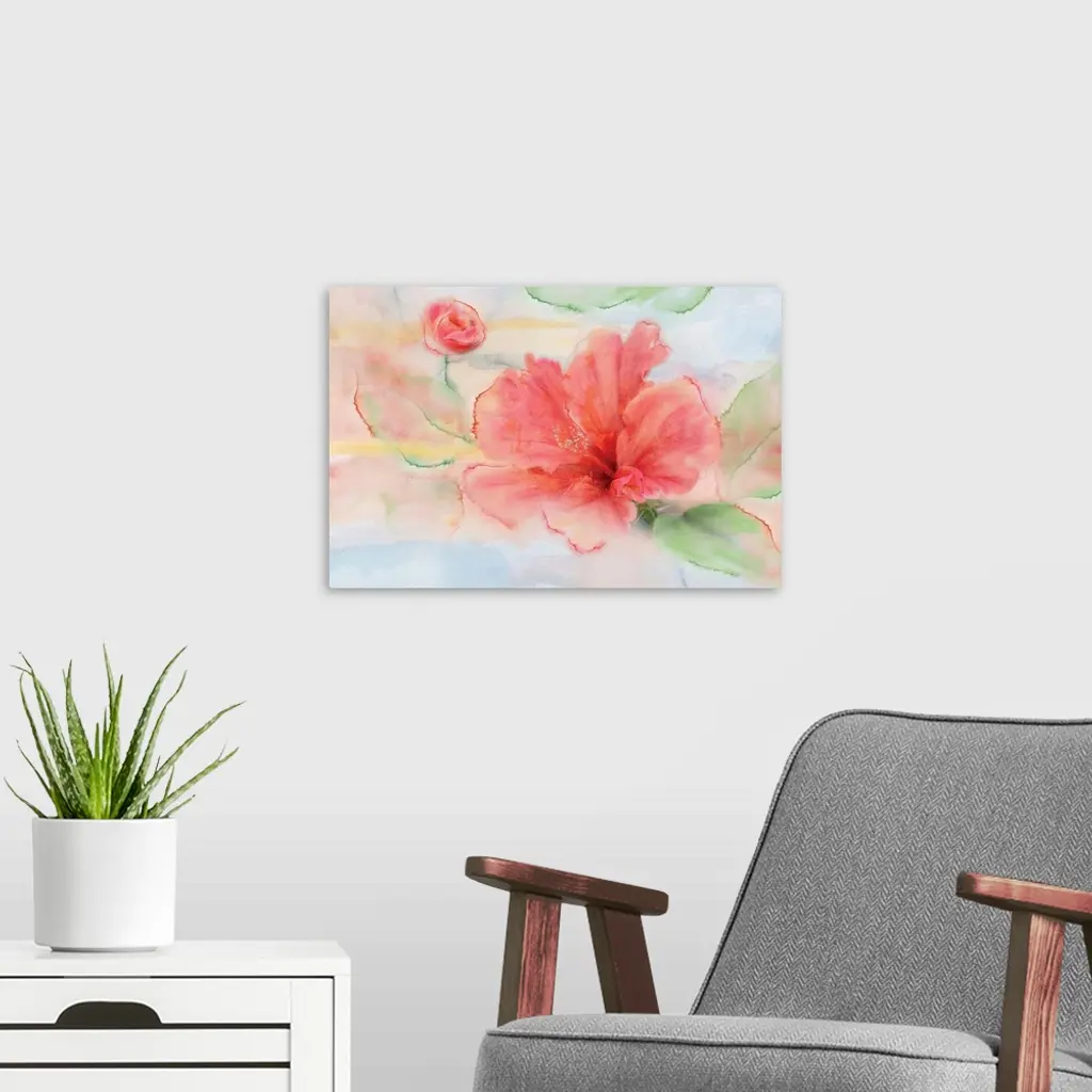 Contemporary watercolor painting of a pink hibiscus flower with green leaves on a background that has hints of blue, yellow, and pink.