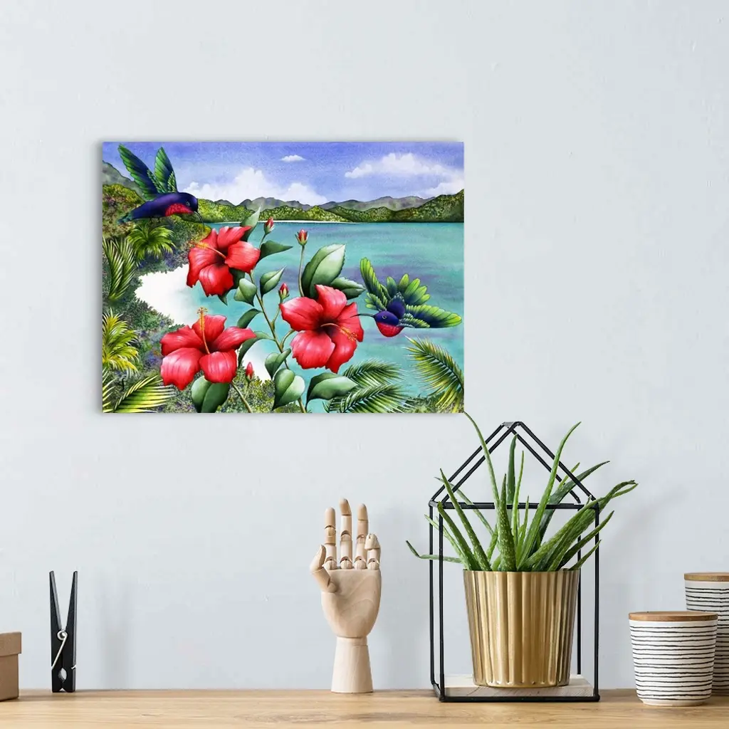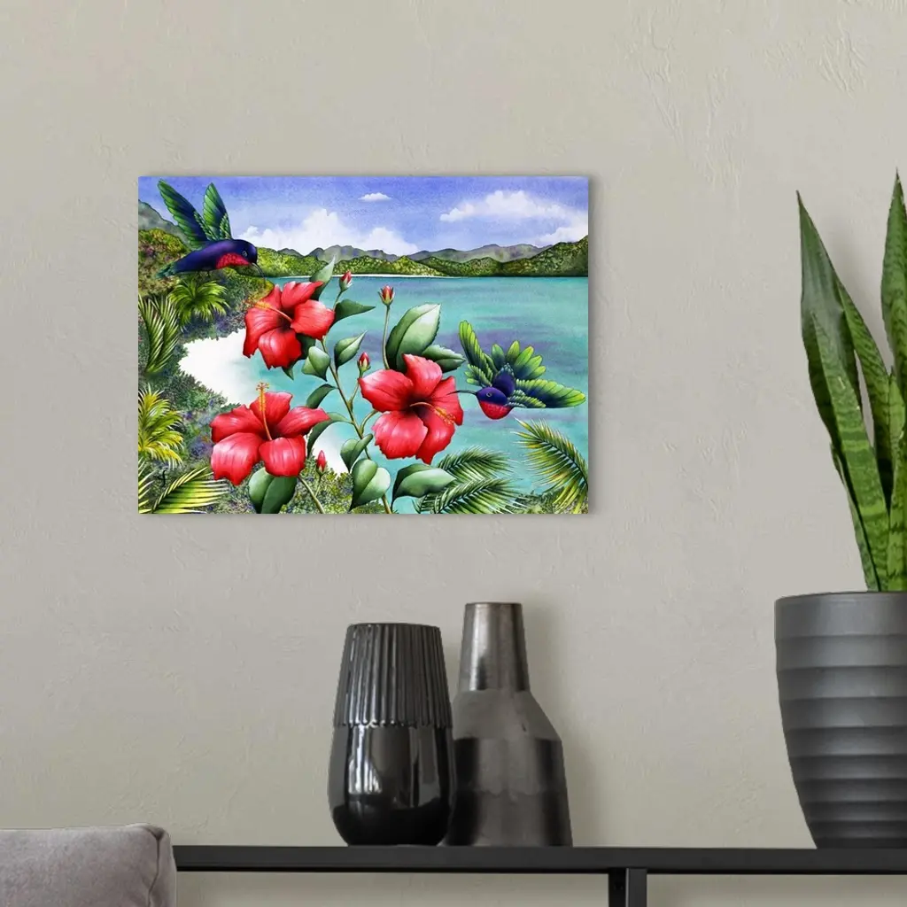 Tropical themed artwork using bright vivid colors to depict the flowers and animals of the environment.