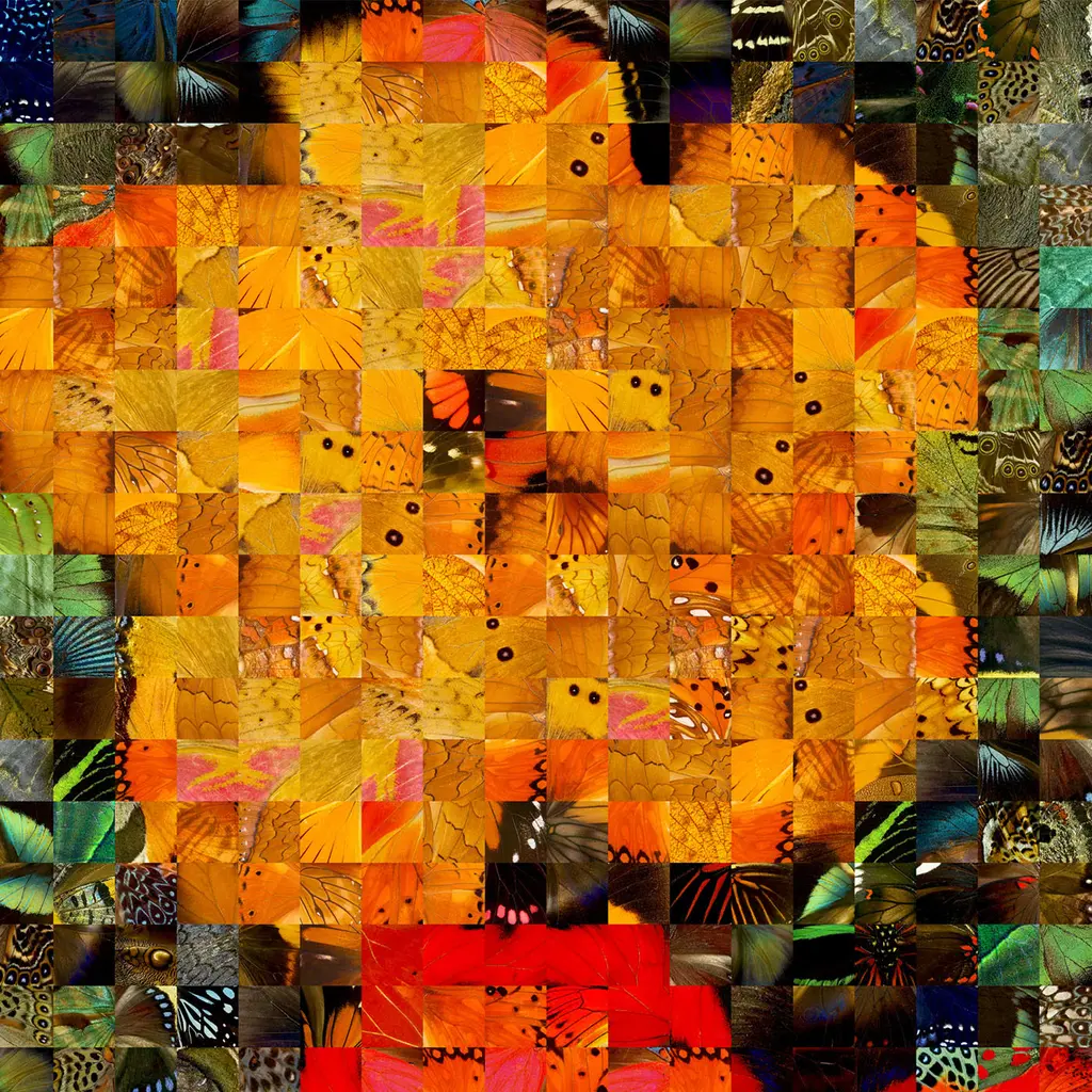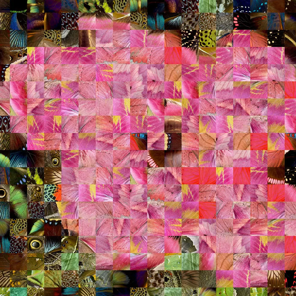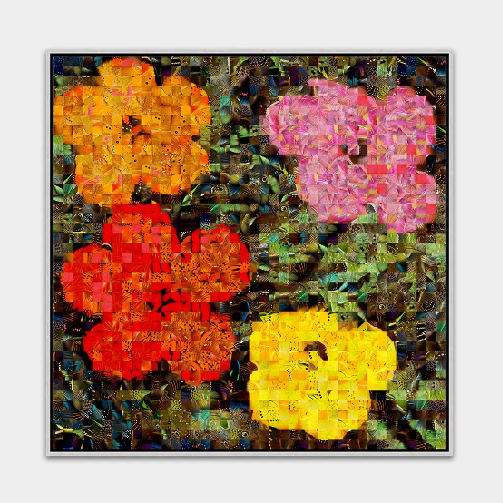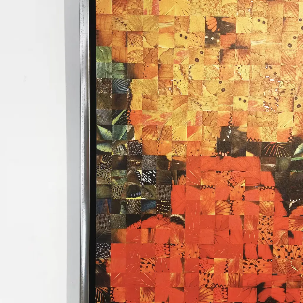 Hibiscus N.1 is composed of 1600 photographic tiles of butterfly wings details that have been used to elaborate this work provided with a double certificate of authenticity and uniqueness countersigned by the artist and blockchain registered. The work can be ordered with a handcrafted wood frame. | Revisiting Andy Warhol’s Flowers, 2019, metal sublimation print, chromaluxe HD aluminum, 80×80 cm, ed. of 3. Please ask the Concierge service for further information