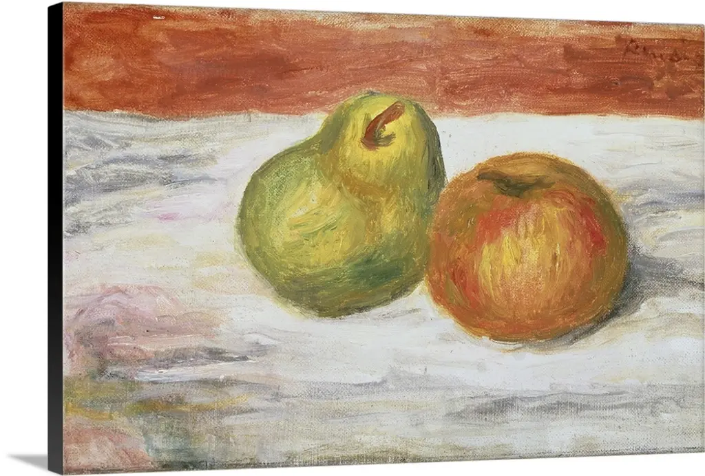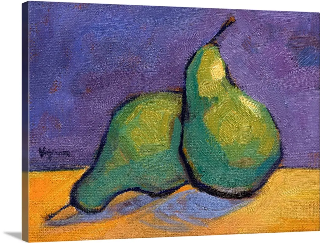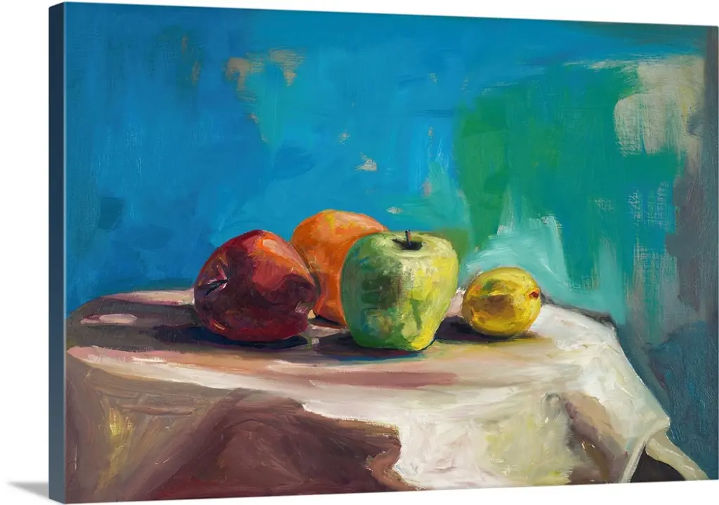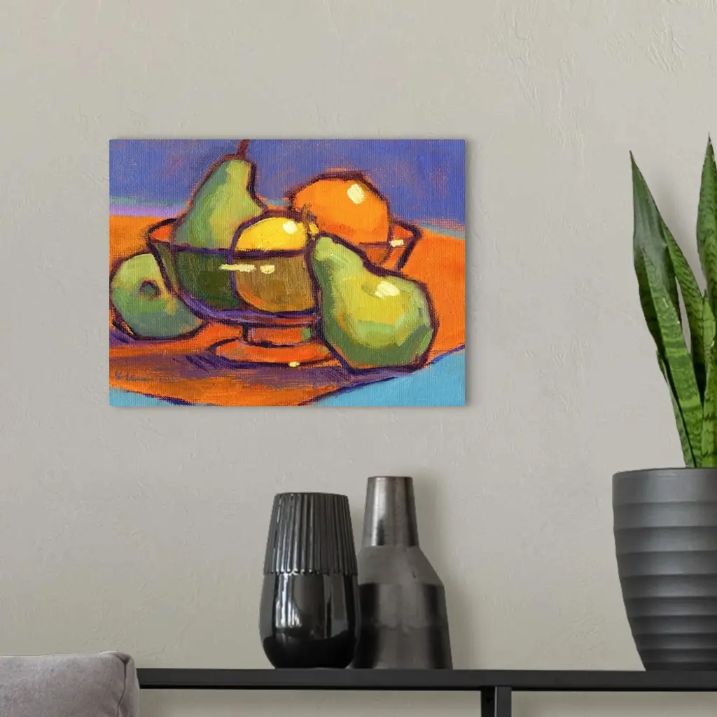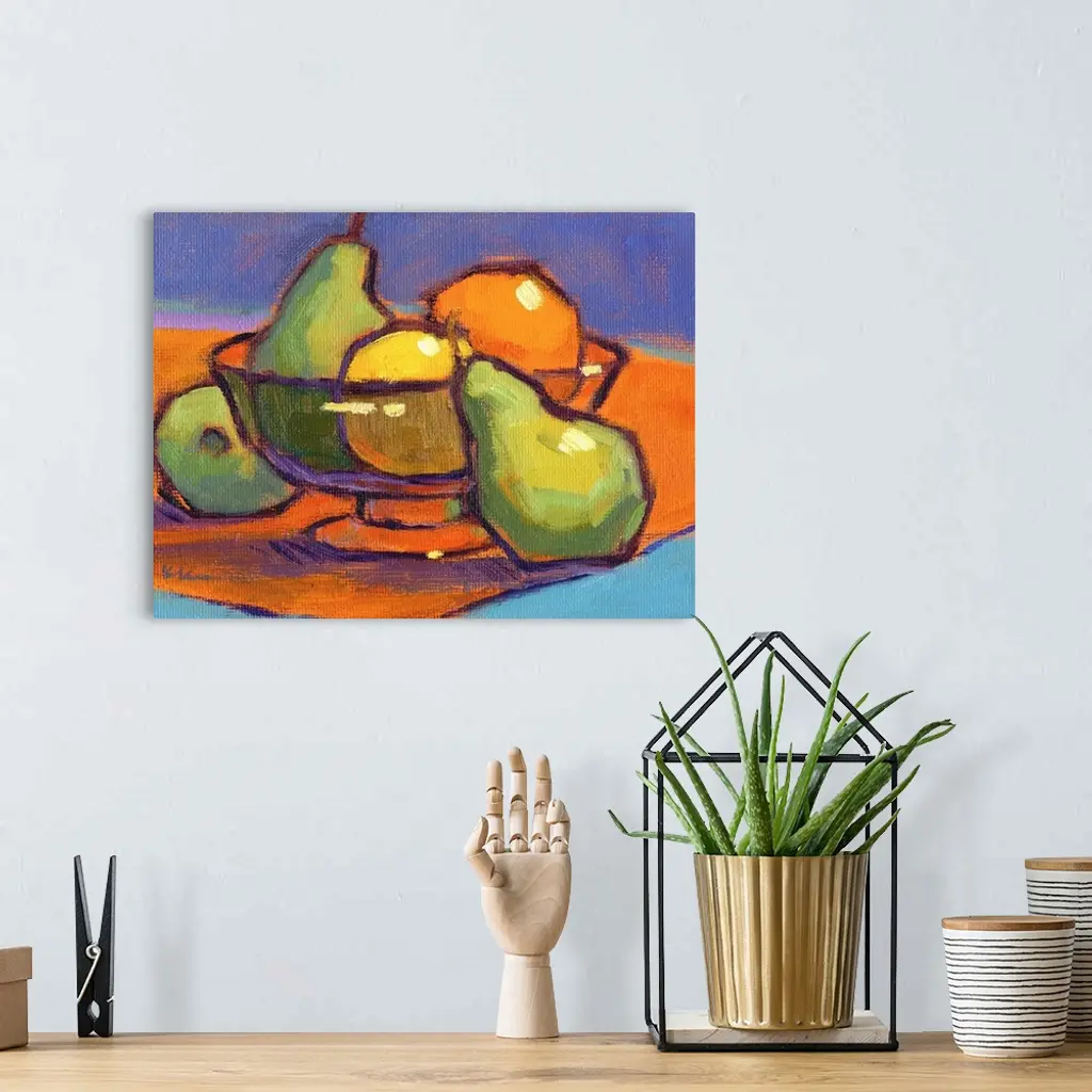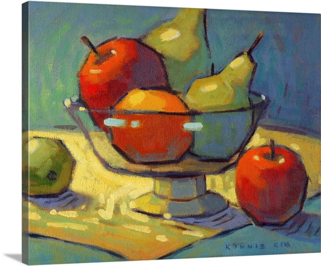A contemporary abstract painting of a bowl of fruit in vibrant colors.