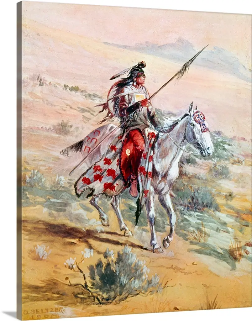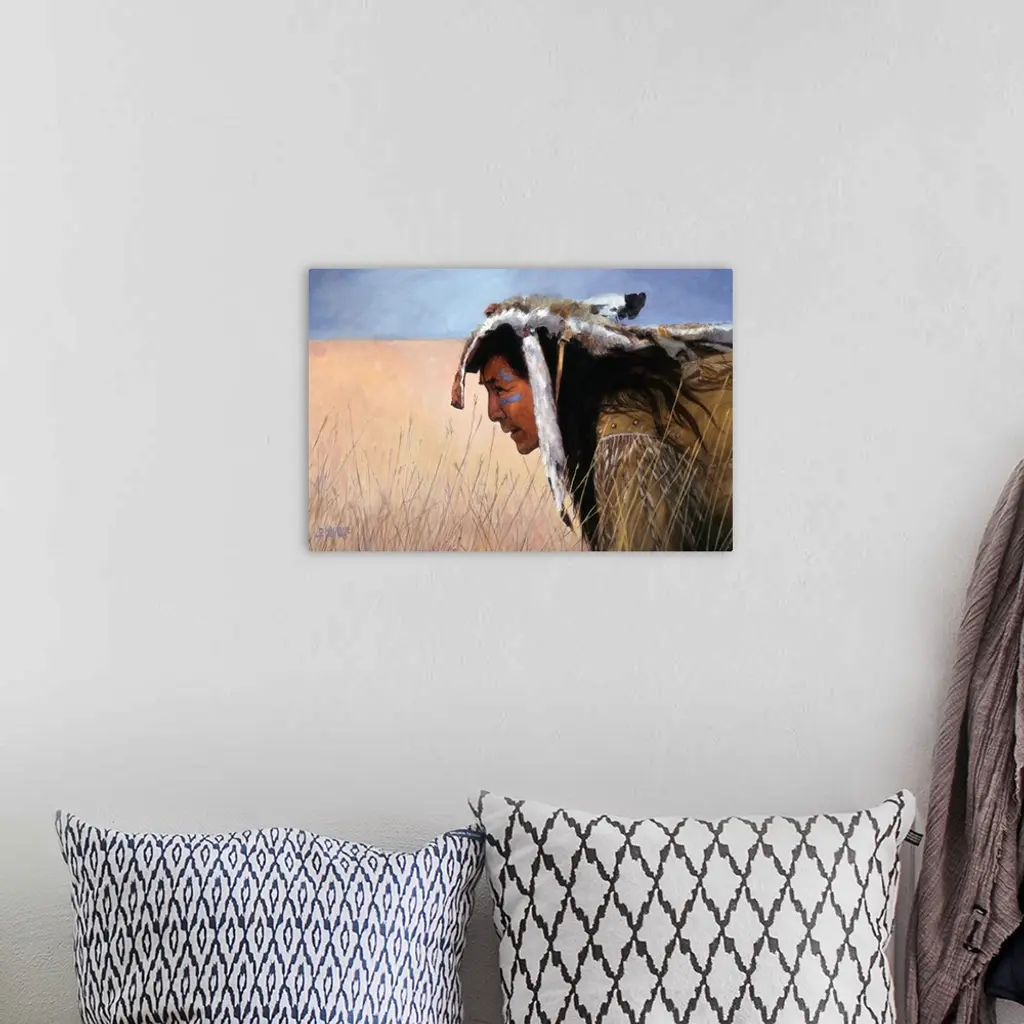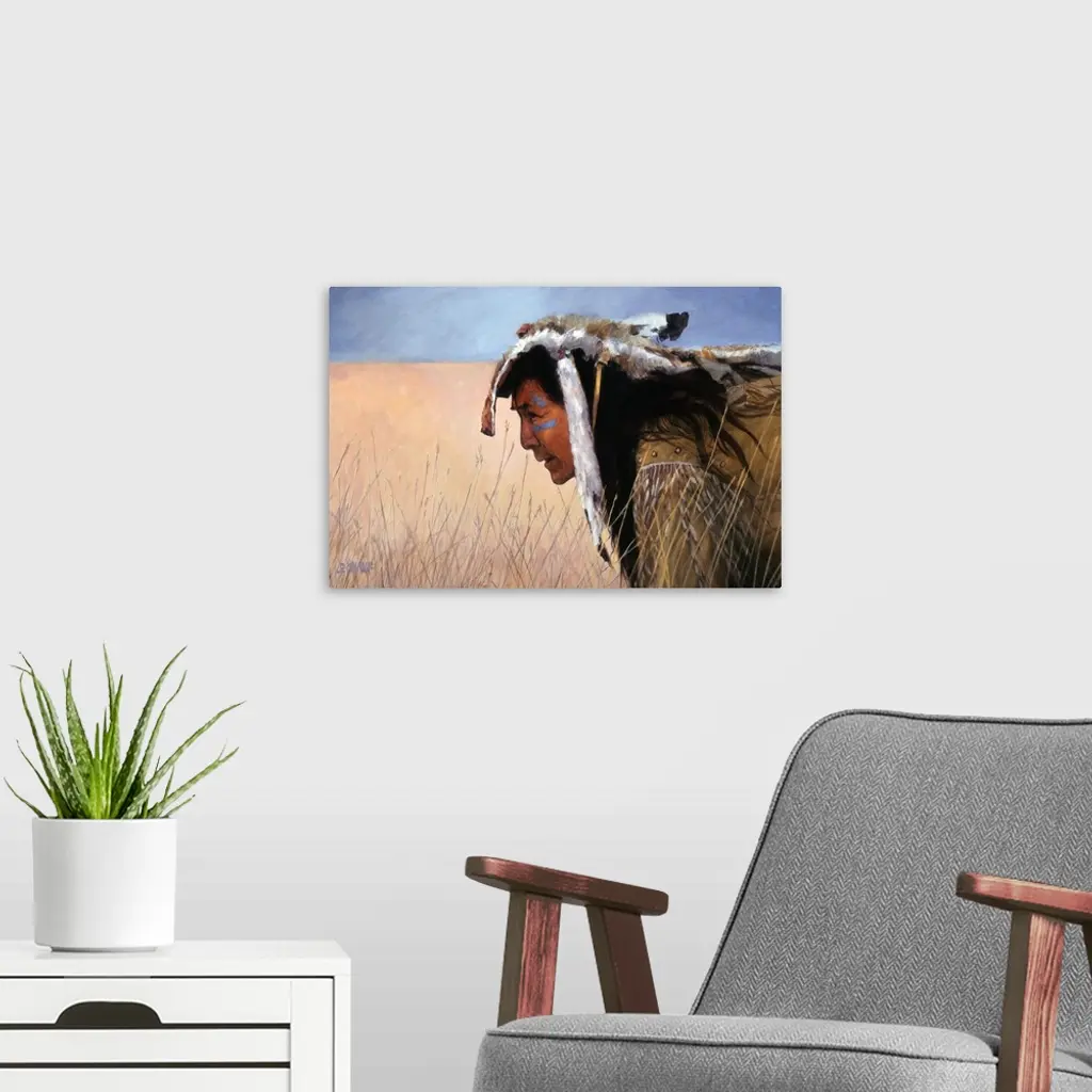 Contemporary western theme painting of a native American man kneeling in tall grass on the plains.
