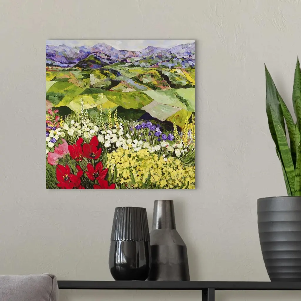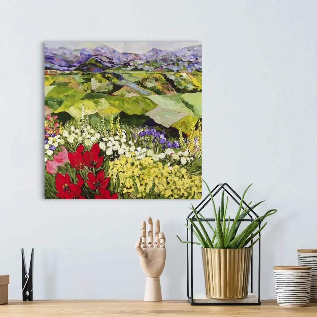 Contemporary painting of a country landscape with lots of colorful flowers and fields of growing crops.
