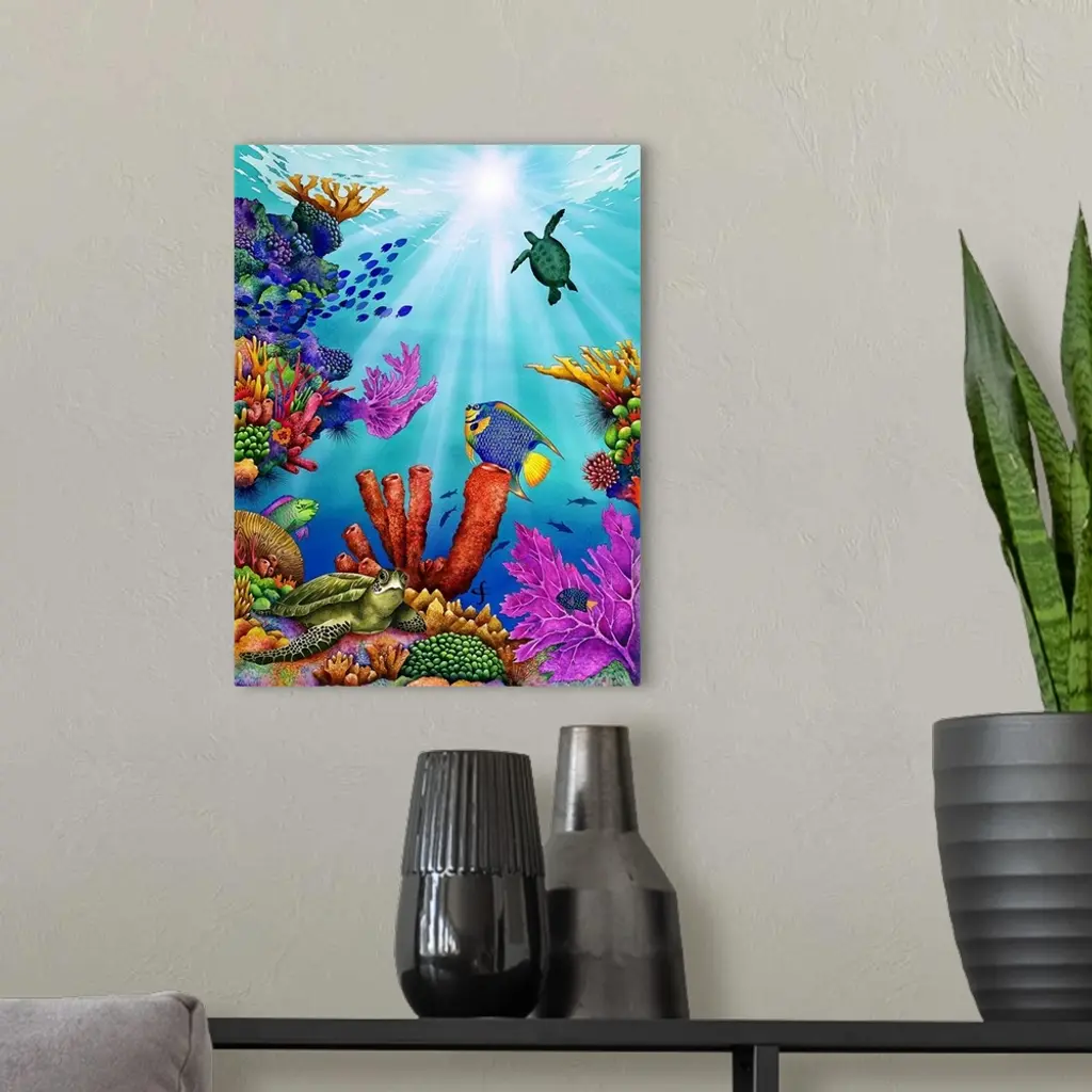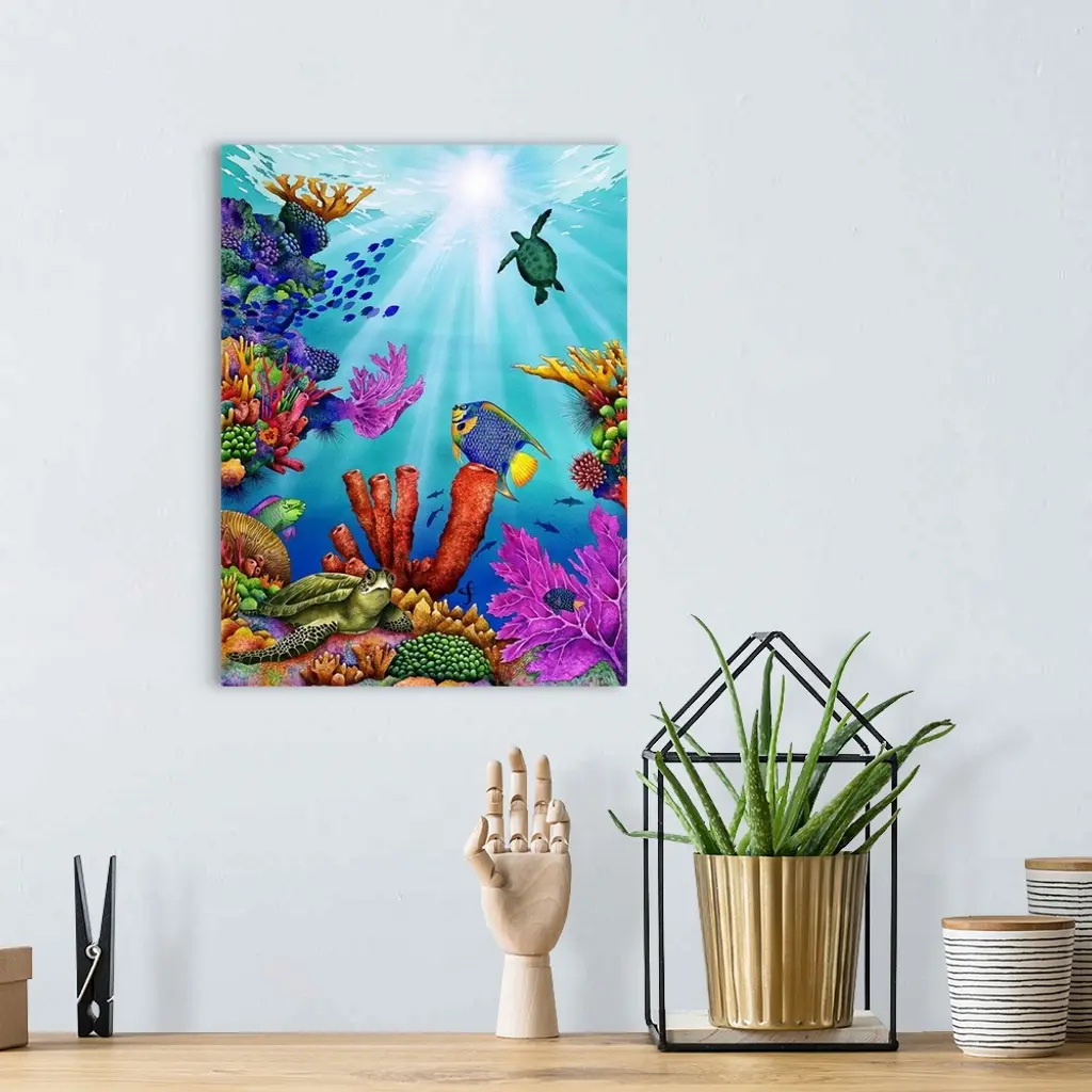 Contemporary tropical themed artwork with use of bright and vibrant colors.
